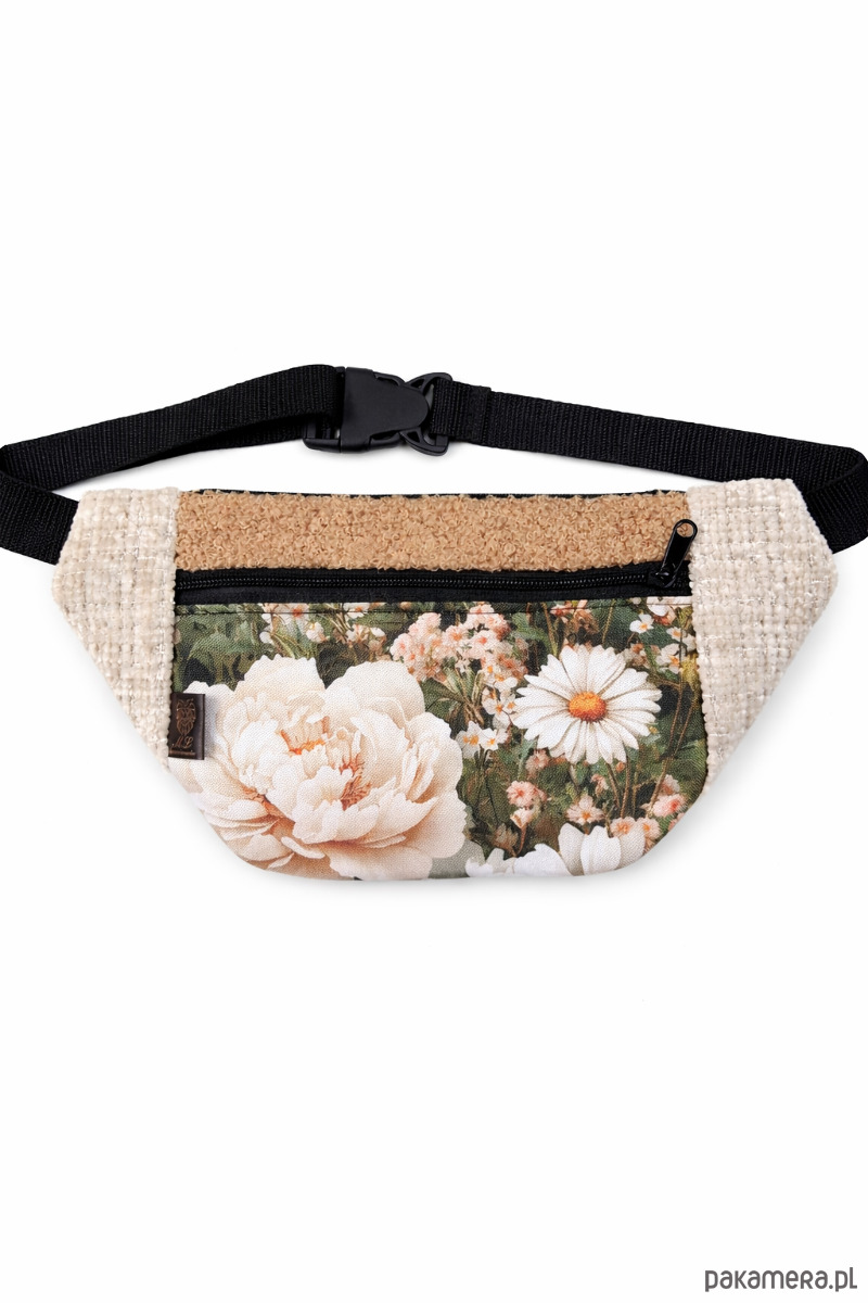 Nerka w stylu boho, wykonana z przyjemnej w dotyku tkaniny o kremowo-zielonym, kwiatowym wzorze inspirowanym naturą. Przód zdobi motyw dużych kwiatów, a górna część wykończona jest jasnym, miękkim materiałem typu boucle. Zapinana na zamek, z regulowanym paskiem, który pozwala nosić ją zarówno na biodrach, jak i przez ramię.