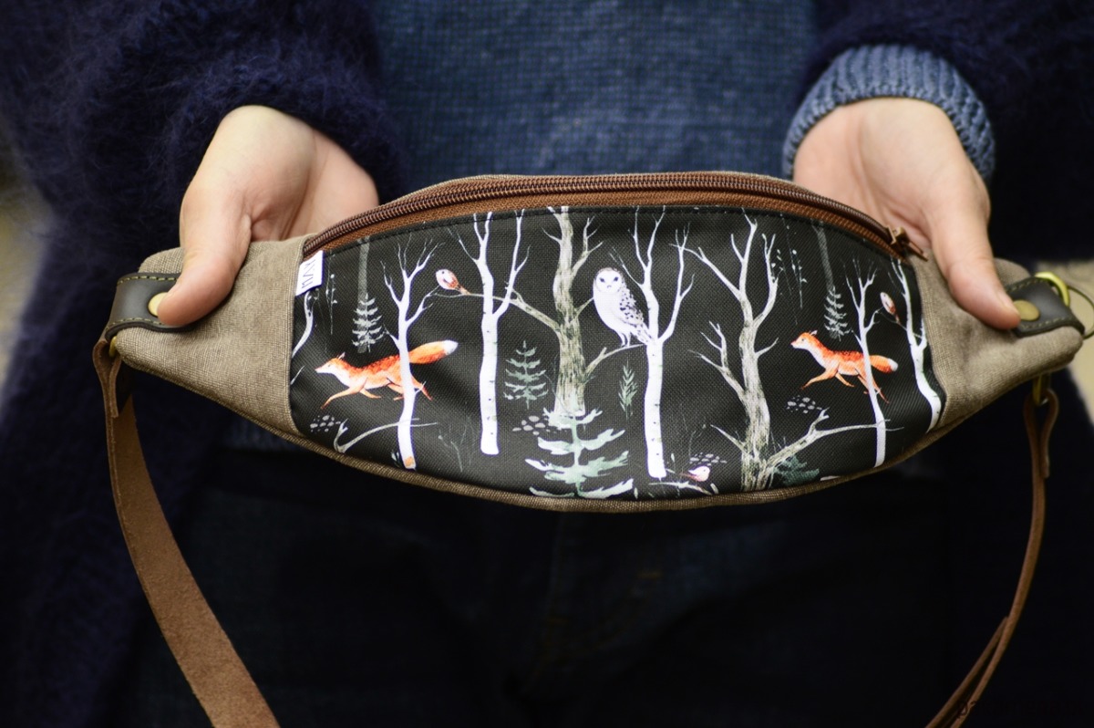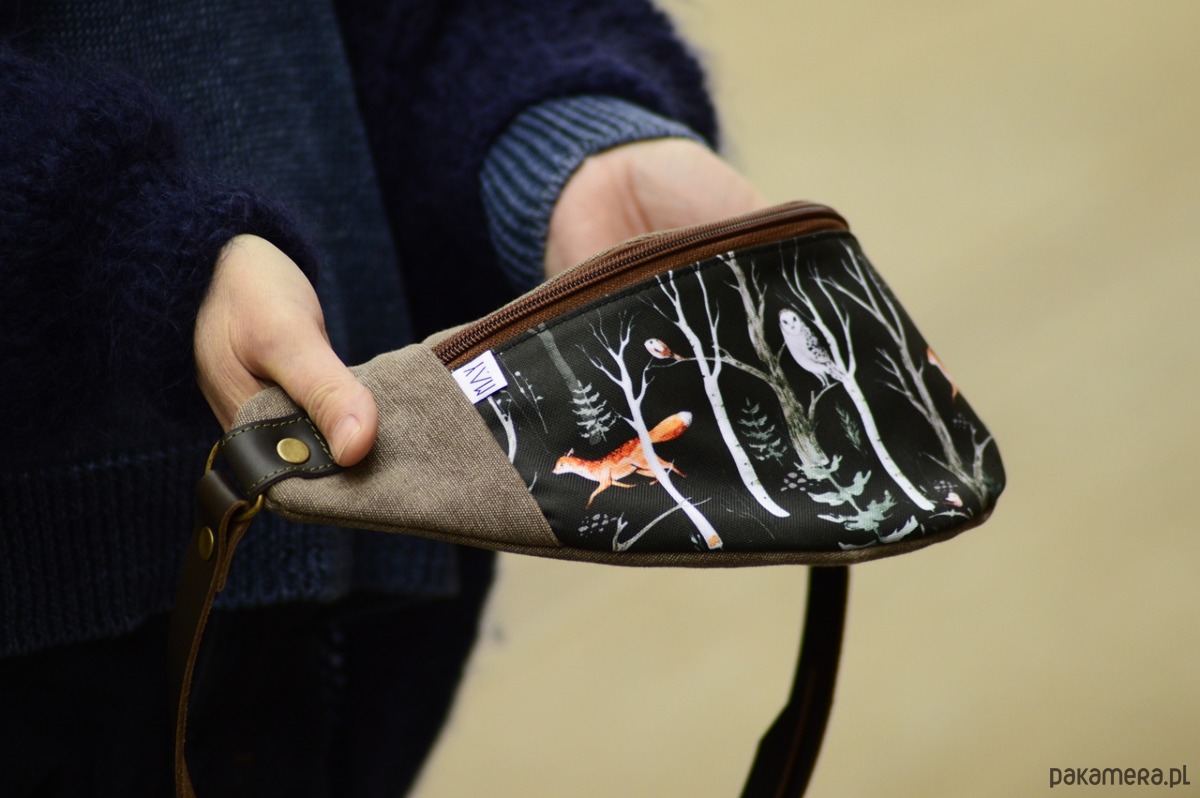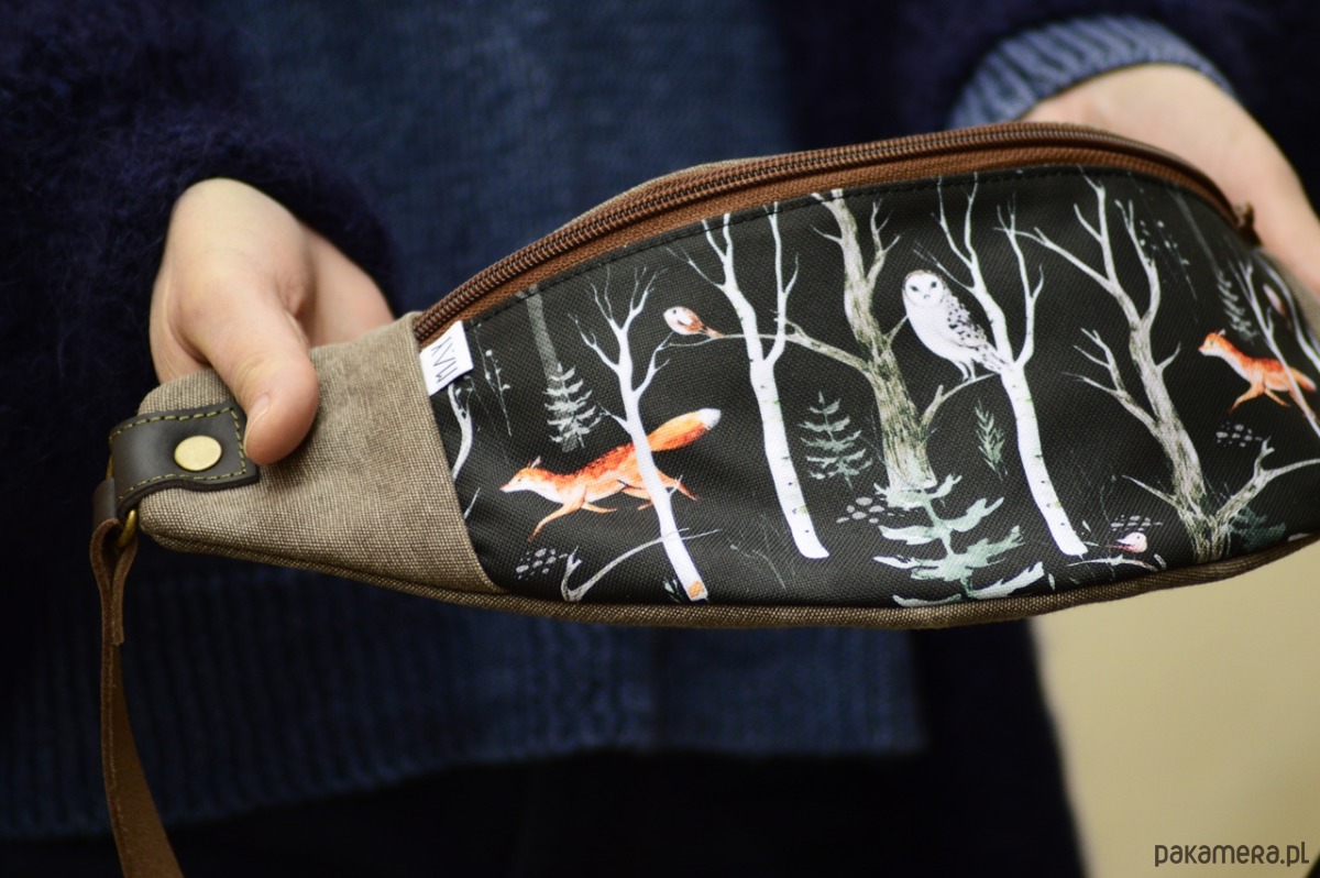Nerka dużych rozmiarów ( spokojnie pomieści duży telefon i średniej wielkości portfel) powstała z tkaniny poliestrowej( przód) oraz dżinsu dodatkowo wzmocnionych tkaniną wodoodporną. Wewnątrz znajduje się bawełniana podszewka z małą kieszonką na suwak. Pasek wykonany jest ze skóry naturalnej, zapina się na karabińczyk oraz posiada regulację na klamrę.