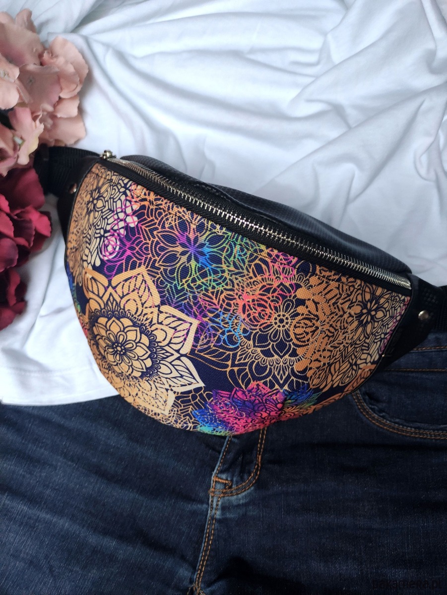 Nerka wykonana z ekoskóry oraz tkaniny wodoodpornej w piękny wzór mandali. Posiada zamek metalowy. W środku podszewka z czarnej tkaniny wodoodpornej.