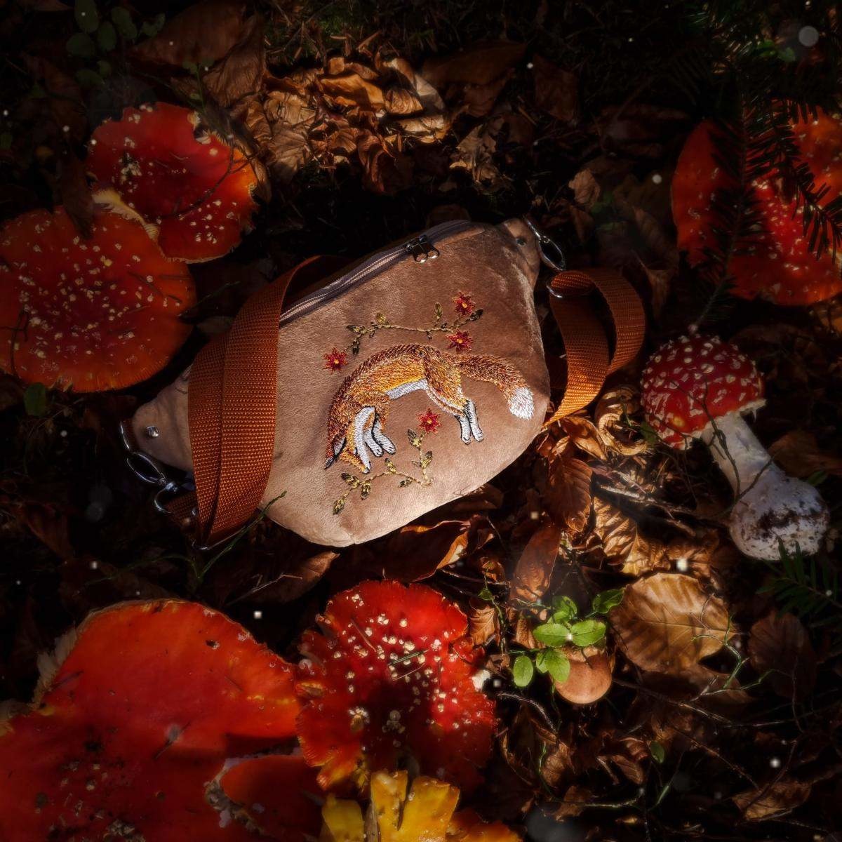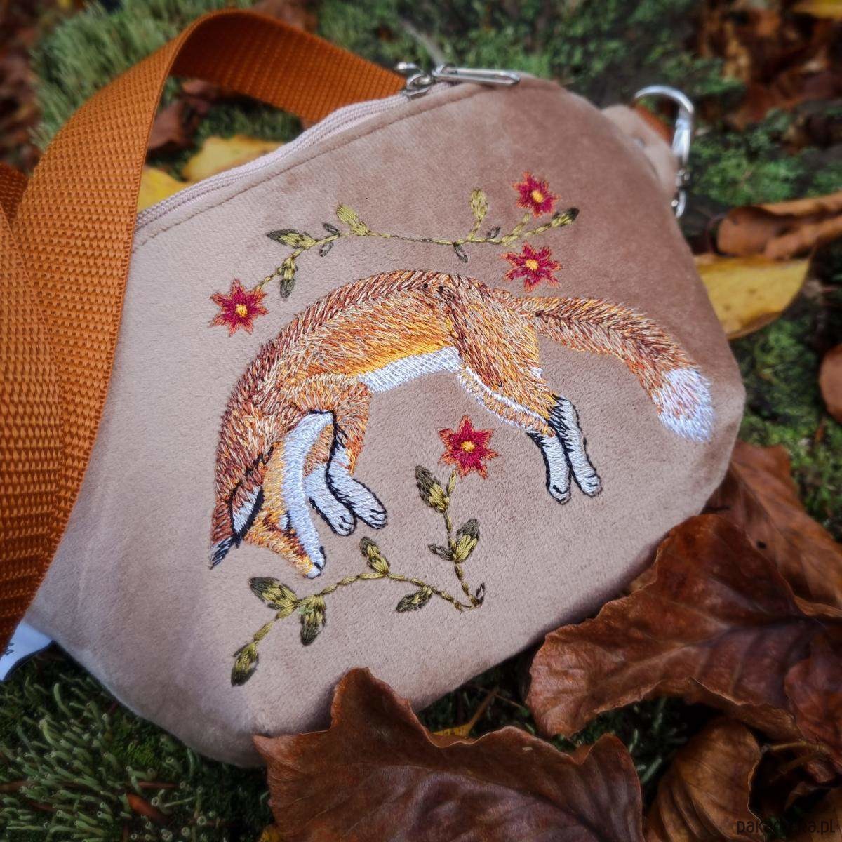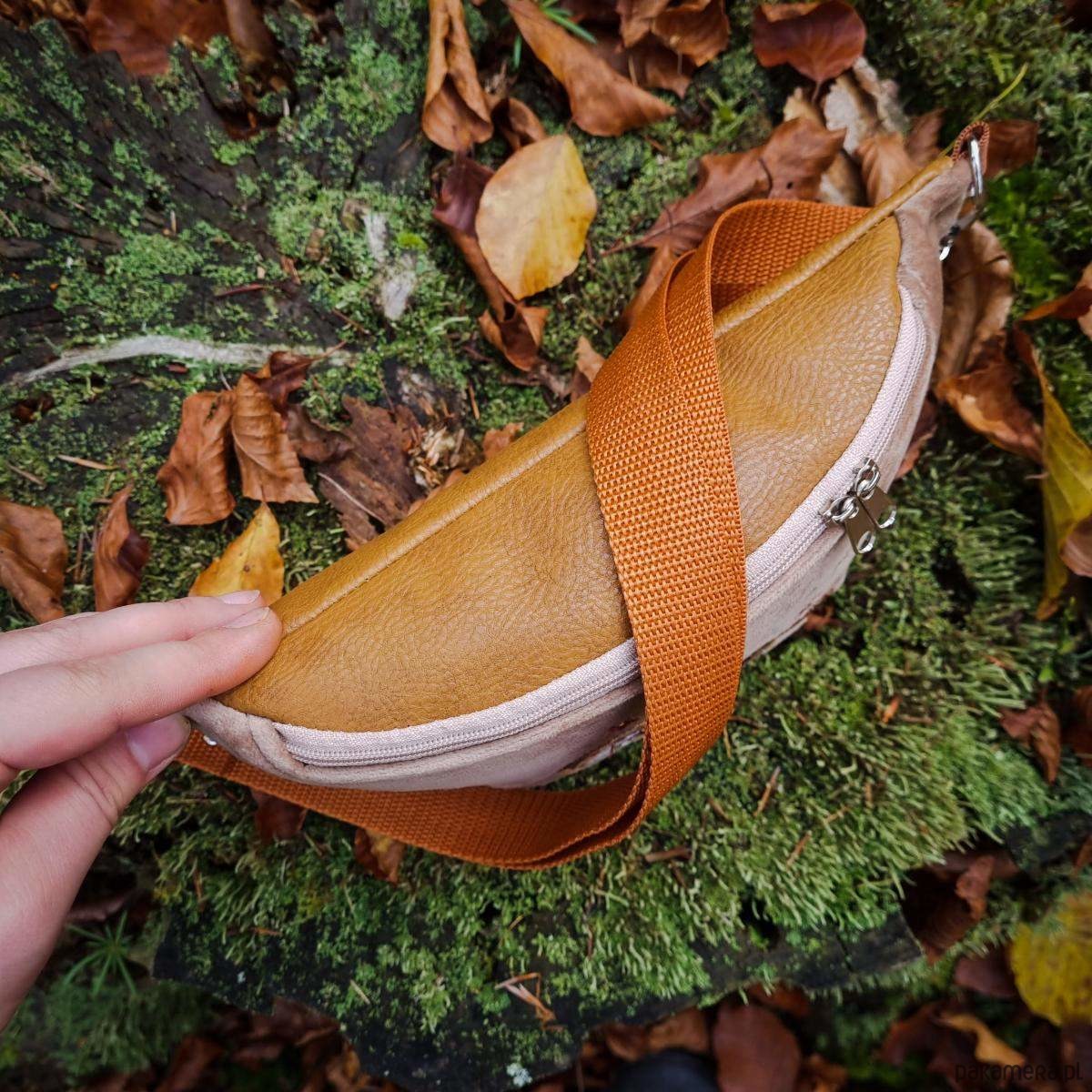 - nerka uszyta z beżowego aksamitu (przód nerki), eko skóry miodowej (tył i klapa nerki) oraz bawełny (podszewka w środku)