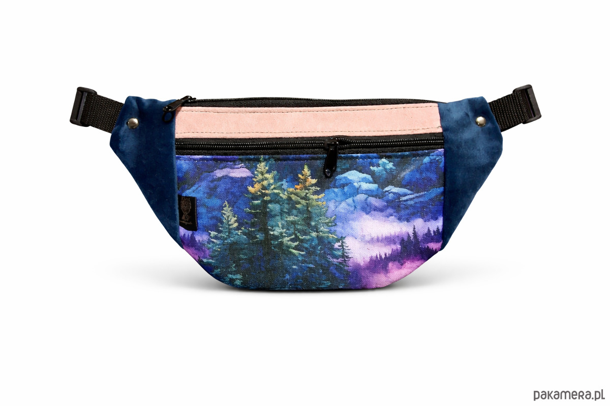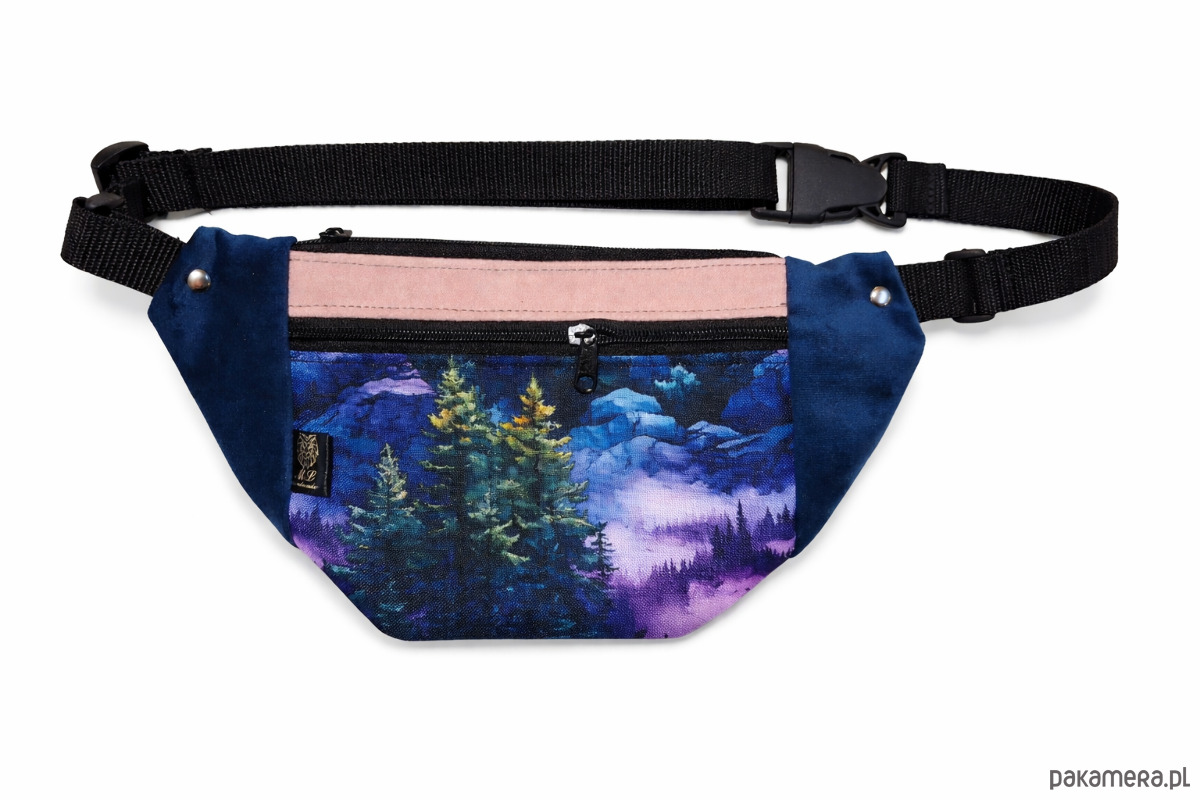 Stylowa nerka / saszetka biodrowa z wyjątkowym nadrukiem przedstawiającym nocny las i górski krajobraz.