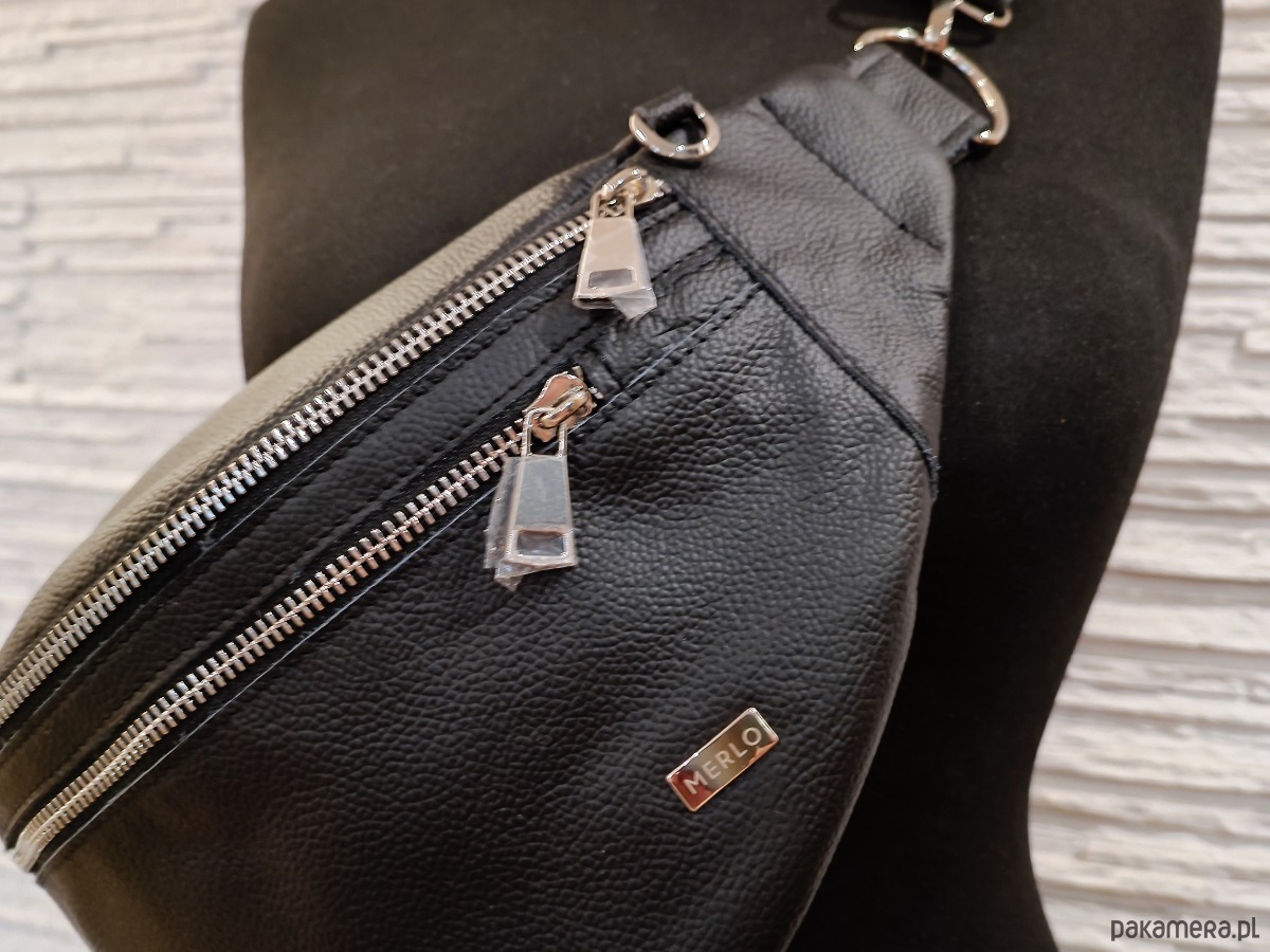 Z tyłu plecaka znajduje się kieszonka na zamek. Nerka XXL w całości wykonana jest ze skóry.