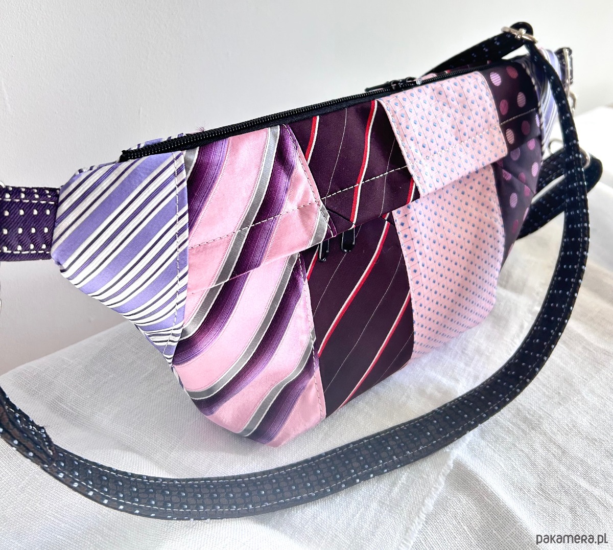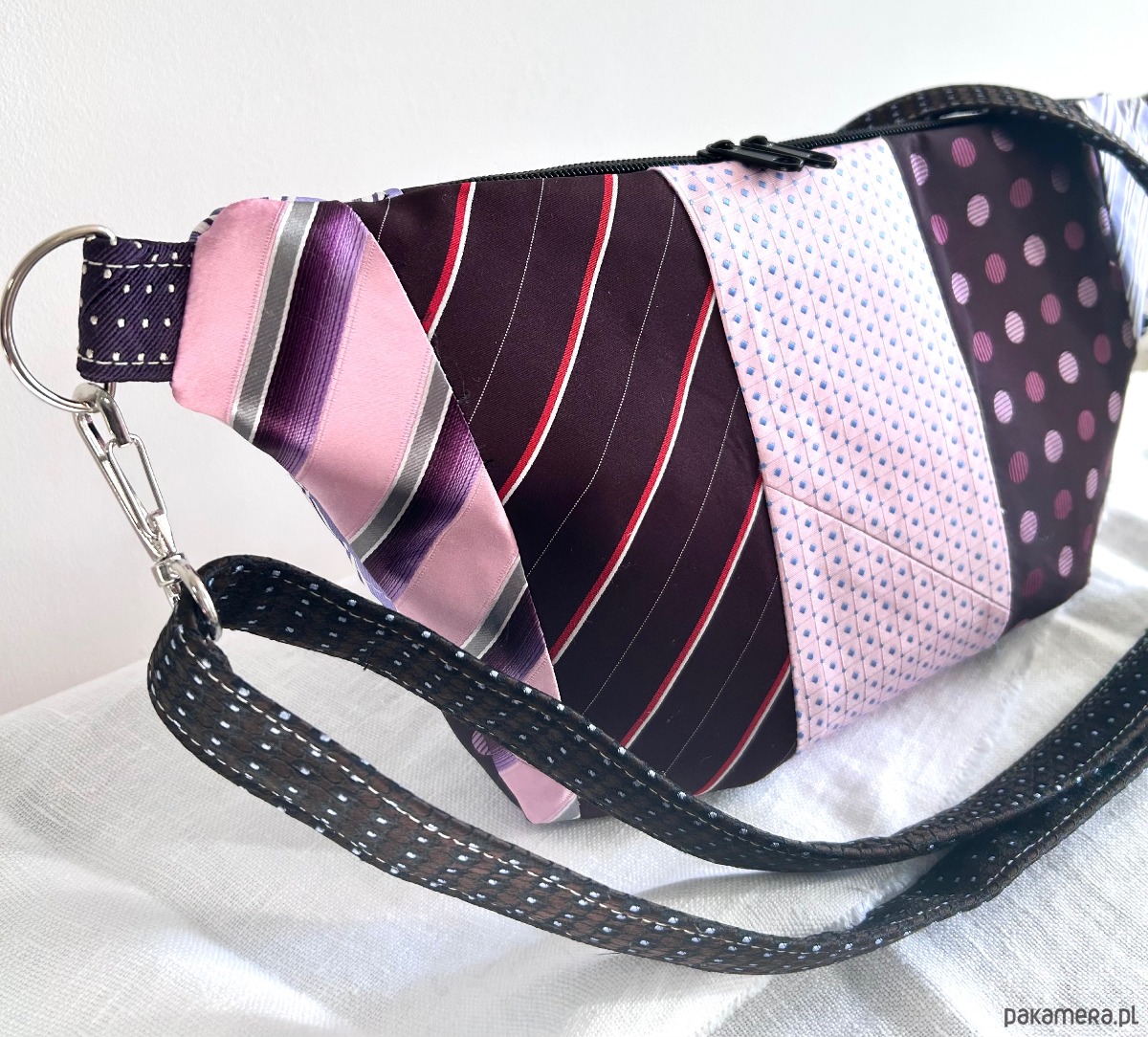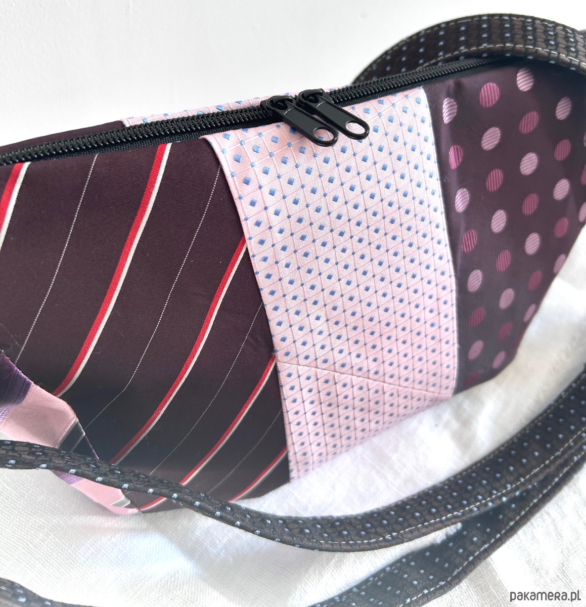 Unikatowa nerka patchworkowa wykonana z męskich krawatów, zapinana na suwak. Na zewnątrz kieszonka z ukrytym suwakiem, wewnątrz kieszonka zapinana na suwak i elastyczna smycz z karabińczykiem na klucze. Usztywniana nieprzemakalną tkaniną. Odpinany regulowany pasek. Każda nerka ma inny, dopasowany kolorystycznie do całości pasek.