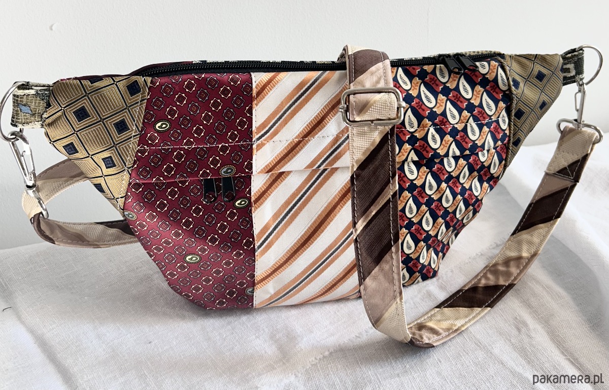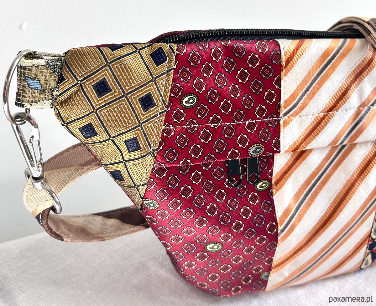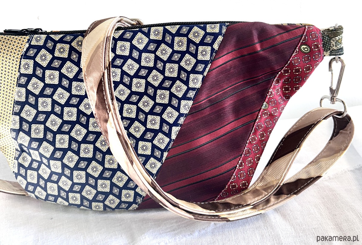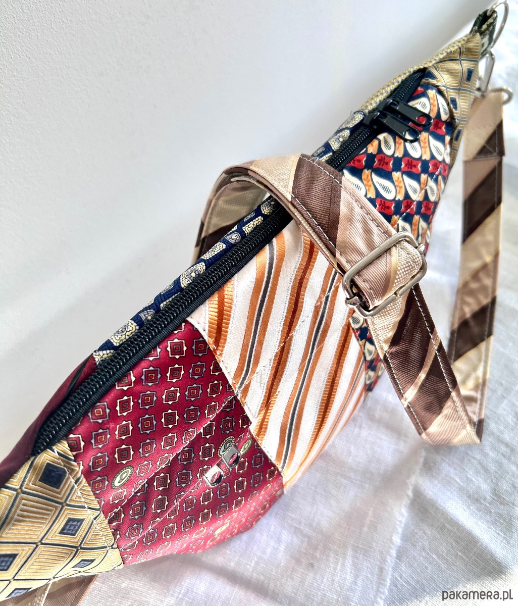 Unikatowa nerka patchworkowa wykonana z męskich krawatów, zapinana na suwak. Na zewnątrz kieszonka z ukrytym suwakiem, wewnątrz kieszonka zapinana na suwak i elastyczna smycz z karabińczykiem na klucze. Usztywniana nieprzemakalną tkaniną. Odpinany regulowany pasek. Każda nerka ma inny, dopasowany kolorystycznie do całości pasek.