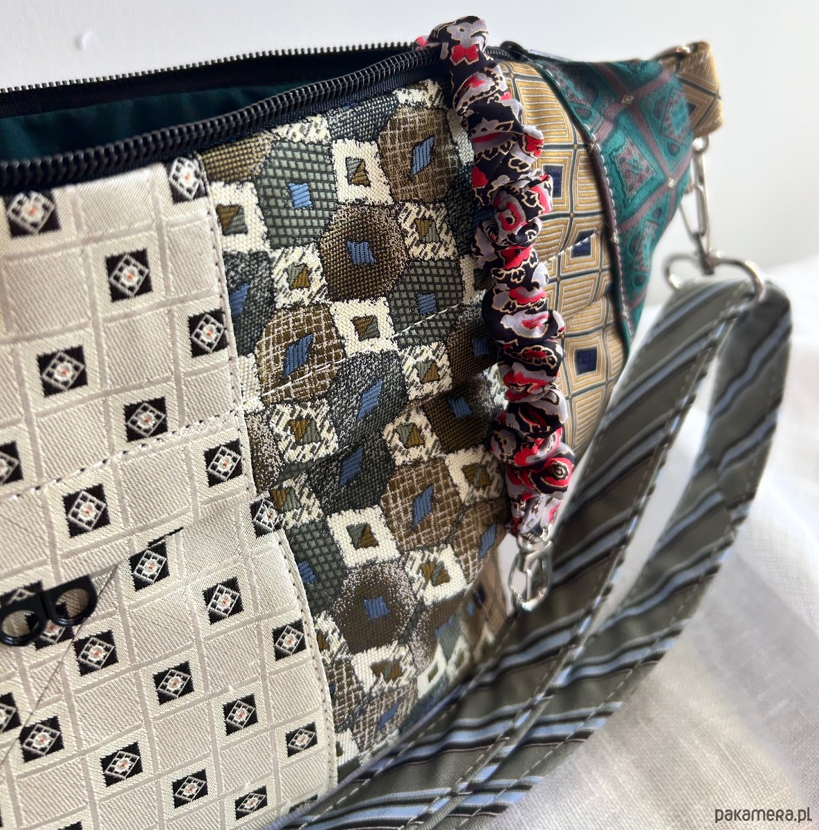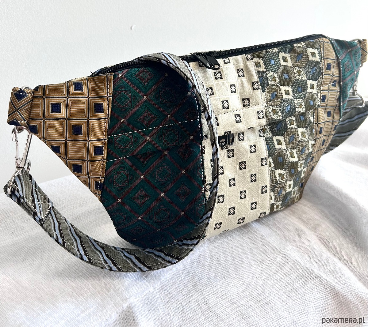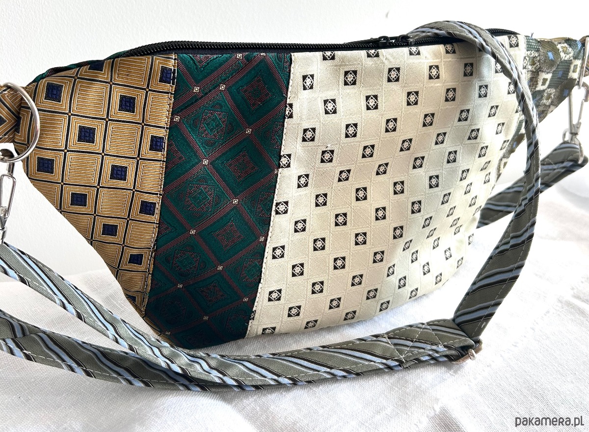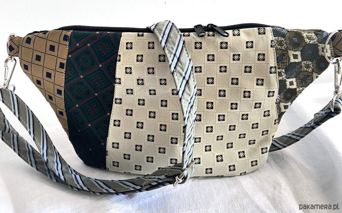 Unikatowa nerka patchworkowa wykonana z męskich krawatów, zapinana na suwak. Na zewnątrz kieszonka z ukrytym suwakiem, wewnątrz kieszonka zapinana na suwak i elastyczna smycz z karabińczykiem na klucze. Usztywniana nieprzemakalną tkaniną. Odpinany regulowany pasek. Każda nerka ma inny, dopasowany kolorystycznie do całości pasek.