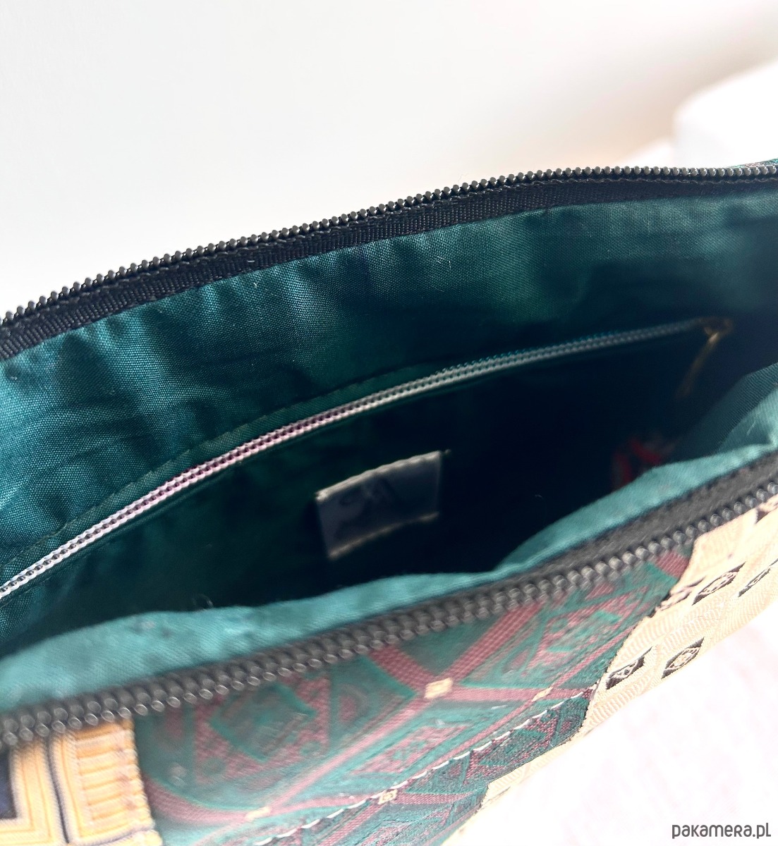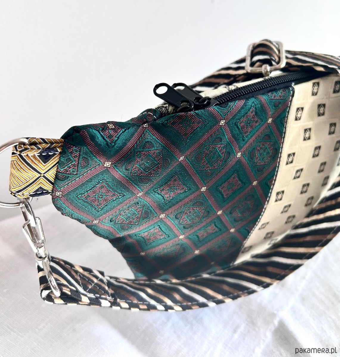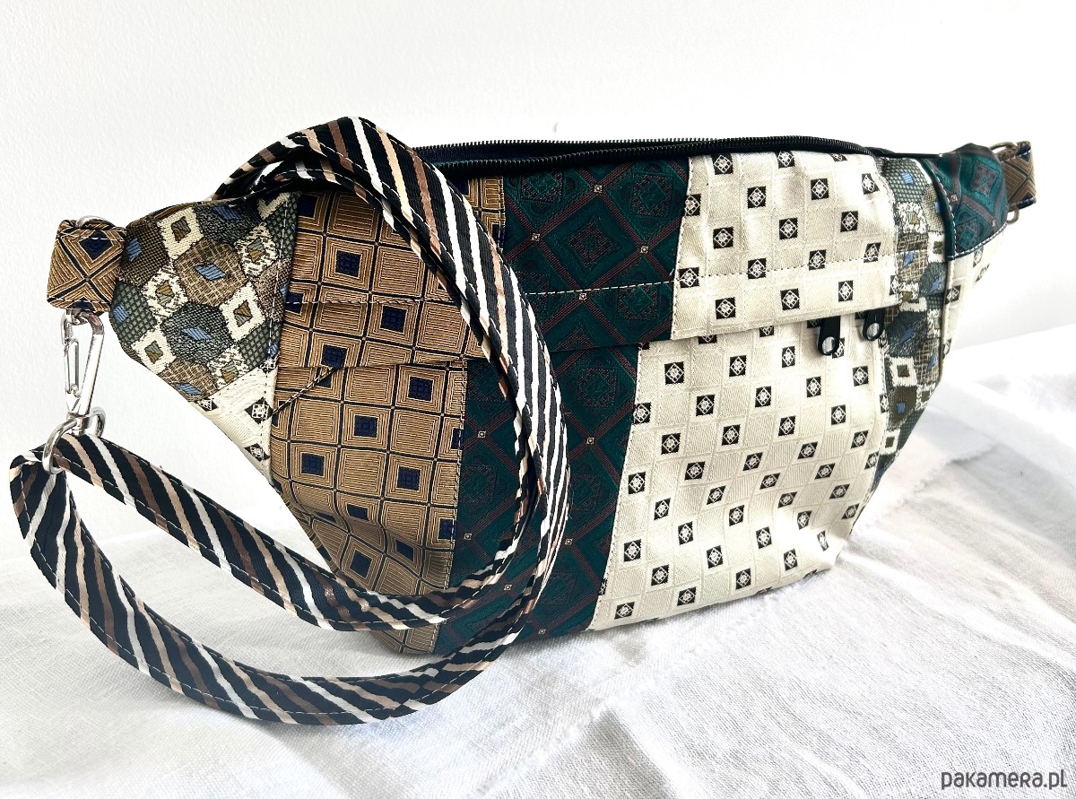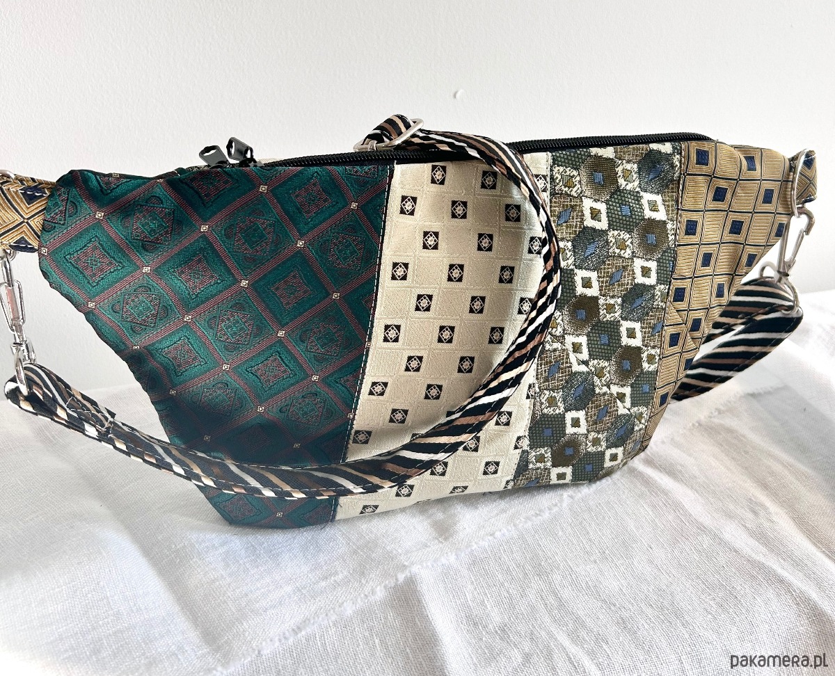 Unikatowa nerka patchworkowa wykonana z męskich krawatów, zapinana na suwak. Na zewnątrz kieszonka z ukrytym suwakiem, wewnątrz kieszonka zapinana na suwak i elastyczna smycz z karabińczykiem na klucze. Usztywniana nieprzemakalną tkaniną. Odpinany regulowany pasek. Każda nerka ma inny, dopasowany kolorystycznie do całości pasek.