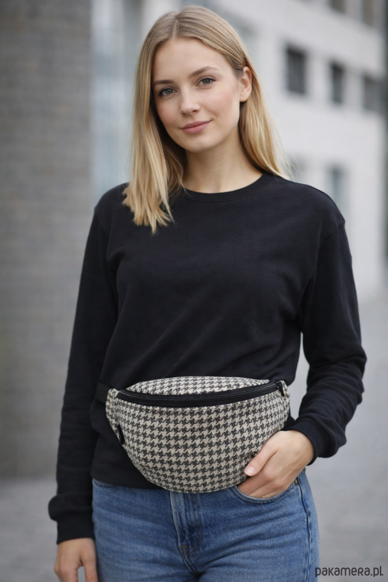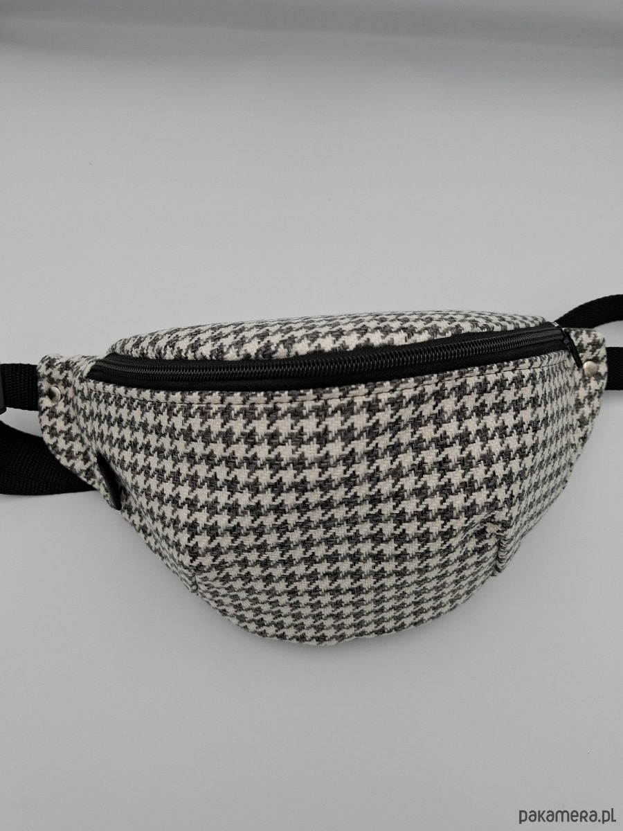 Śliczna nerka uszyta z tkaniny tapicerskiej we wzór pepitki. W środku kieszeń na zamek, podszewka z tkaniny wodoodpornej w kolorze czarnym. Tył nerki szary.