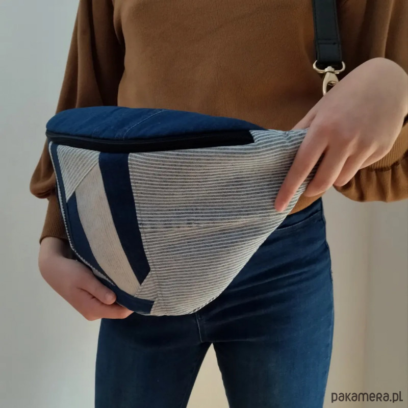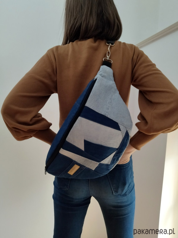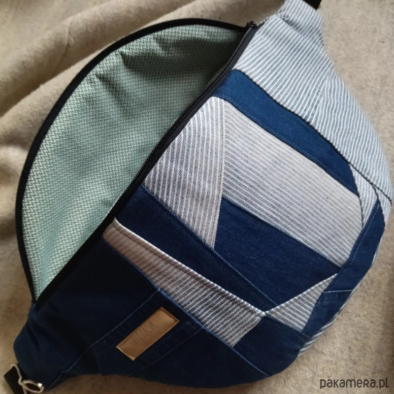 Upcyclingowa nerko torebka w rozmiarze XXL. Szerokość ok. 50 cm plus długość karabińczyków. Wysokość ok. 25 cm. Materiał wierzchni to jeans. W środku wodoodporna podszewka z kieszenią. Na zewnętrznym tyle nerki dodatkowa kieszeń zapinana na zamek. Nerka jest usztywniana. Regulowany pasek.