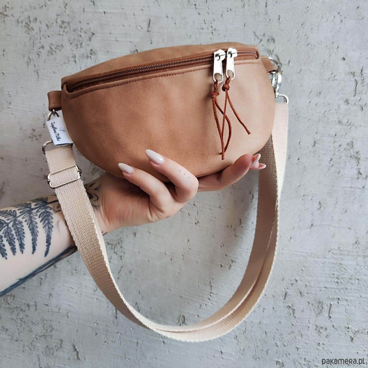 Nereczka półksiężyc jeszcze mniejsza od nerki mini. Uszyta z tkanin tkaniny a la nubuk rudej. Nerka jest jednokomorowa, bez przegródek w środku. Idealna na najpotrzebniejsze rzeczy takie jak telefon, dokumenty i kluczyki (pomieści dosłownie tylko tyle). W komplecie do nerki otrzymasz bawełniany beżowy pasek, ale jest oczywiście możliwość jego wymiany na inny kolor :) Nerka nie jest zależna od paska. Idealna do noszenia w pasie jak i przez tułów. Wymiary nerki: długość w najszerszym miejscu 22cm, wysokość mierzona na środku nerki 14cm. Pasek z możliwością regulacji długości: minimalny obwód wraz z nerką ok.83cm, maksymalna długość ok.127cm.