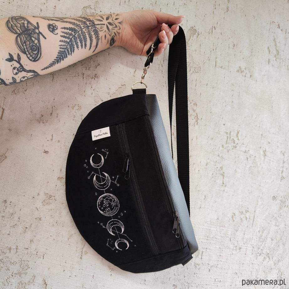 Nerka półksiężyc gigant o wymiarach 34cmx20cmx6cm (+/-1cm). Na przodzie nerki kieszonka zewnętrzna zapinana na zamek dwukierunkowo. Wewnątrz nerki malutka kieszonka na zamek. W komplecie do nerki regulowany pasek, maksymalna długość/obwód wraz z nerką 153cm, minimalny 102cm.