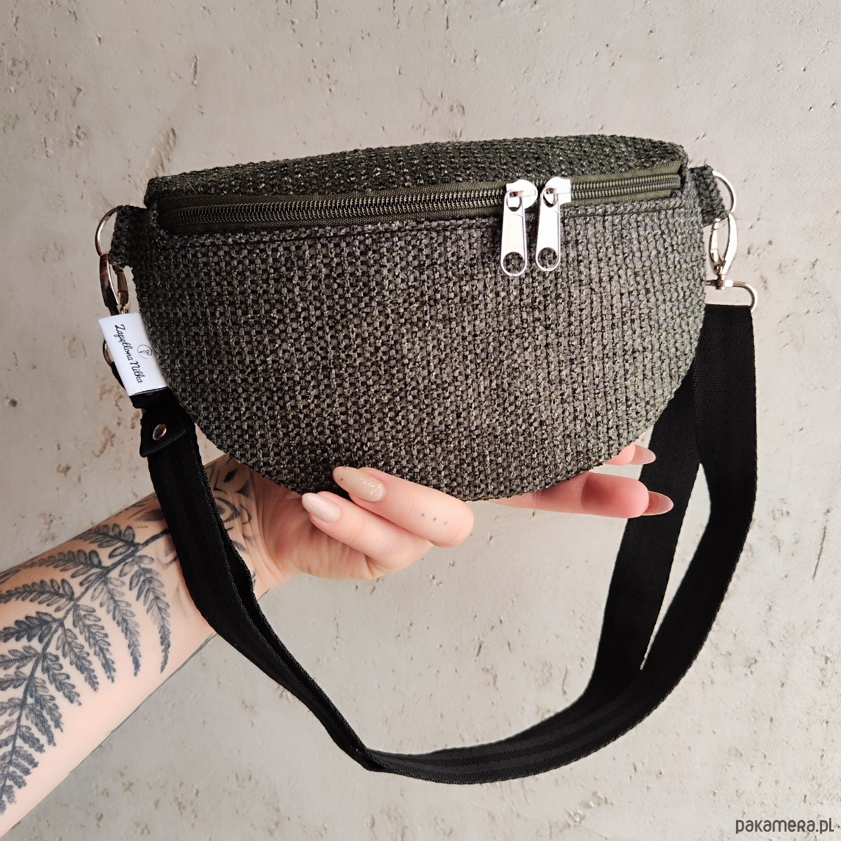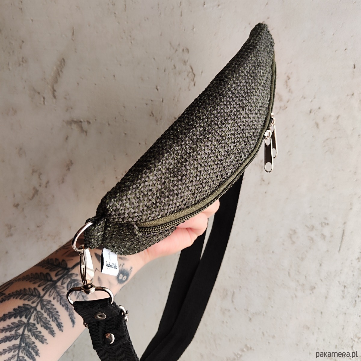 Nereczka półksiężyc jeszcze mniejsza od nerki mini. Uszyta z nietypowej, unikatowej tkaniny jaką jest plecionka khaki oliwka. Nerka jest jednokomorowa, bez przegródek w środku. Idealna na najpotrzebniejsze rzeczy takie jak telefon, dokumenty i kluczyki (pomieści dosłownie tylko tyle). W komplecie do nerki otrzymasz pasek widoczny na zdjęciach, ale jest oczywiście możliwość jego wymiany na inny kolor :) Nerka nie jest zależna od paska. Idealna do noszenia w pasie jak i przez tułów. Wymiary nerki: długość w najszerszym miejscu 22cm, wysokość mierzona na środku nerki 14cm. Pasek z możliwością regulacji długości: minimalny obwód wraz z nerką ok.83cm, maksymalna długość ok.127cm.
