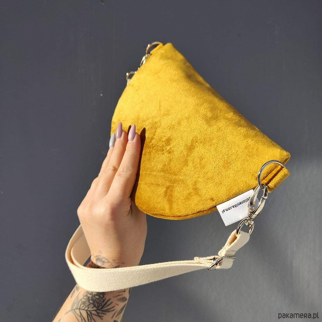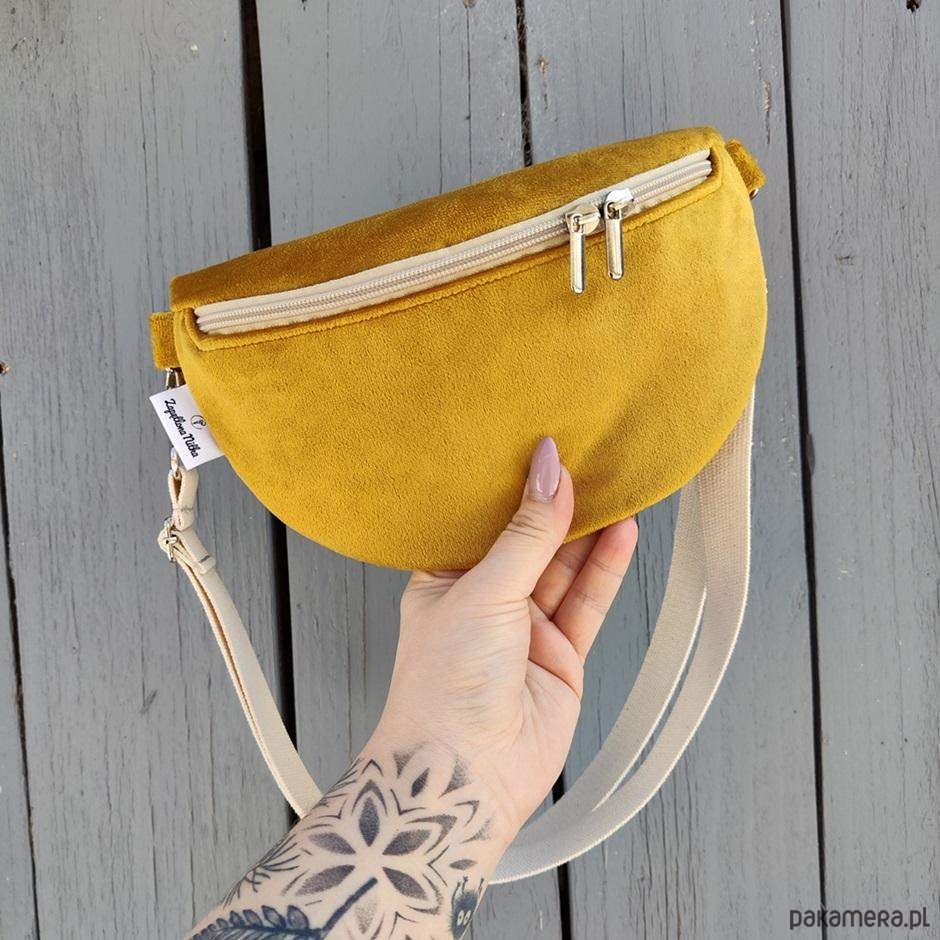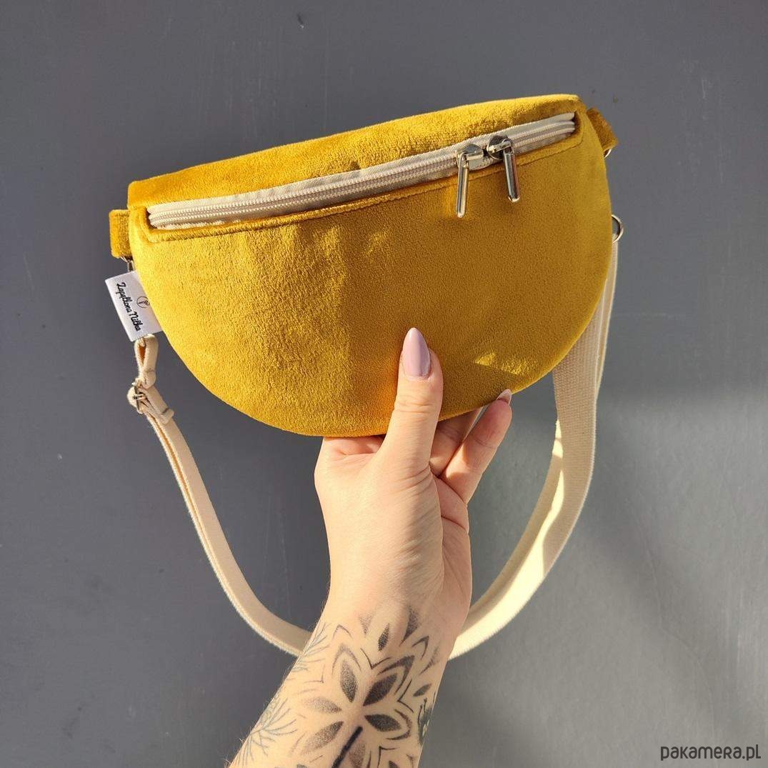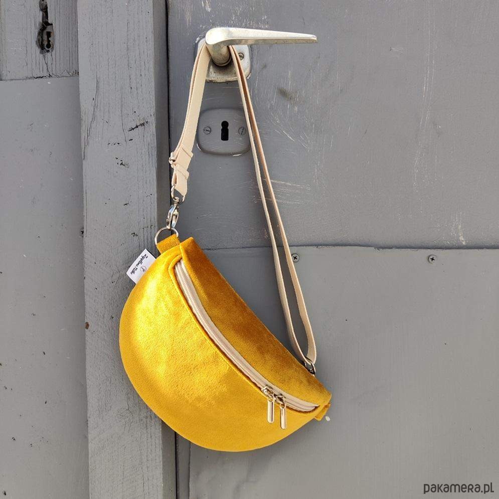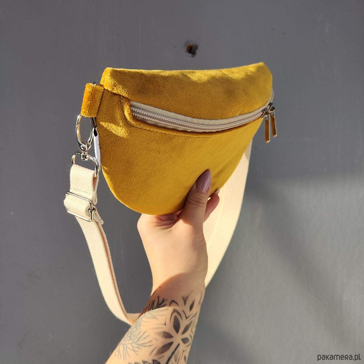 Nereczka półksiężyc jeszcze mniejsza od nerki mini. Uszyta z aksamitu w kolorze złotym oraz bawełny beżowej w kwiaty (środek nerki).Nerka jest jednokomorowa, bez przegródek w środku. Nerka idealna na najpotrzebniejsze rzeczy takie jak telefon, dokumenty i kluczyki (pomieści dosłownie tylko tyle). W komplecie do nerki otrzymasz pasek widoczny na zdjęciach (pasek beżowy bawełniany 2,5cm), ale jest oczywiście możliwość jego wymiany na inny kolor :) Nerka nie jest zależna od paska. Idealna do noszenia w pasie jak i przez tułów. Wymiary nerki: długość w najszerszym miejscu 22cm, wysokość mierzona na środku nerki 14cm. Pasek z możliwością regulacji długości: minimalny obwód wraz z nerką ok.83cm, maksymalna długość ok.127cm.