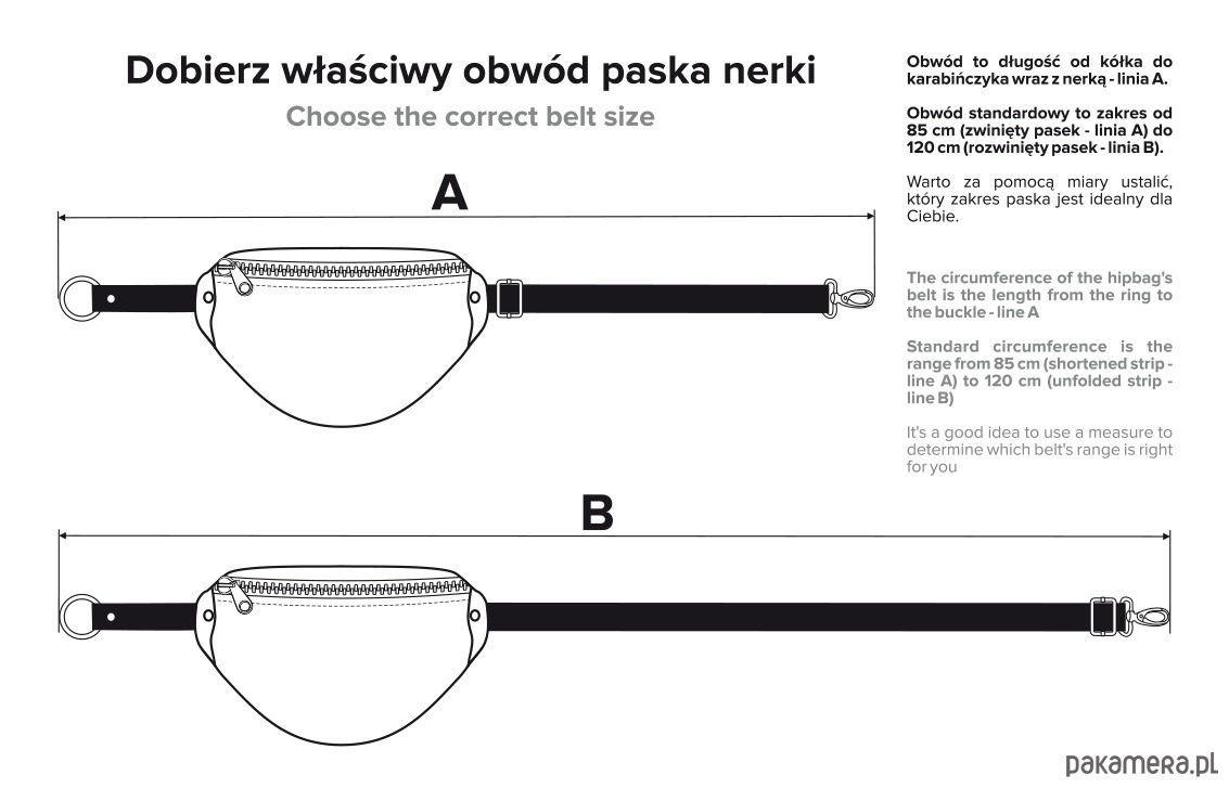 Pamiętaj aby dobrać odpowiedni zakres obwodu paska nerki. Obwód paska nerki to długość od kółka do karabińczyka wraz z nerką.