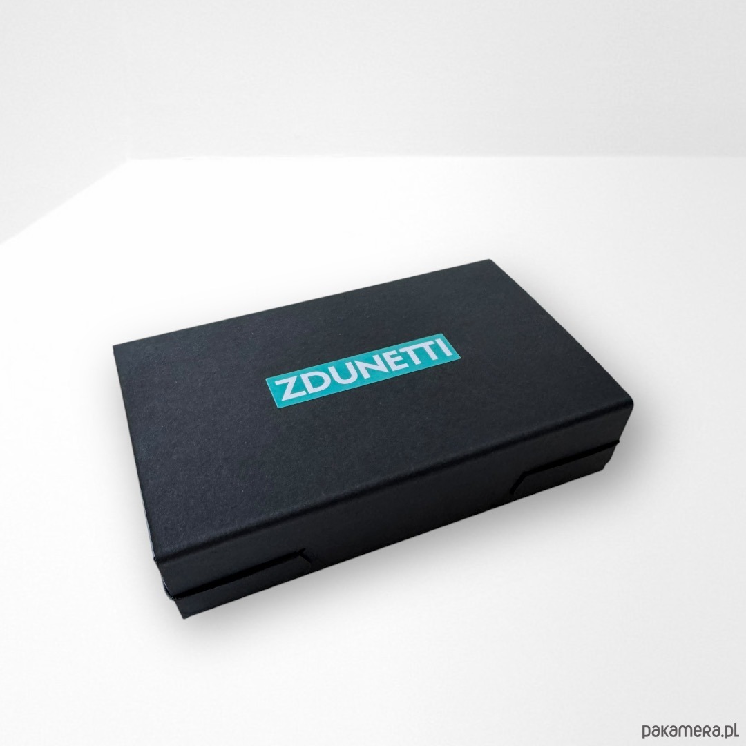Zapakowana w piękne czarne pudełko z grubej litej tektury.