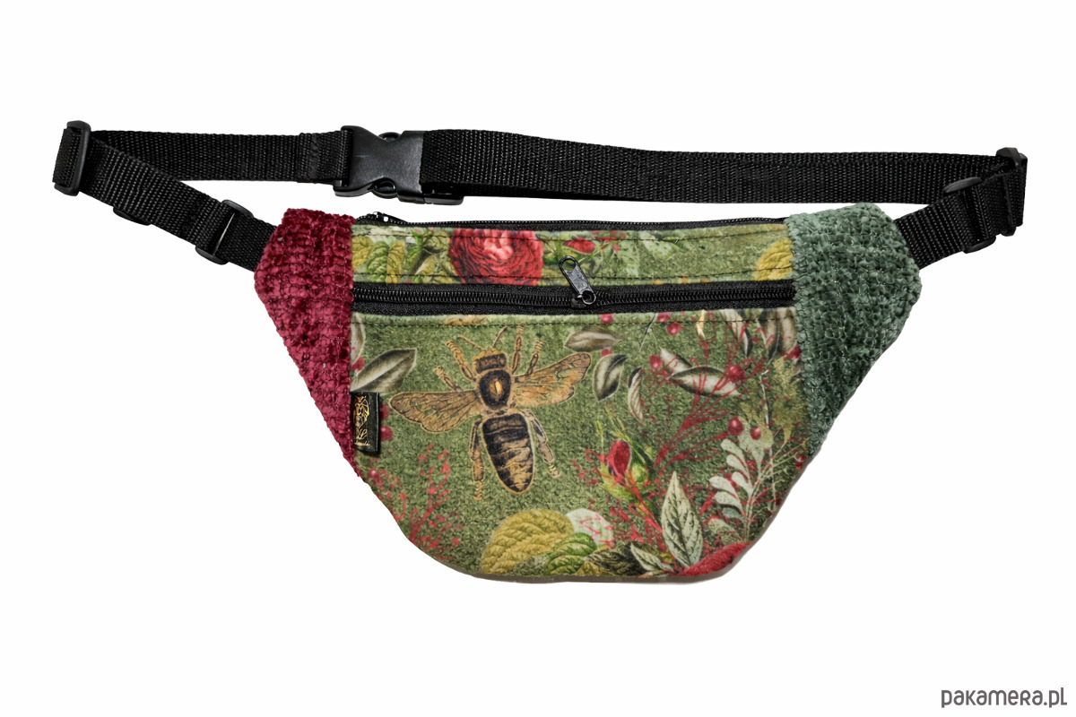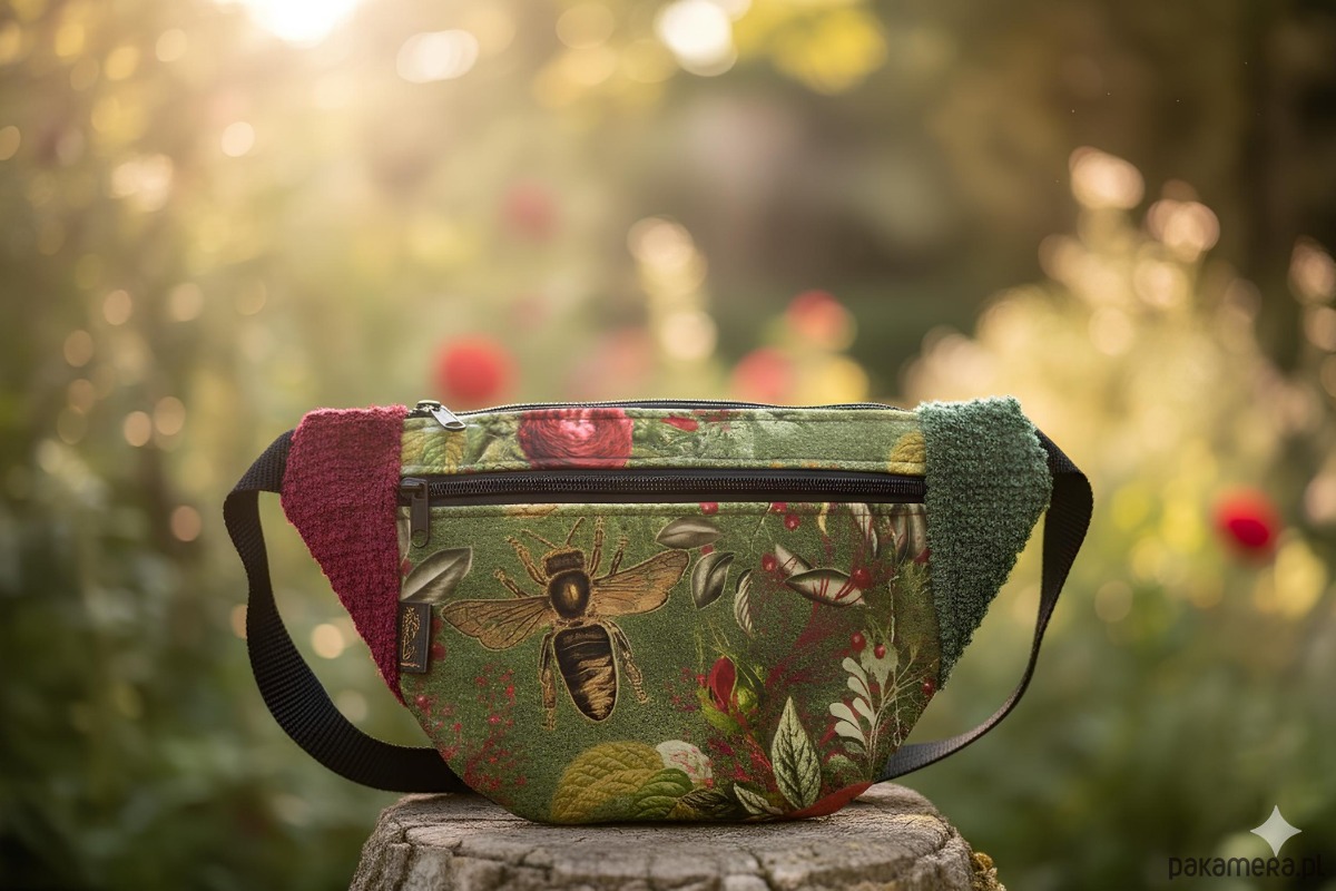 Ta wyjątkowa nerka (saszetka biodrowa) przyciąga wzrok bogatym wzornictwem i ciekawą teksturą materiałów. Centralnym punktem projektu jest grafika przedstawiająca realistyczną pszczołę na tle gęstej roślinności, czerwonych kwiatów i owoców dzikiej róży.