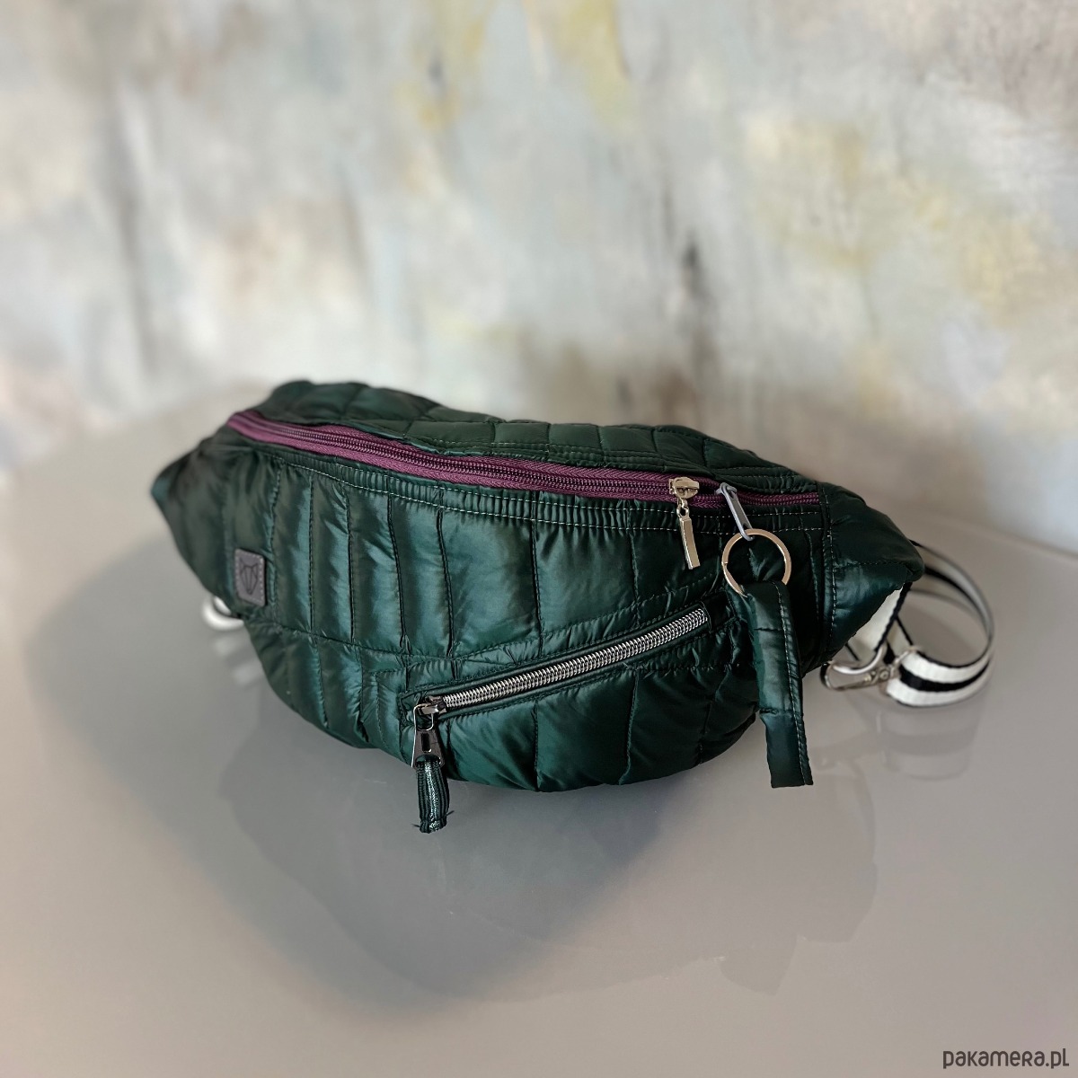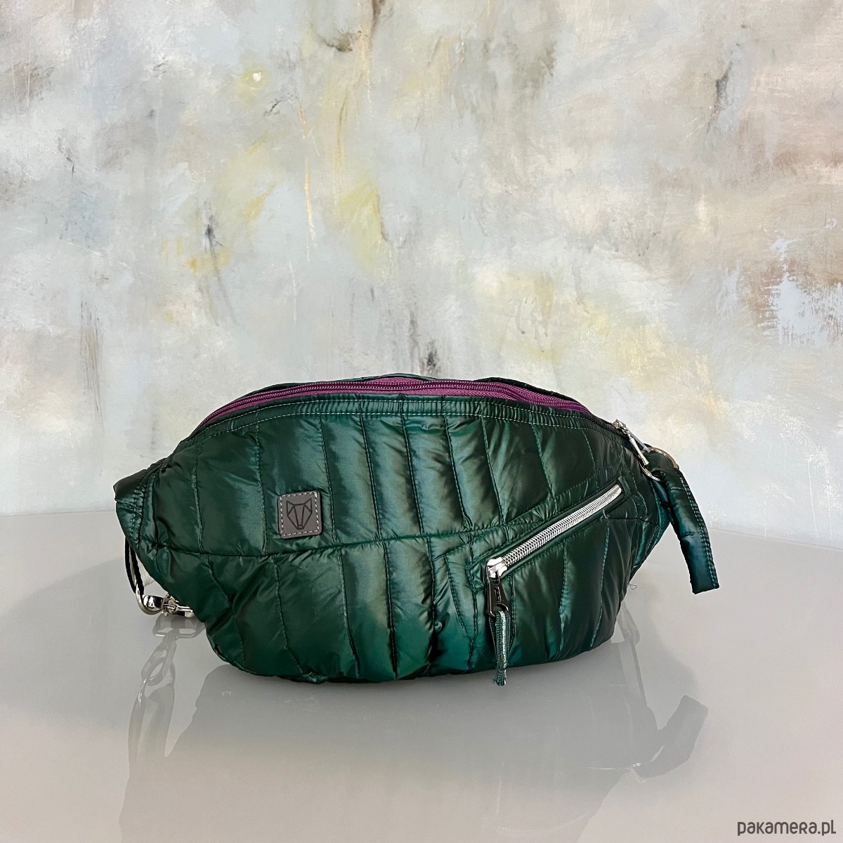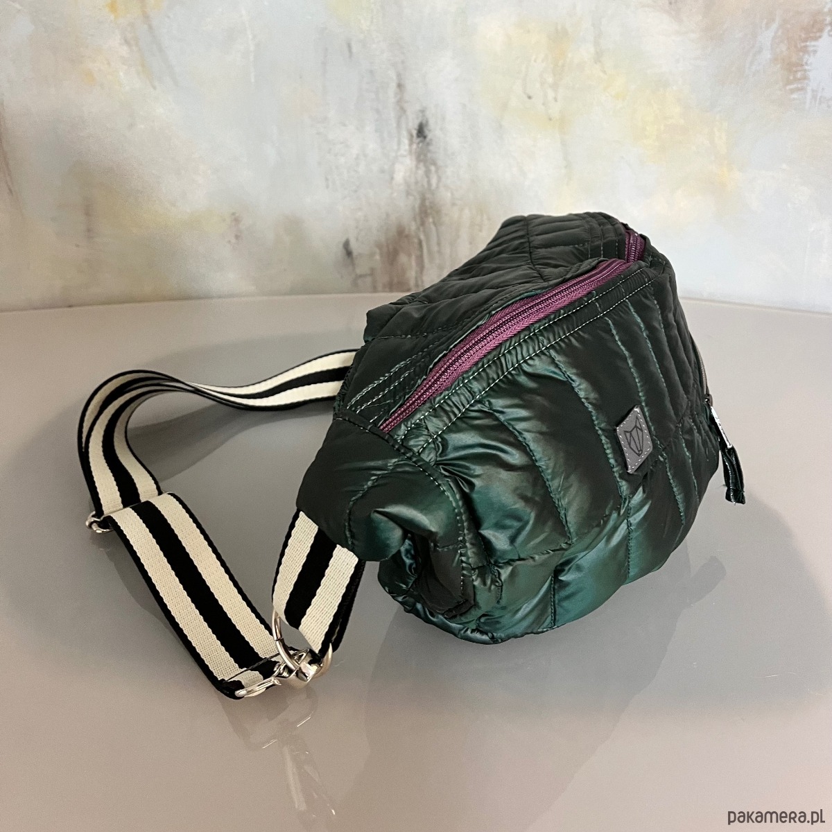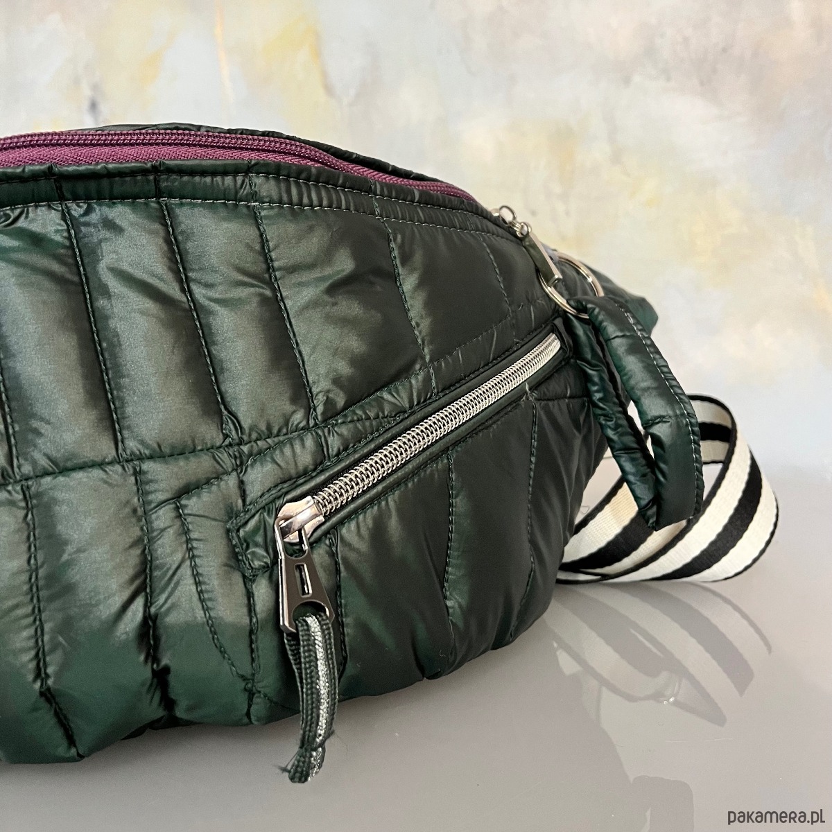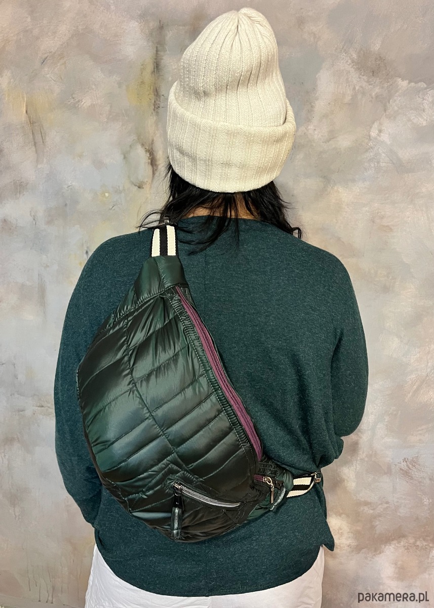 Puchowa, duża nerka w stylu mnimalistycznym. Miękki i pikowany materiał doskonale chroni przedmioty w srodku, na przykład twojego iPada. Torebka w kolorze ciemnozielonym. Możesz ją dopasować do outfitów sportowych i mnimalistycznych.