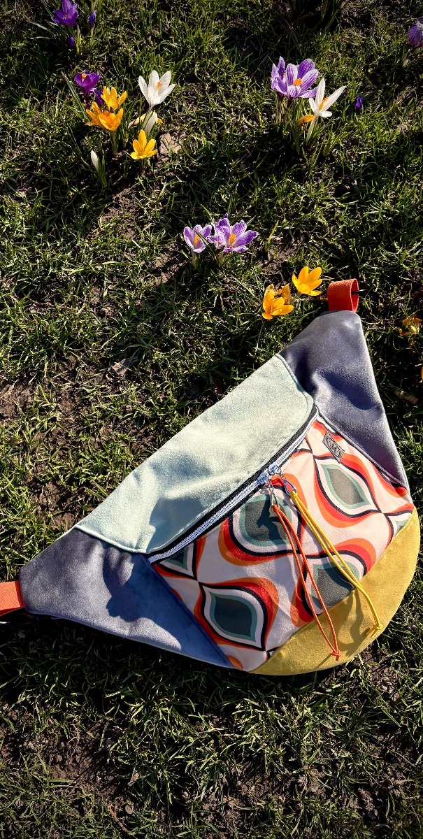 Wykonana z mięciutkiego tapicerskiego weluru. To połączenie weluru w kolorze żółtym , miętowym i szarym oraz nowego wzoru retro w pastelowej tonacji z zewnątrz i czarnej podszewki we wnętrzu.