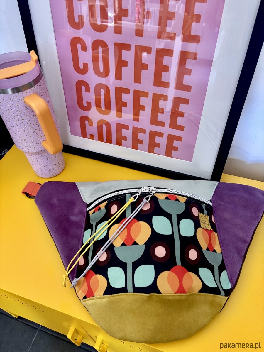 Wykonana z mięciutkiego tapicerskiego weluru. To połączenie weluru w kolorze żółtym , miętowym i fioletowego oraz nowego wzoru retro tulipany w z zewnątrz i czarnej podszewki we wnętrzu.