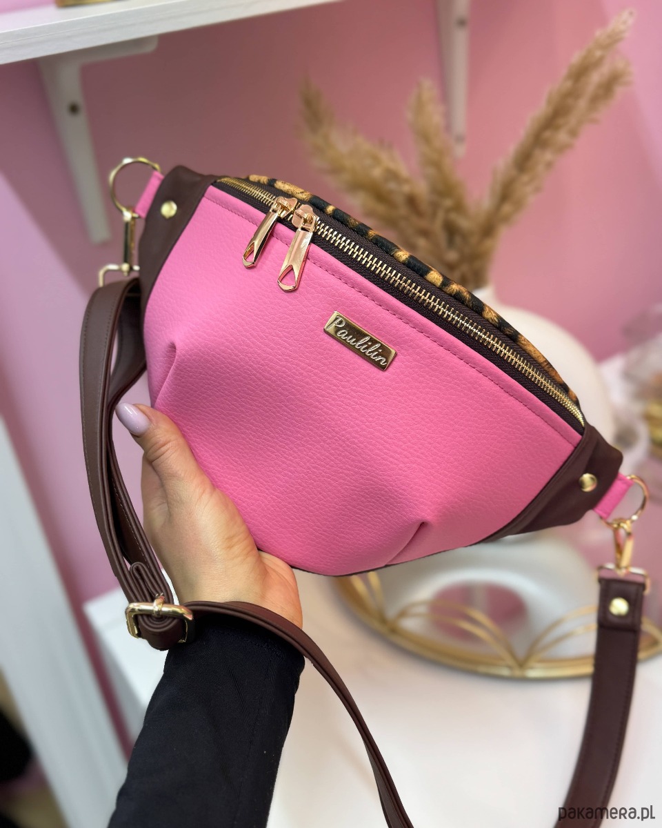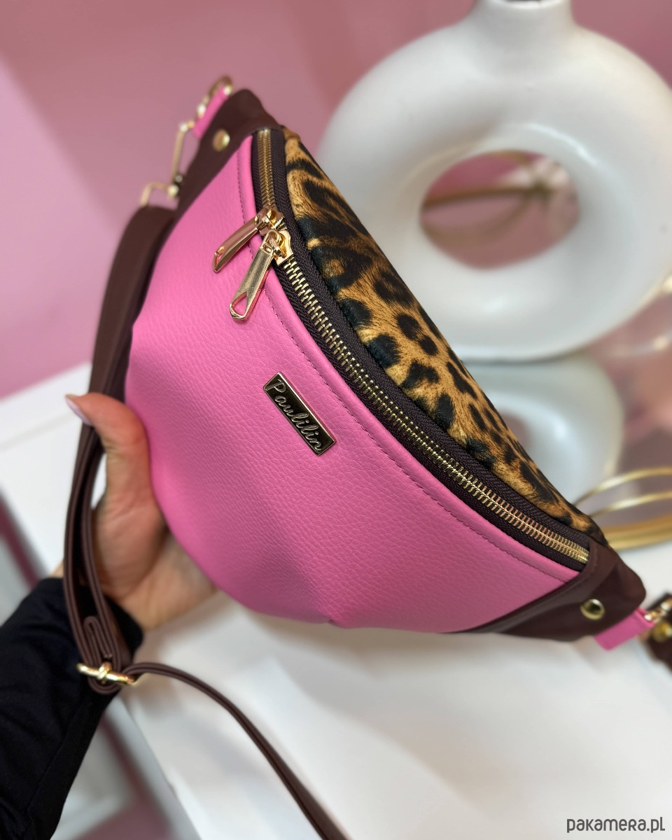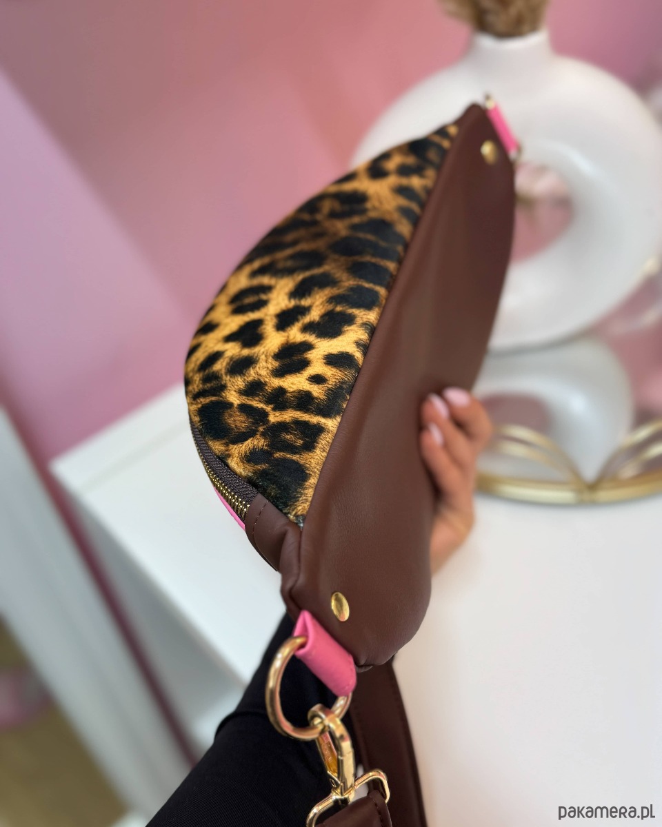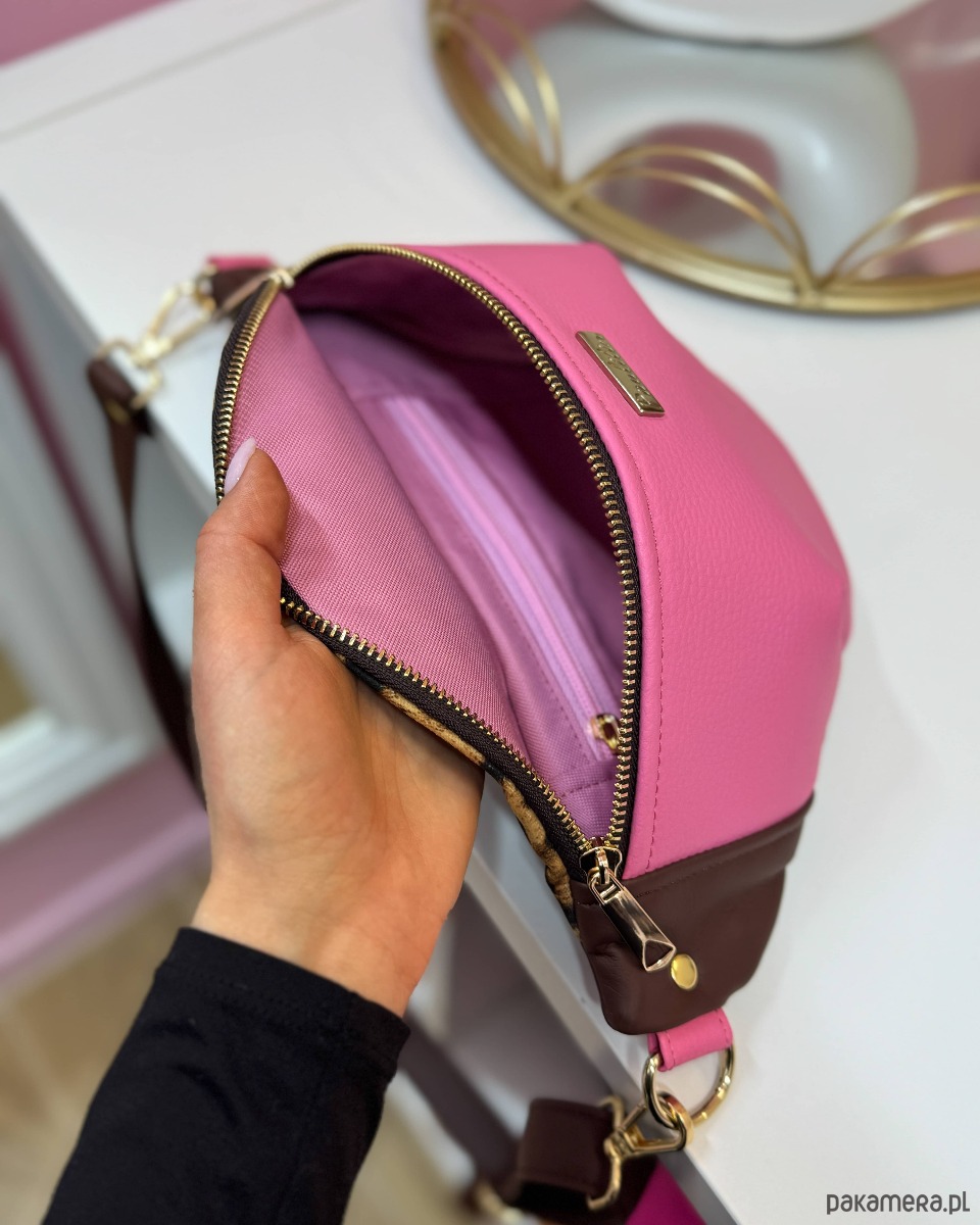 Wykonana ze skóry ekologicznej wysokiej jakości w kolorze różowym, brązowym oraz na górze wykonana z weluru tapicerskiego we wzór panterki.