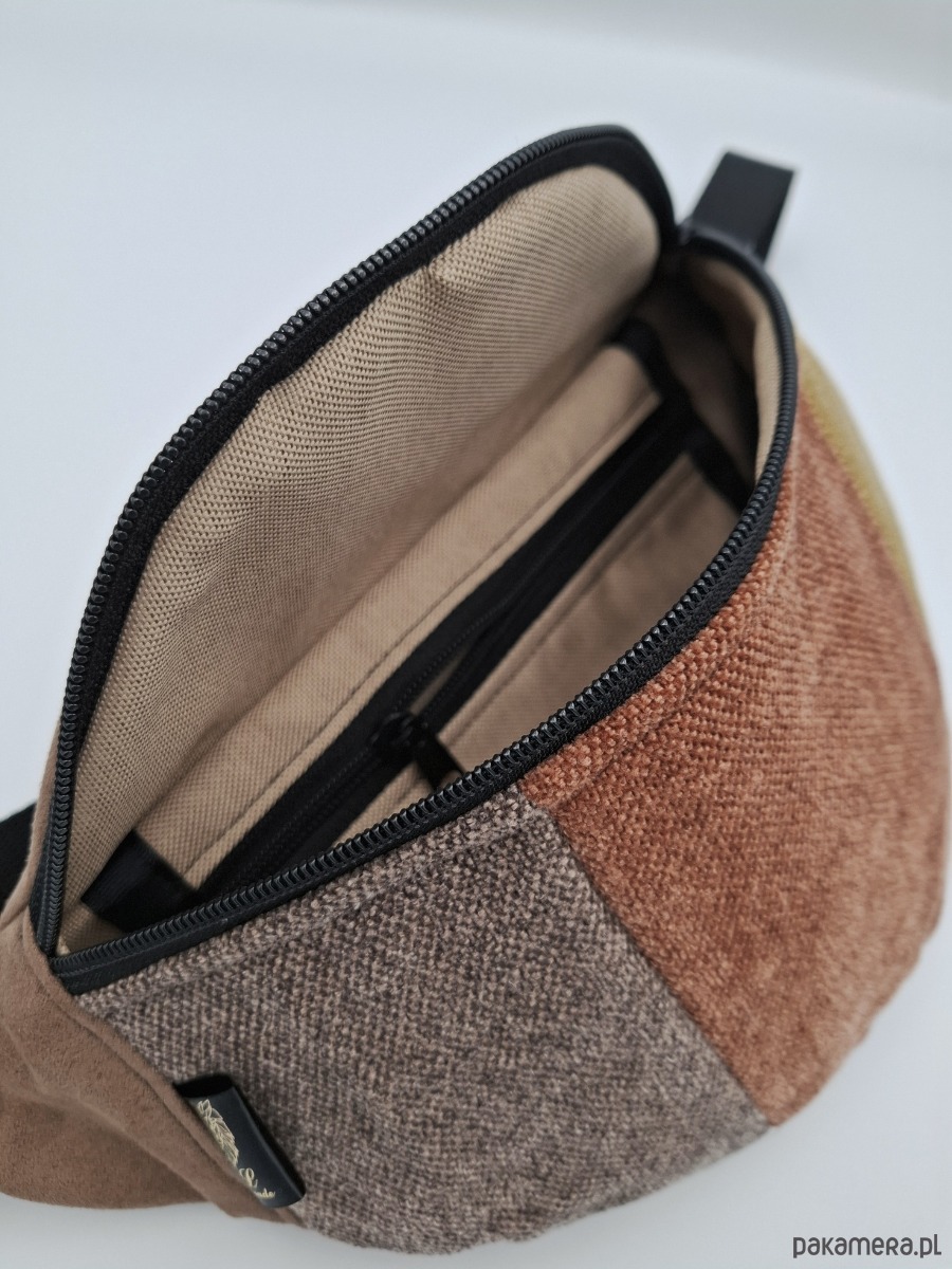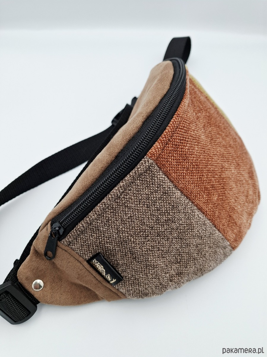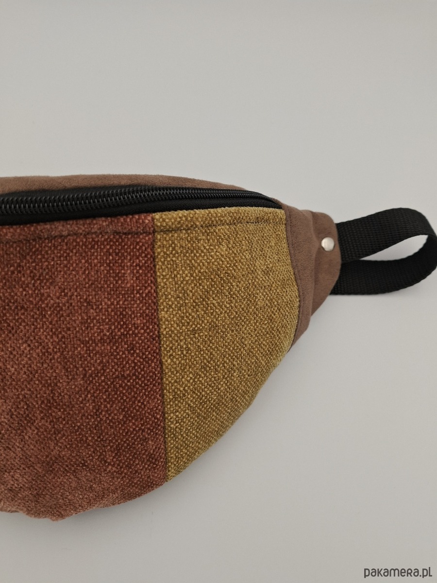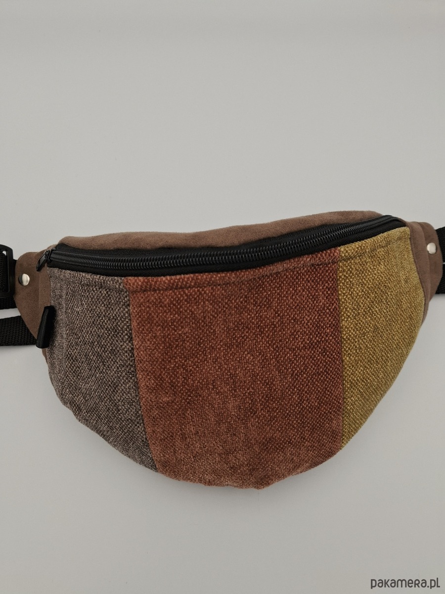 Nerka uszyta z tkanin tapicerskich w kolorach rudy, brąz, żółty. W środku kieszeń na zamek, podszewka z tkaniny wodoodpornej w kolorze beżowym.