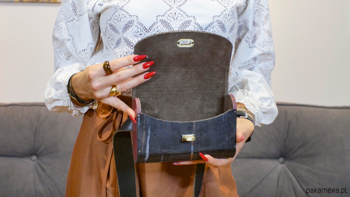 Zamykana na zamek. Środek wyściełany iałem typu Alkantarą w kolorze ciemnego brązu. Okucia torebki w kolorze antycznego brązu. Szeroki pasek skórzany z mosiężną klamrą, nadaje jej oryginalnego charakteru. Do noszenia w pasie lub na ukos.