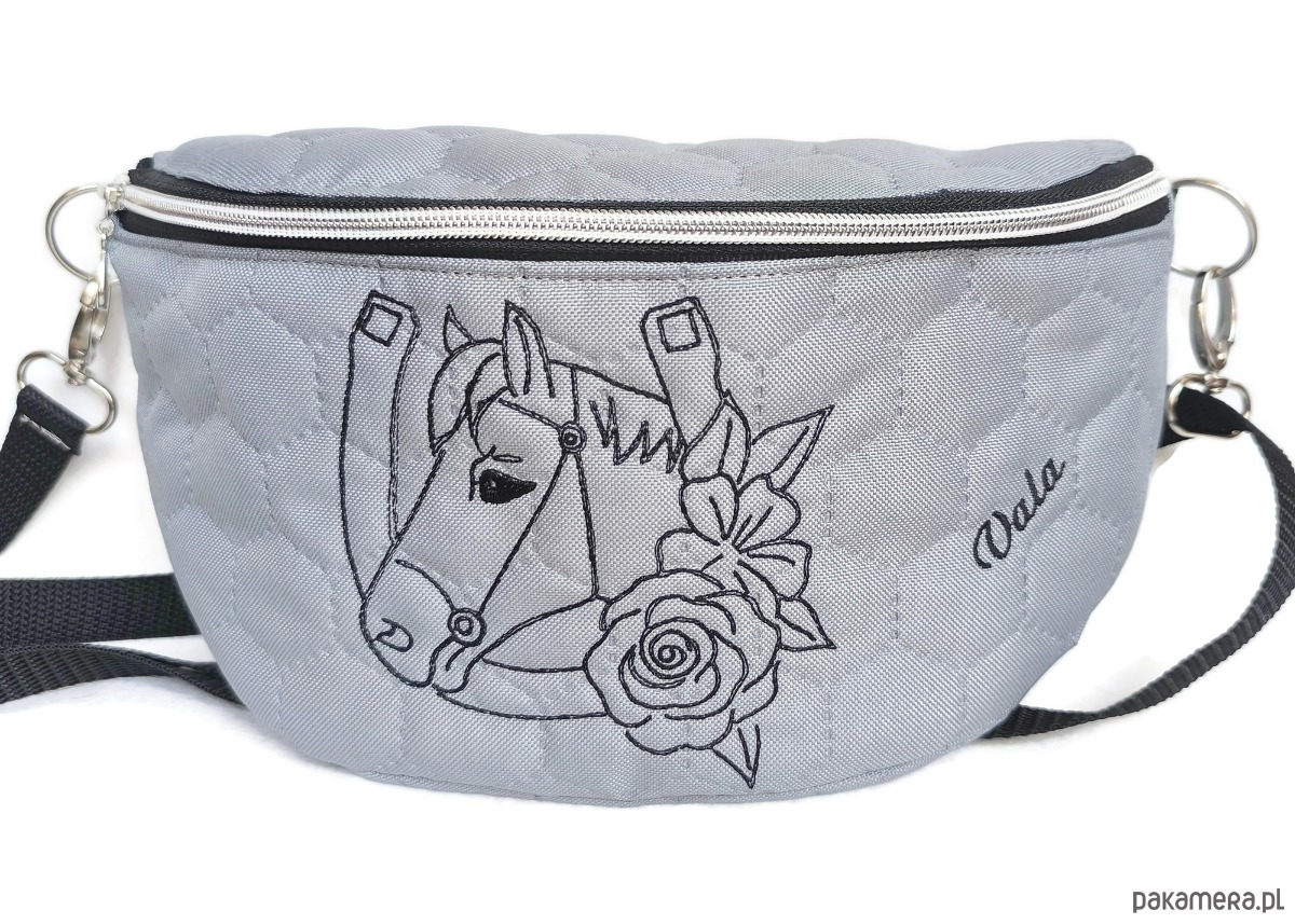 Nerka, saszetka do noszenia na ramię z regulowanym paskiem, zapinana na suwak, w środku mała kieszonka na suwak.