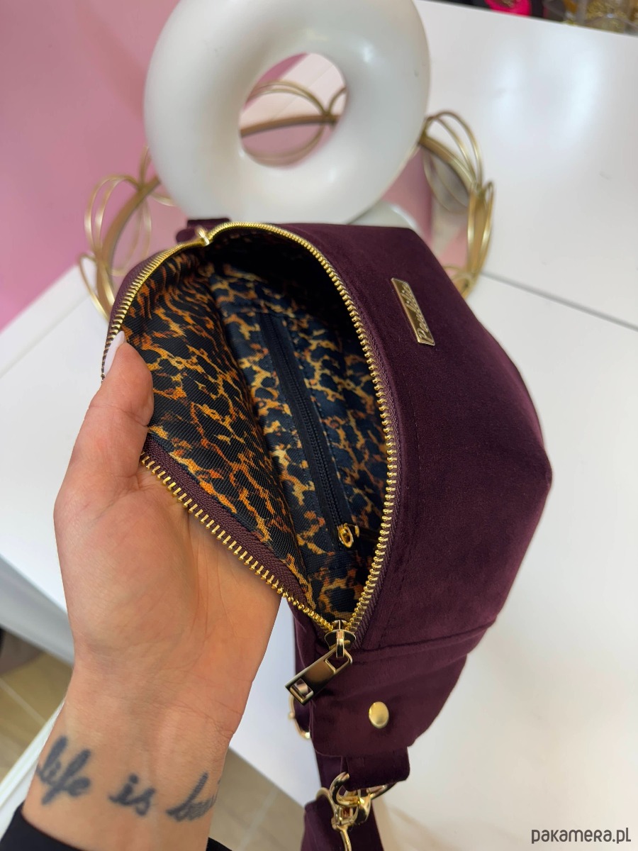 Nerka wykonana z wysokiej jakości weluru tapicerskiego, który jest miękki w dotyku a jednocześnie wytrzymały. Materiał pięknie się mieni i wygląda bardzo elegancko. Nerka, która będzie idealnym towarzyszem na wszelkie spacery, wyjścia, imprezy. Wszystko masz pod ręką. W środku nerka posiada kieszonkę zapinaną na zamek.