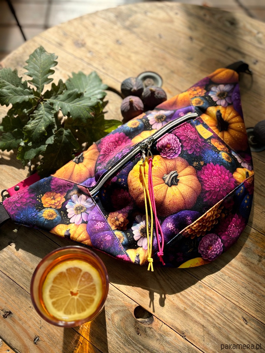 Wykonana z weluru tapicerskiego o pięknym dyniowym wzorze z zewnątrz z jednokolorową podszewką we wnętrzu.