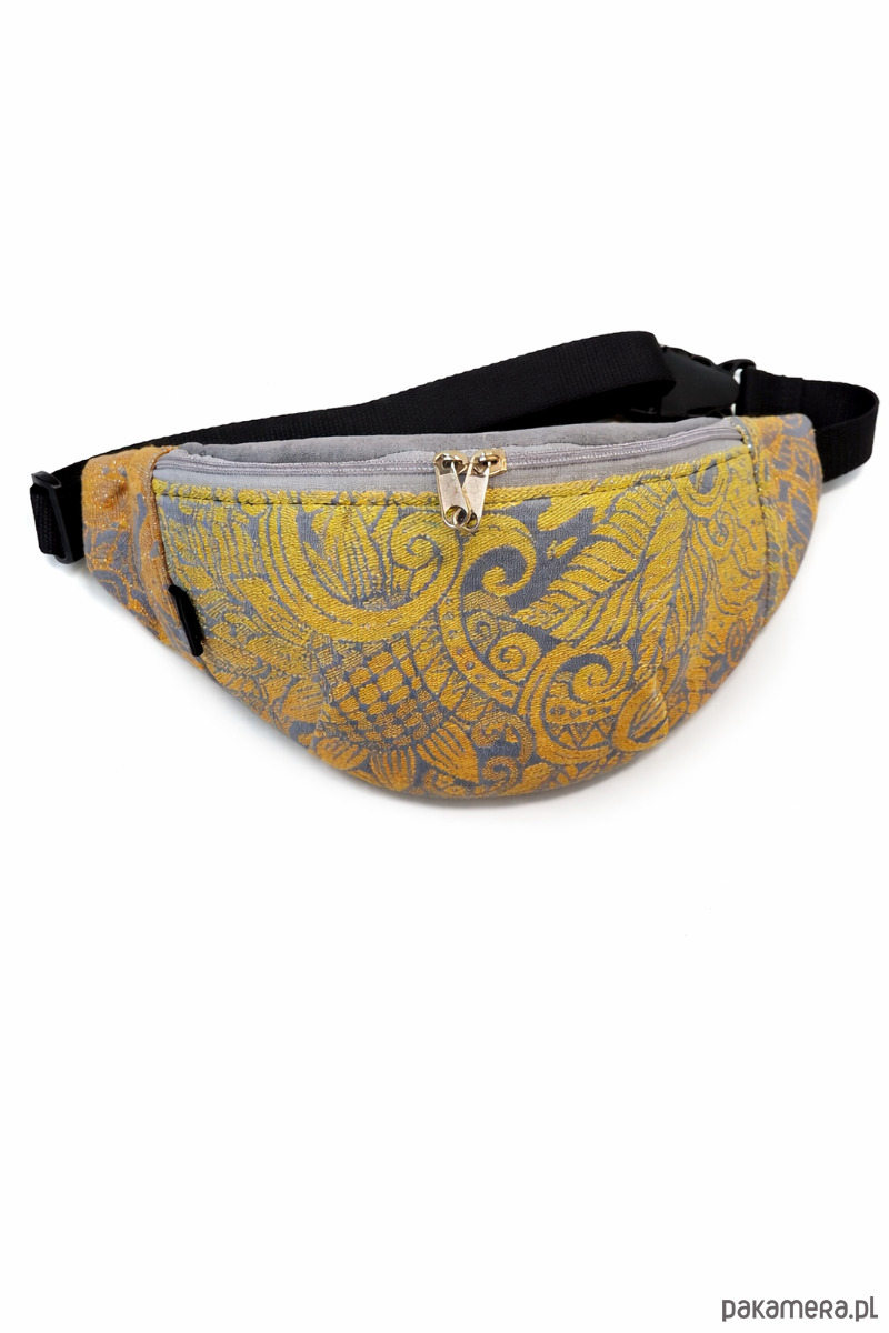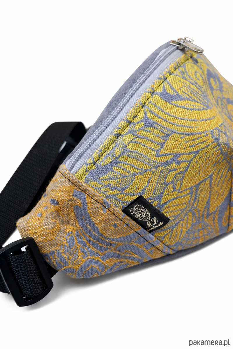 Piękna nerka, ktorej przód uszyty z chusty do noszenia dzieci w żółty wzór liści z delikatną srebrną nitką. Tył i klapka uszyta z tkaniny tapicerskiej w kolorze szarym. Całość usztywniona. W środku tkanina wodoodporna w kolorze czarnym oraz kieszeń na zamek.