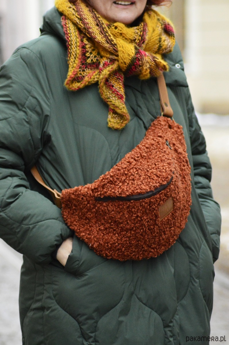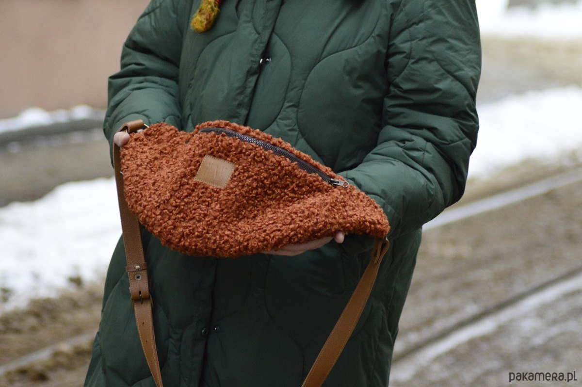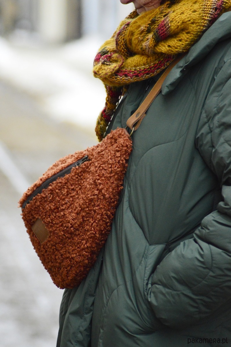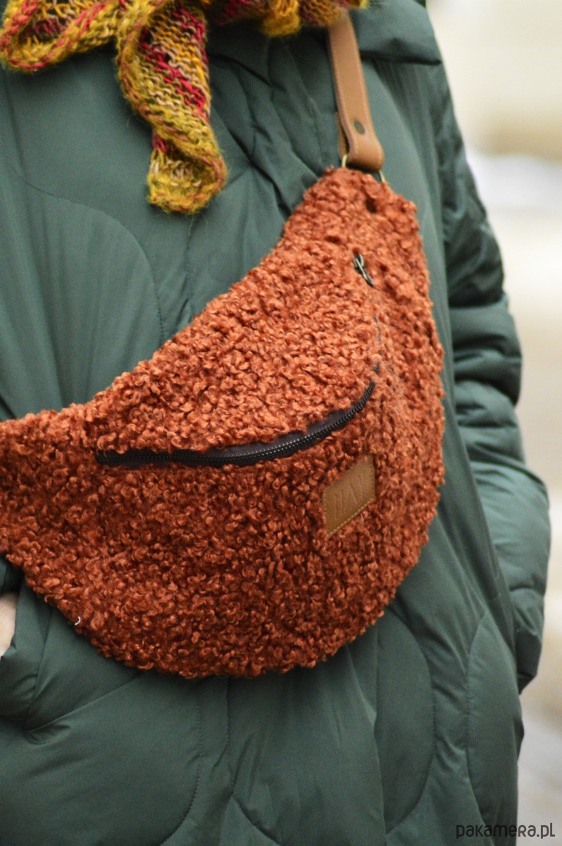 Nerka powstała z tkaniny tapicerskiej o fakturze baranka oraz skóry naturalnej . Nerka jest bardzo duża, więc nadaje się do noszenia tylko w formie torebki.