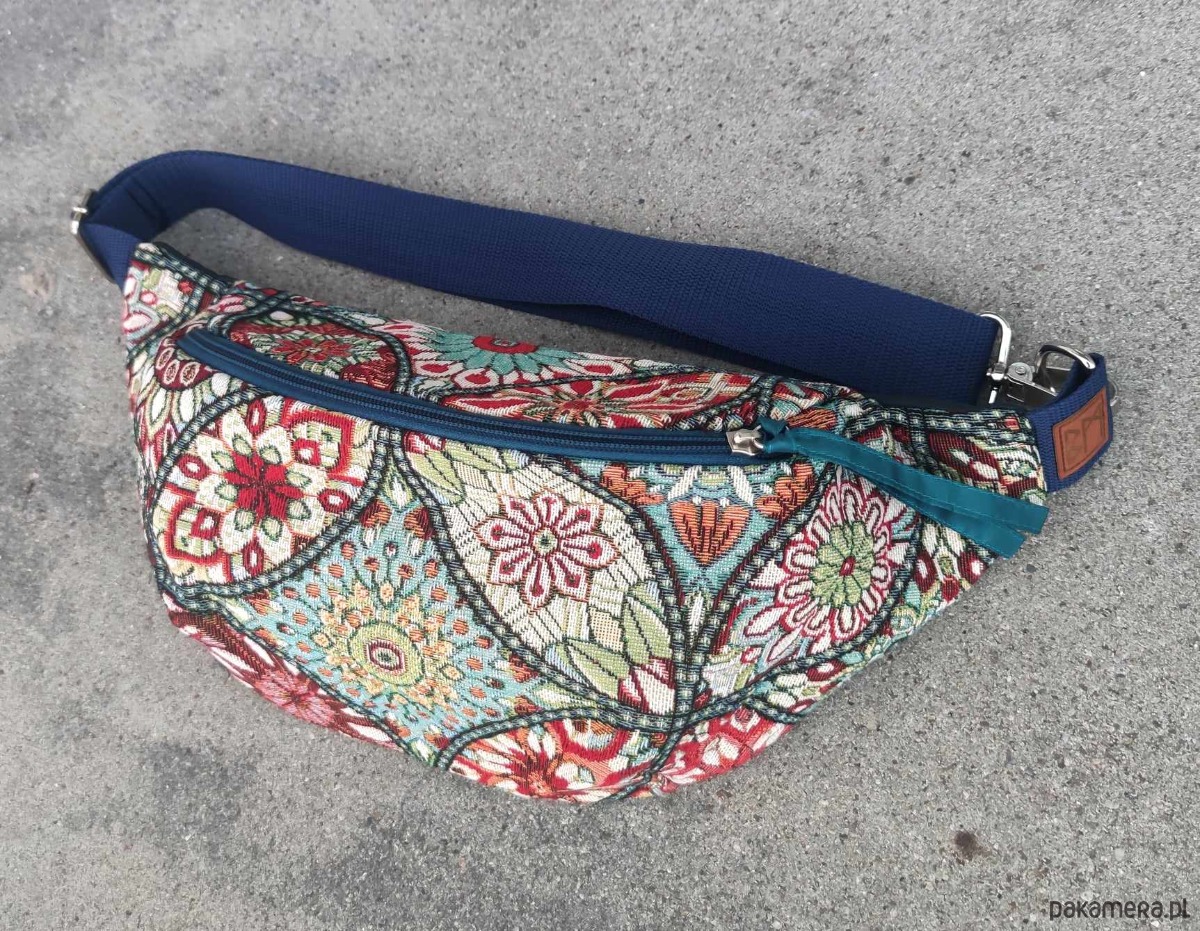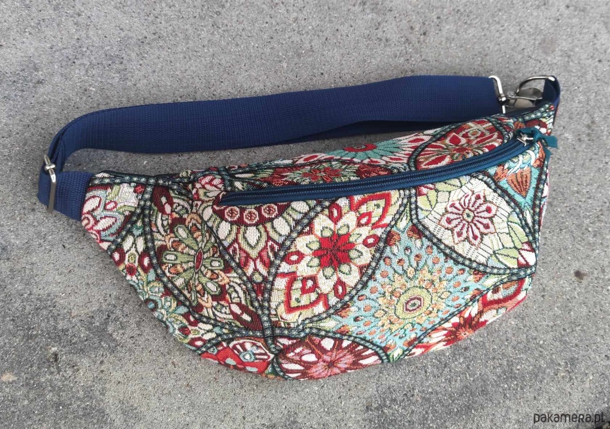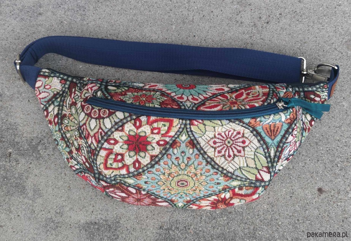 Bardzo duża nerka wykonana z solidnego, grubo tkanego materiału i imitacji skóry. Poza obszerną komorą główną posiada wewnętrzną kieszeń zamykaną na suwak. Wymiary; szerokość 40cm, wysokość 20cm, głębokość 10cm, obwód pasa (łącznie z nerką) regulowany od 92cm do max 135cm, szerokość paska 4cm.