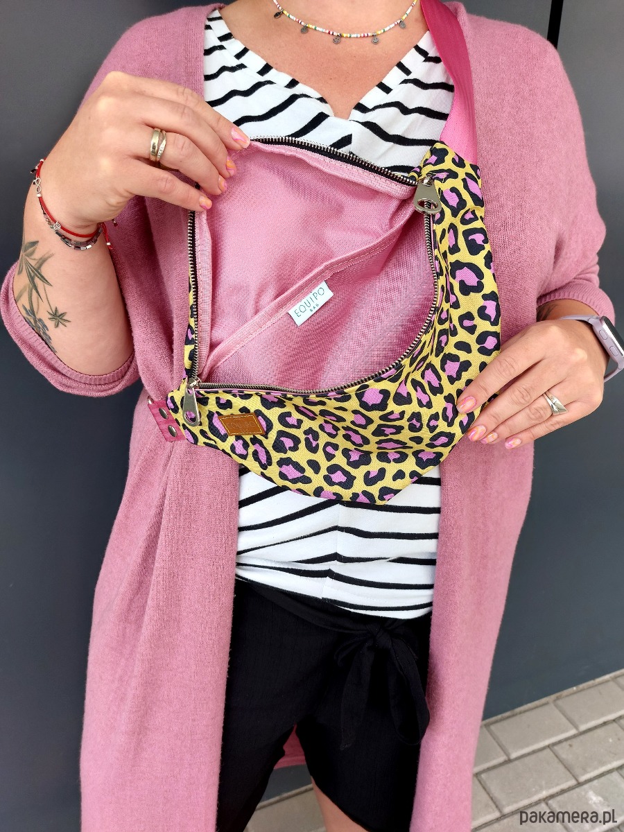 Welur, ortalion wnętrze, pas nośny 2,5cm ekoskóra, srebrny karabińczyk kaletniczy, wodoodporna
