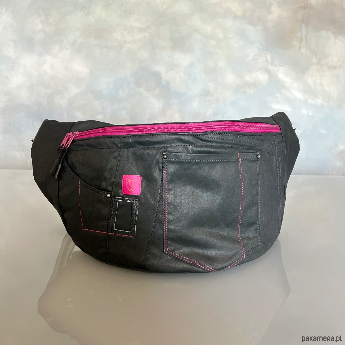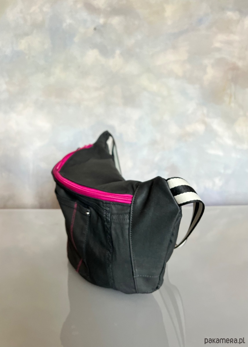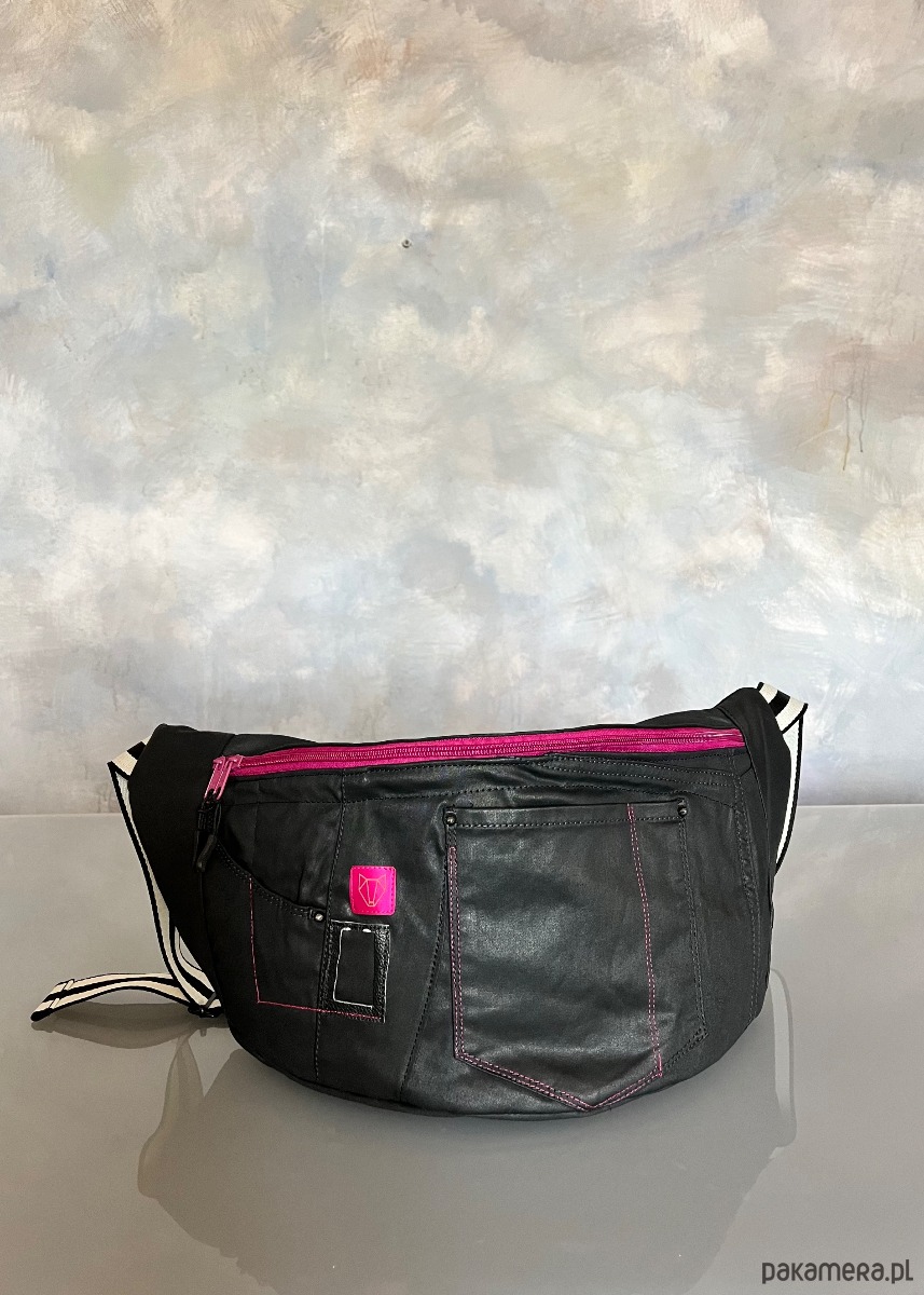 Upcyklingowa duża nerka, w całości wykonana z ze spodni jeansów z second hand – dając nowe życie wyrzuconym materiałom i zamieniając je w nowoczesną i ekologiczną torebkę. Każda nerka jest pojedynczym egzemplarzem. Ta jest w kolorze czarnym z różowymi akcentami.