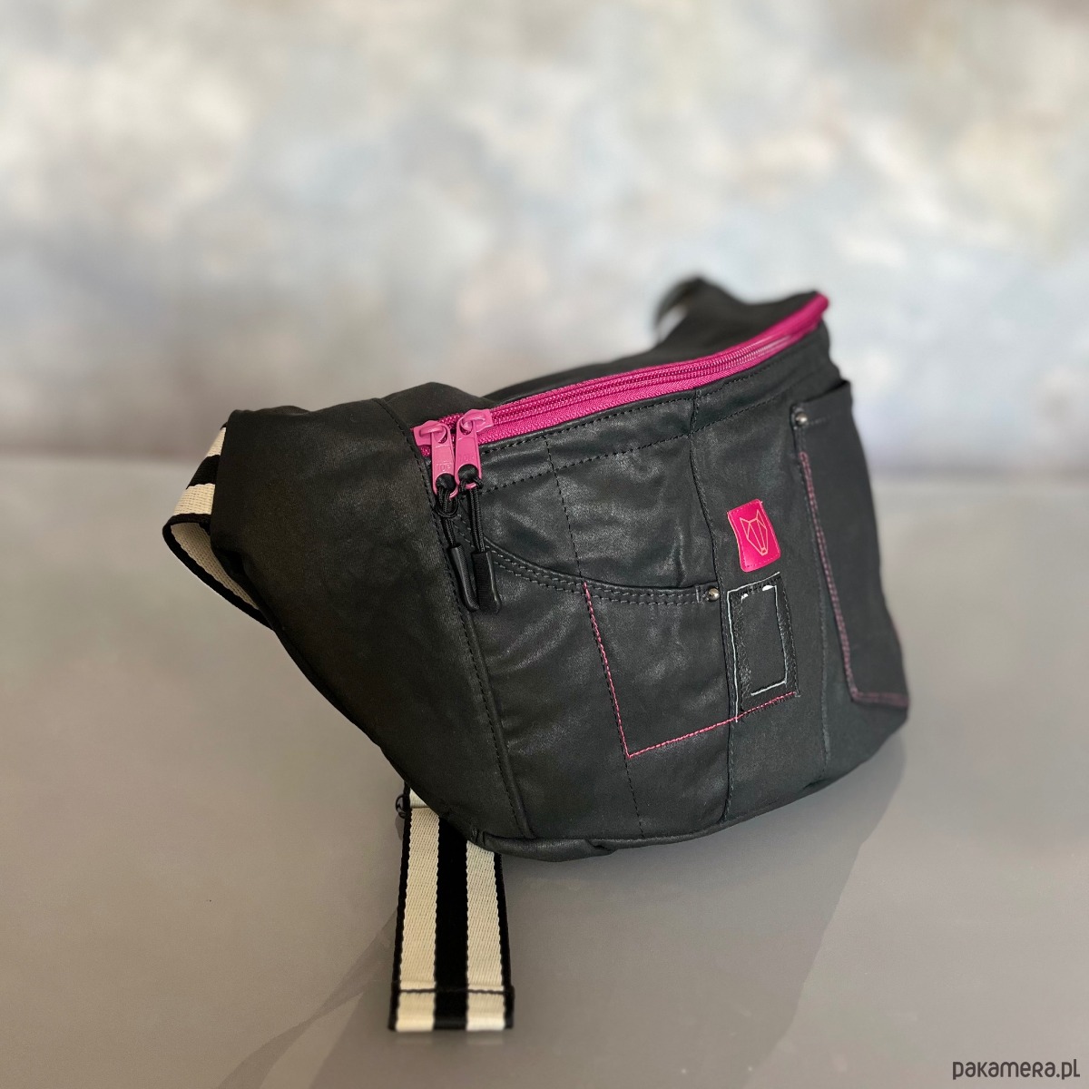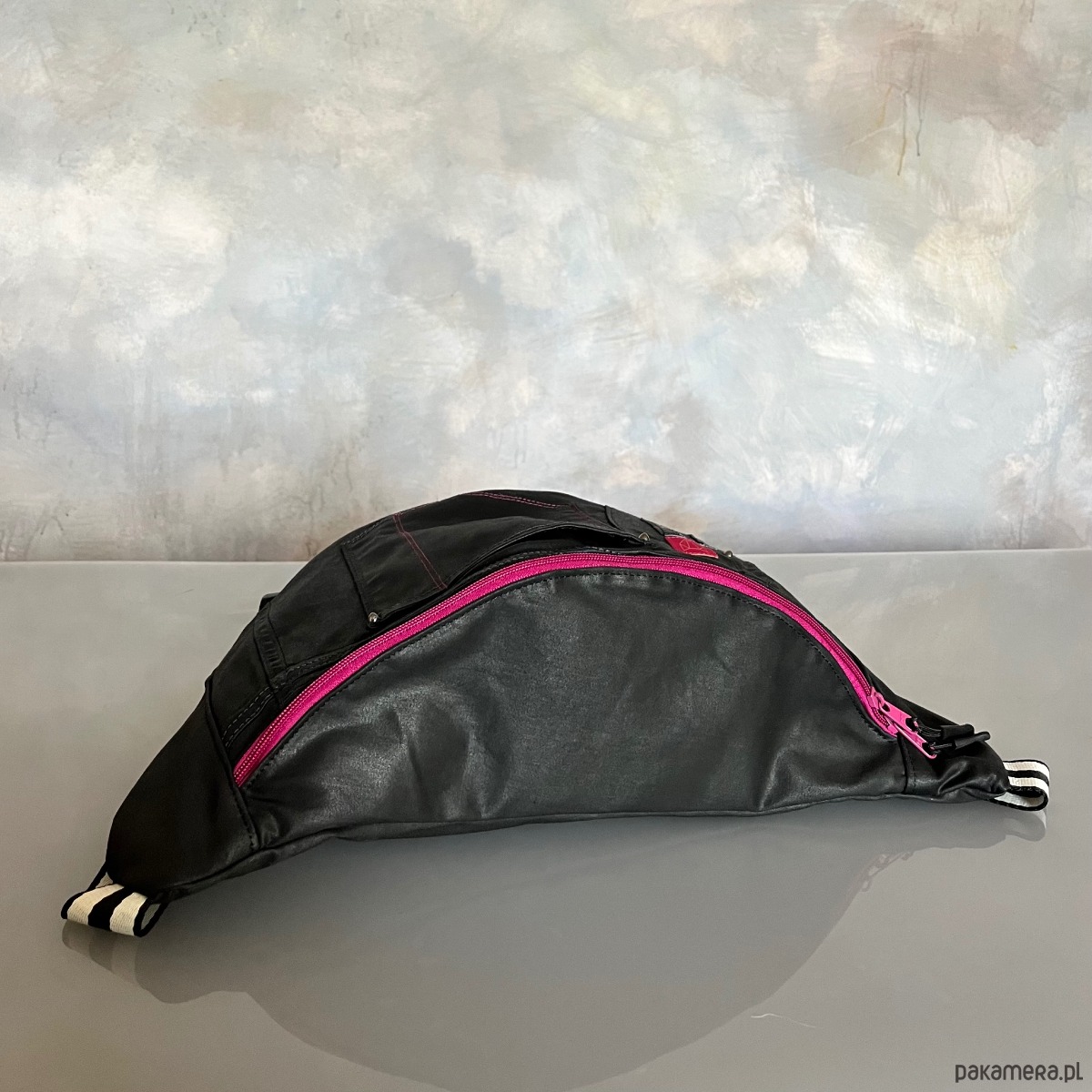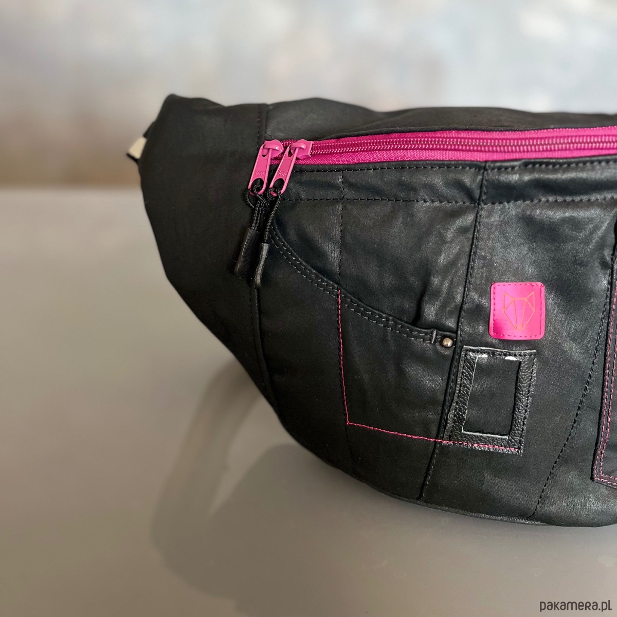 Upcyklingowa duża nerka, w całości wykonana z ze spodni jeansów z second hand – dając nowe życie wyrzuconym materiałom i zamieniając je w nowoczesną i ekologiczną torebkę. Każda nerka jest pojedynczym egzemplarzem. Ta jest w kolorze czarnym z różowymi akcentami.