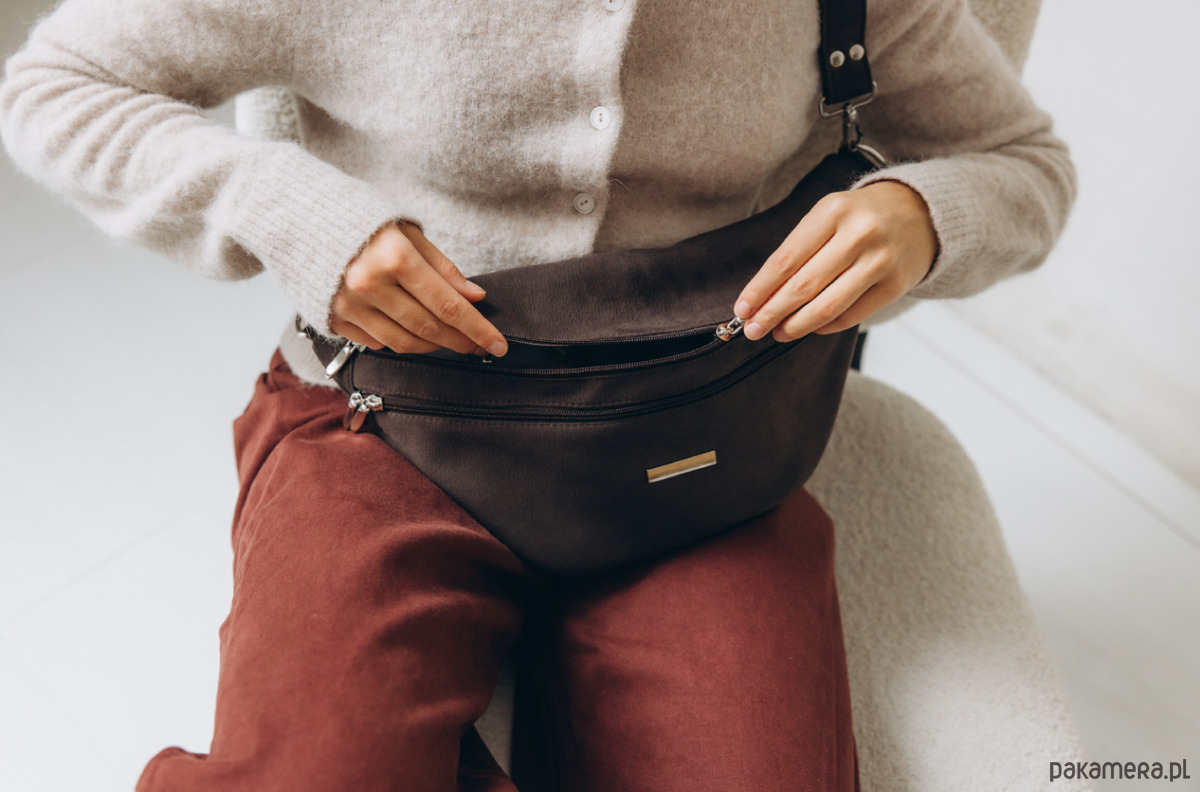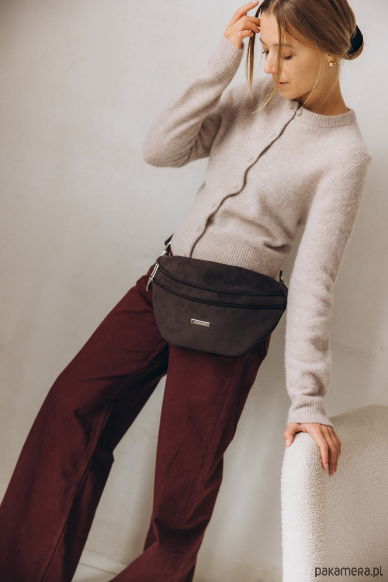 Nerka XL z grubego nubuku tapicerskiego. Do noszenia klasycznie na biodrach, lub na skos (dwa paski do wyboru).