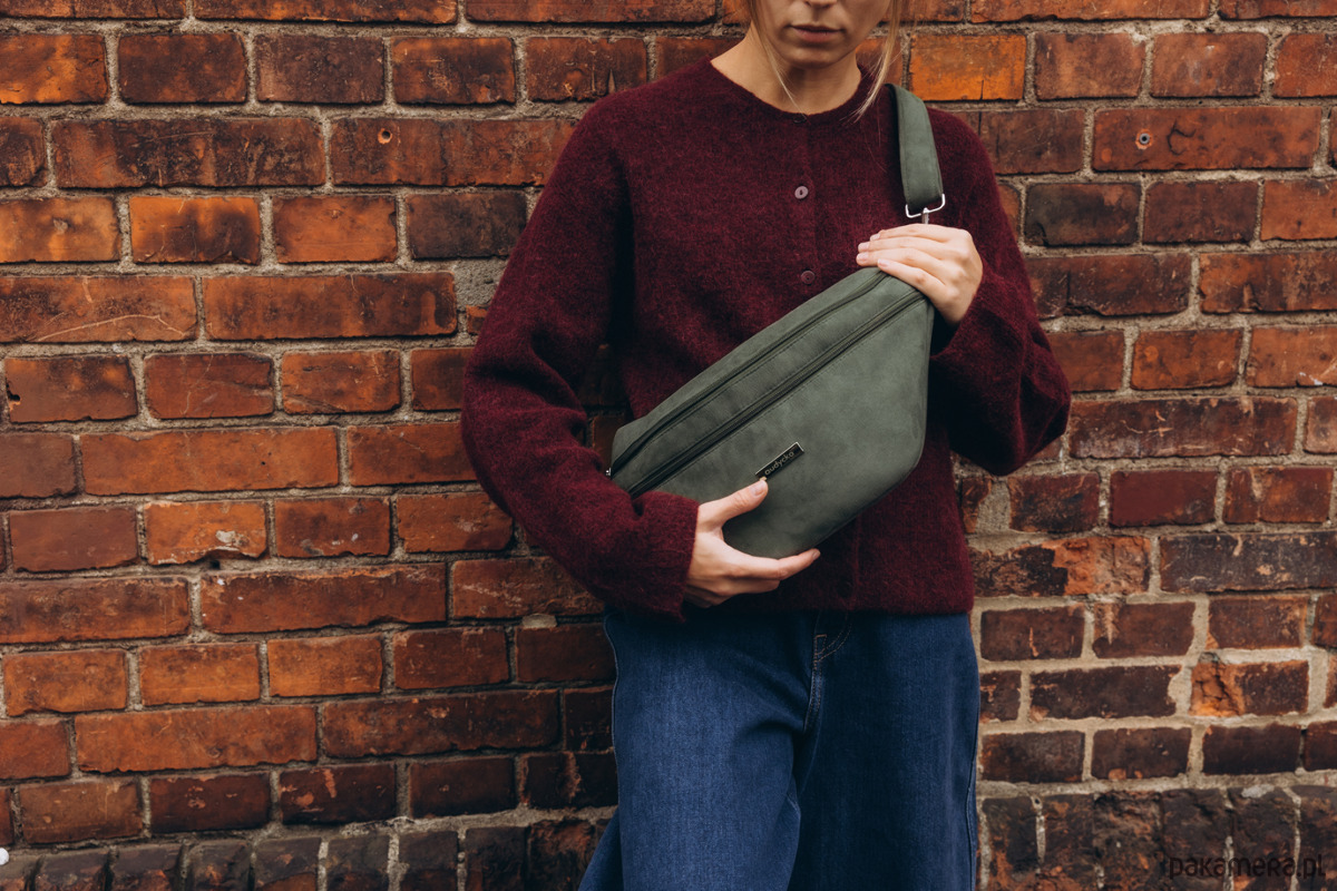 Nerka XL z grubego nubuku tapicerskiego. Do noszenia klasycznie na biodrach, lub na skos (dwa paski do wyboru).