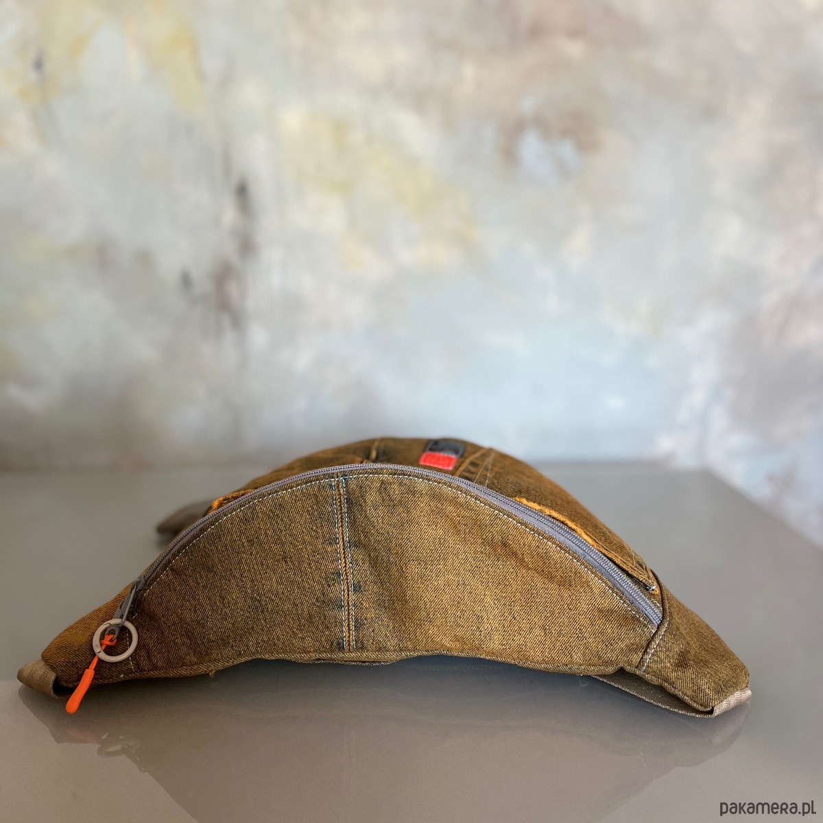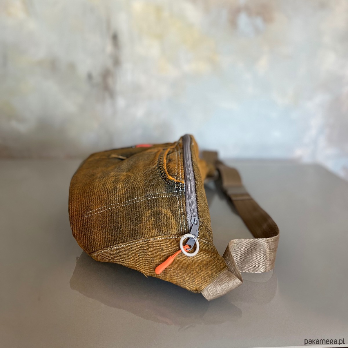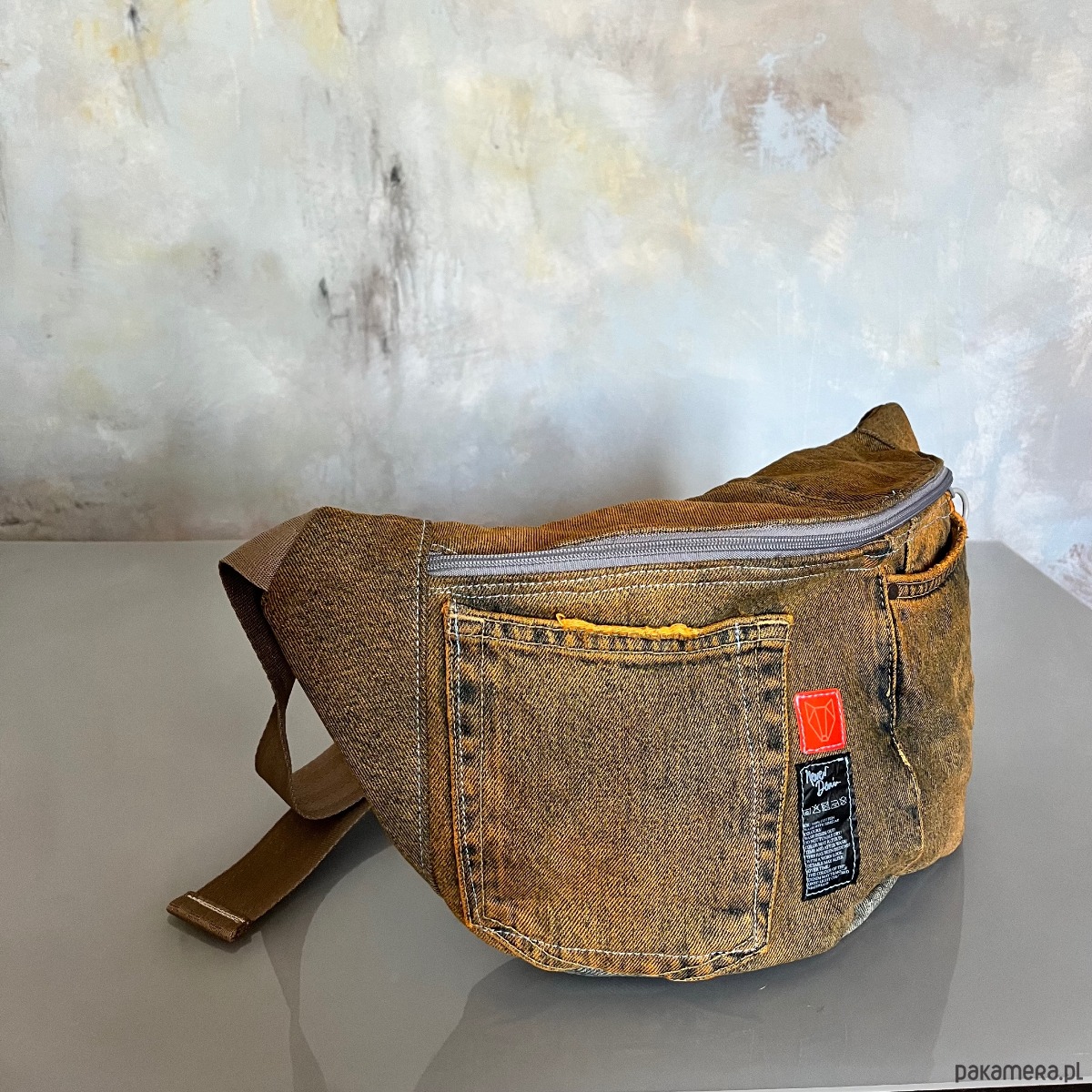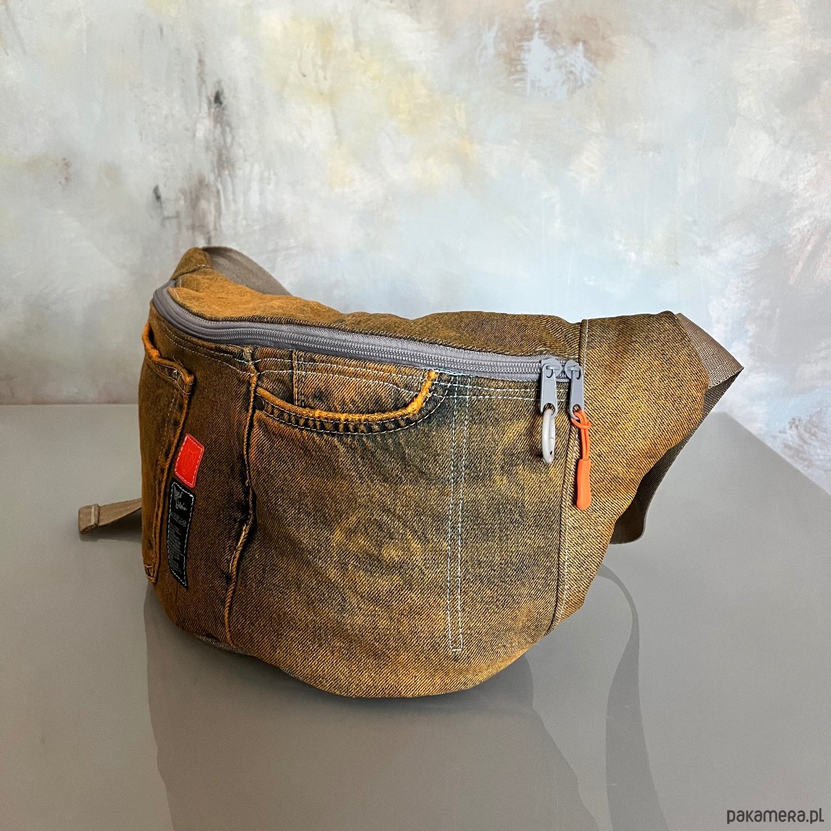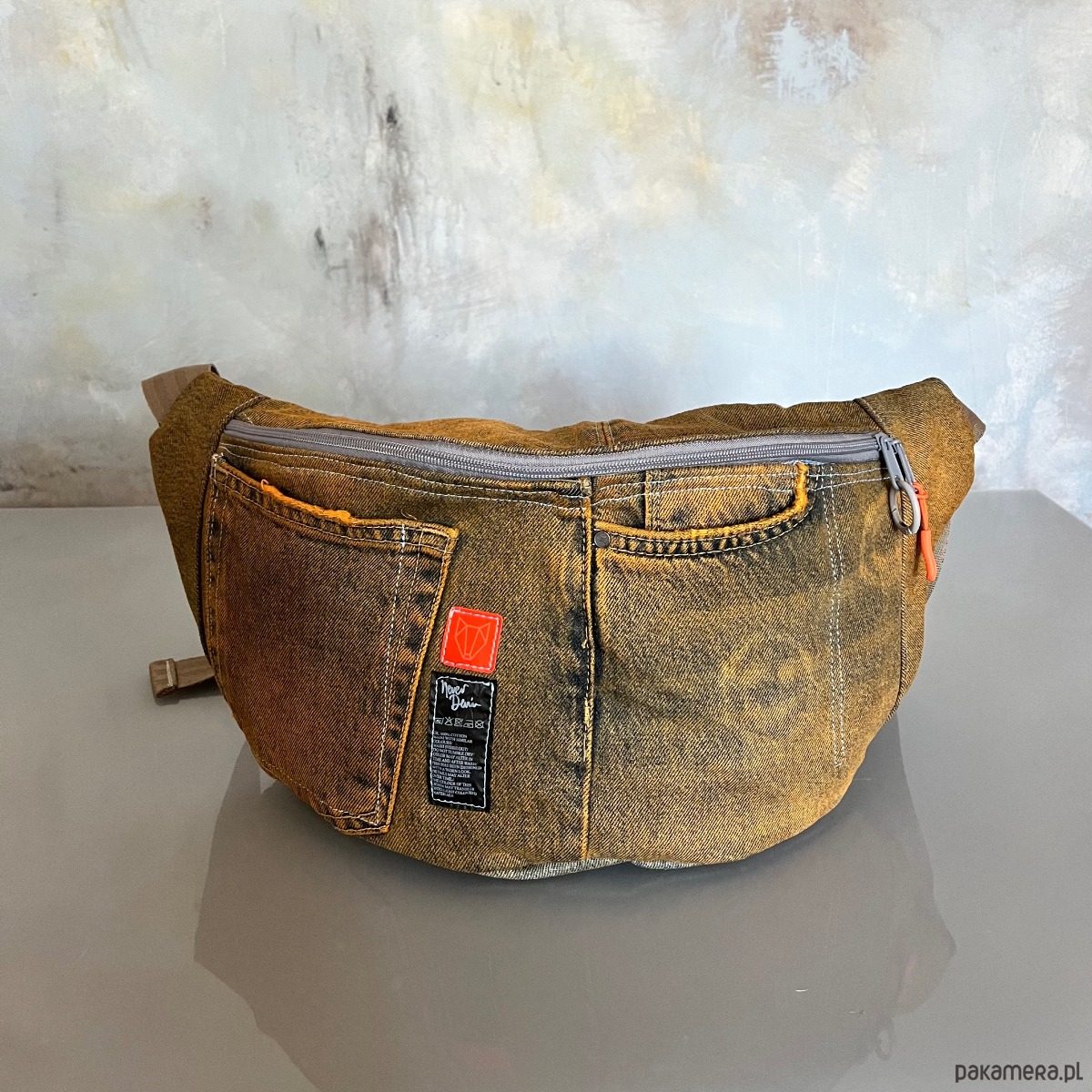 Upcyklingowa duża nerka, w całości wykonana z ze spodni jeansów z second hand – dając nowe życie wyrzuconym materiałom i zamieniając je w nowoczesną i ekologiczną torebkę. Każda nerka jest pojedynczym egzemplarzem. Ta jest w kolorze pomarańczowym. Jest ręcznie farbowana.