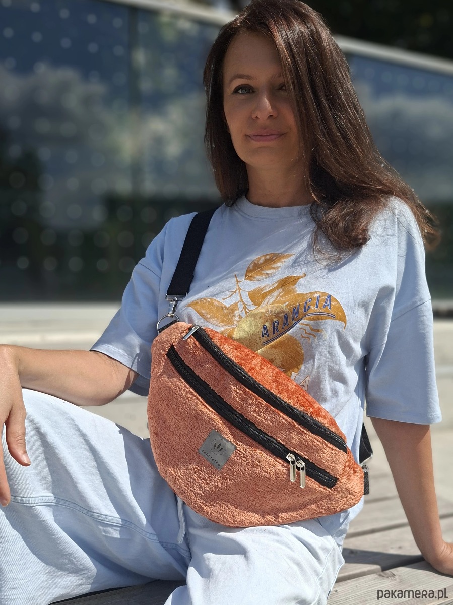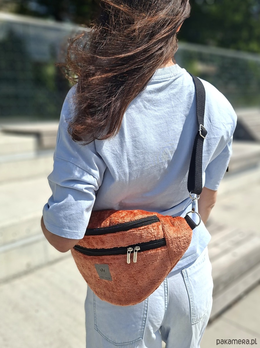 Bardzo duża nerka torebka damska z grubej tkaniny o wyjątkowej, pluszowej fakturze.