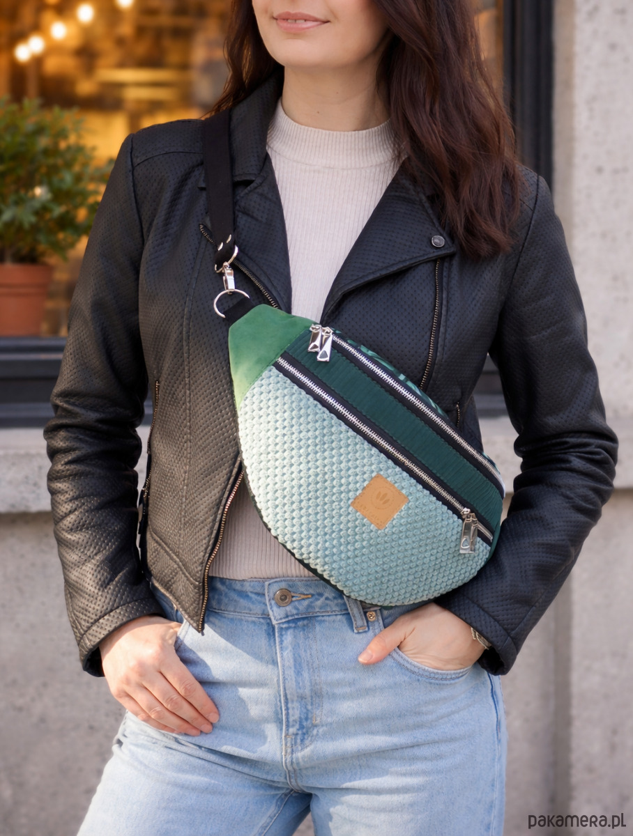 Bardzo duża nerka torebka damska z łączonych materiałów.