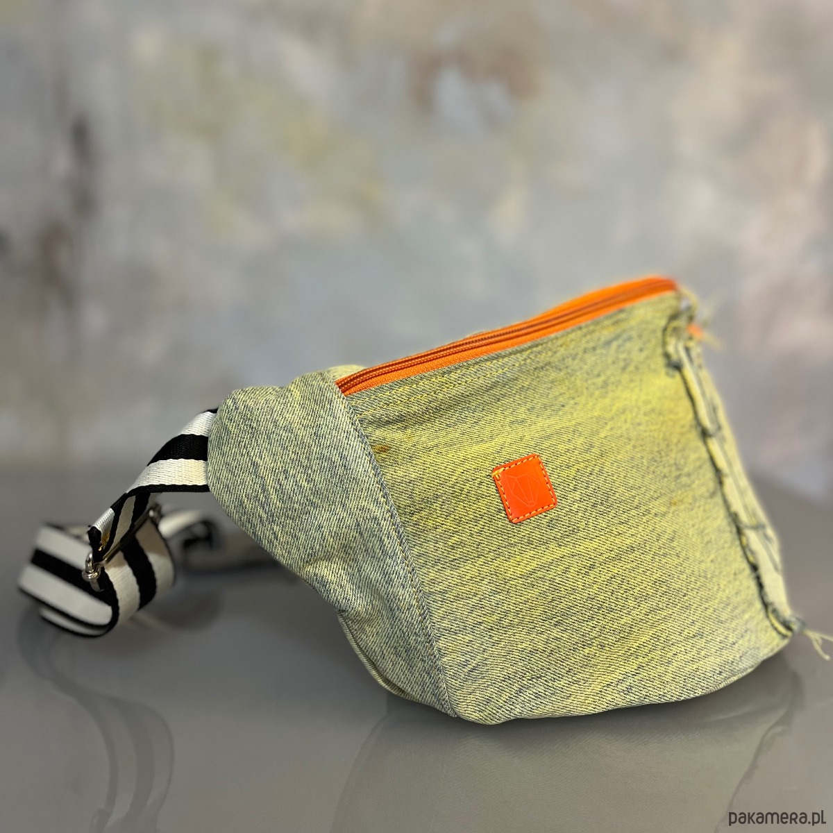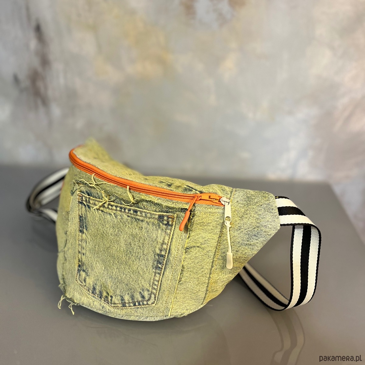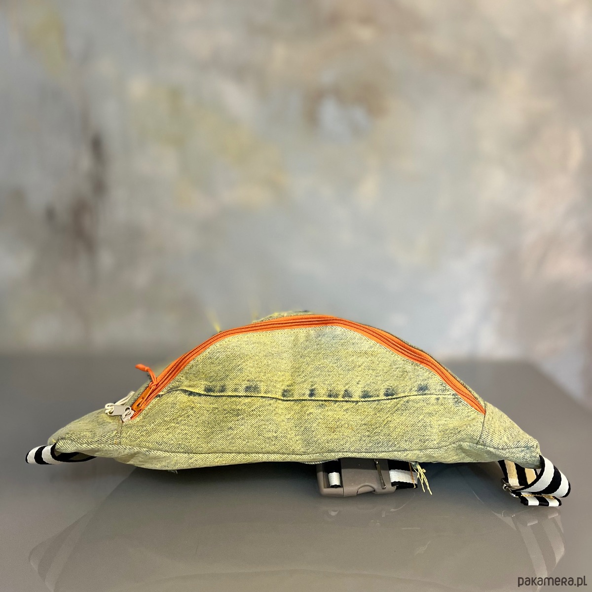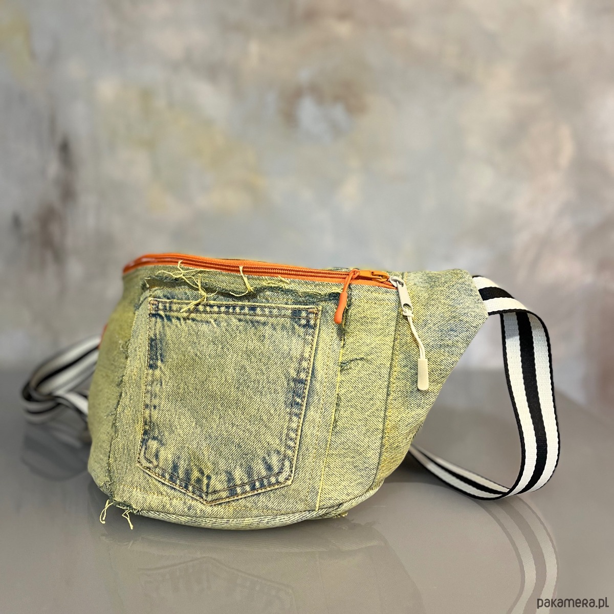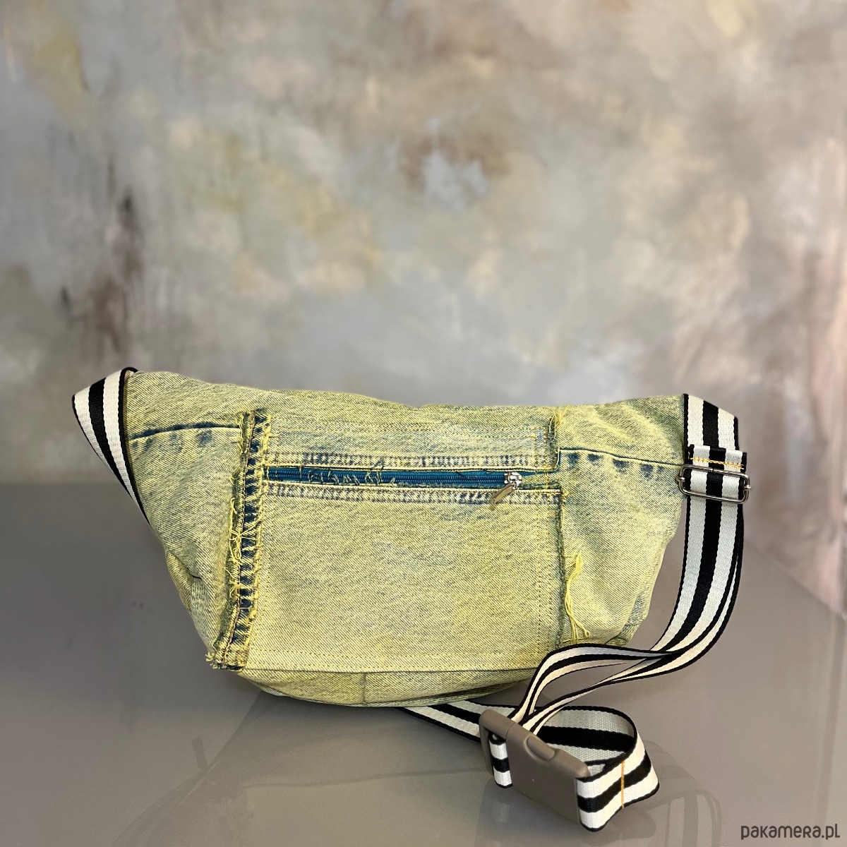 Upcyklingowa, duża nerka. Powstała z czyichś dawnych jeansów – takich, które już coś widziały, coś przeżyły, a teraz dostały nowe życie. Cała uszyta z materiału z second handu, ręcznie barwionego. Ten egzemplarz ma kolor słonecznej zieleni, jak światło przechodzące przez liście w środku dnia. Każda z nich rodzi się w mojej pracowni i żadna nie jest taka sama. To małe, materialne „tylko jedno”.