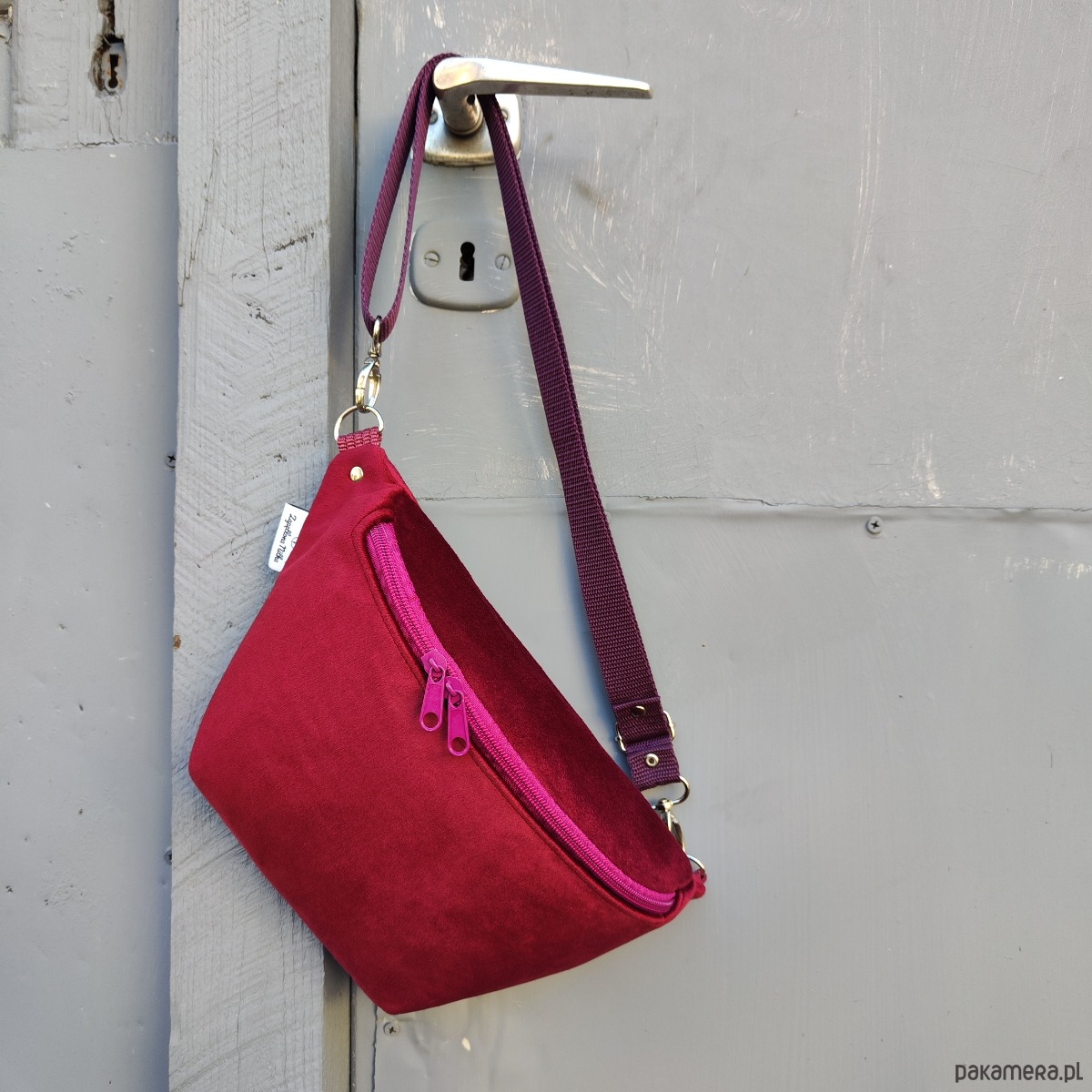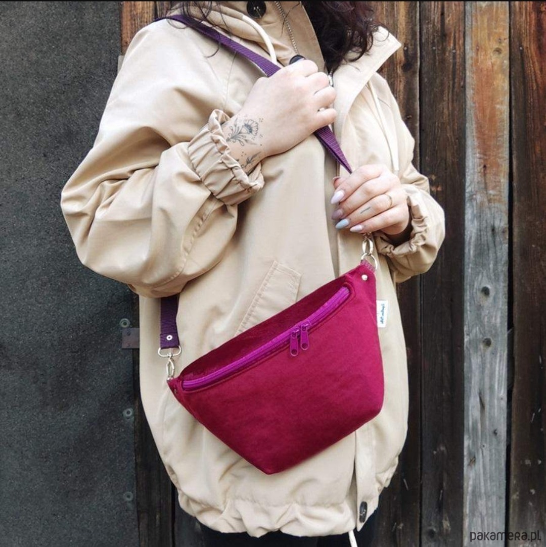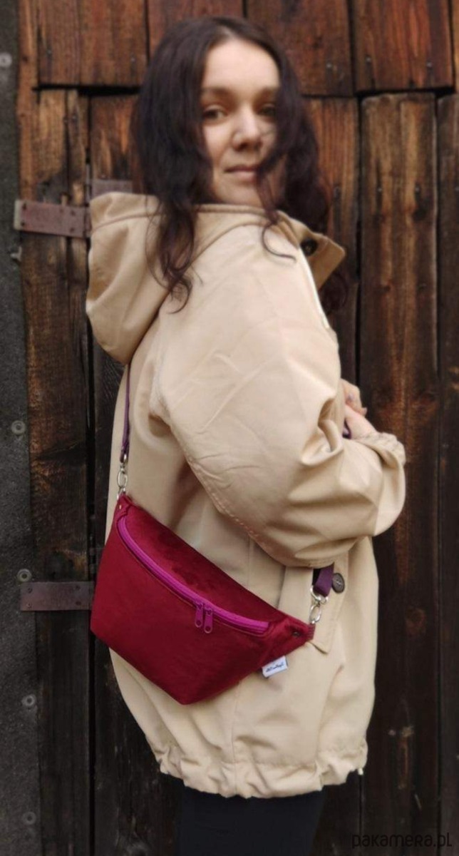 Nerka uszyta w całości z aksamitu kolor soczysta czerwień oraz bawełny (podszewka w środku nerki). Regulowany pasek nośny z możliwością wymiany (nerka posiada po bokach 2 metalowe półkola, które umożliwiają szybkie zapinanie/ wymianę paska np. na inny kolor). Wymiary: 32cmx18cmx7cm (klapa), +/-1cm .W środku kieszonka zapinana na zamek. Obwód paska wraz z nerką ma wymiary: minimum 95cm obwód, max 140cm obwód (jeśli interesuje Cię inny obwód lub inny kolor paska napisz do mnie wiadomość). W komplecie do nerki pasek widoczny na zdjęciach.