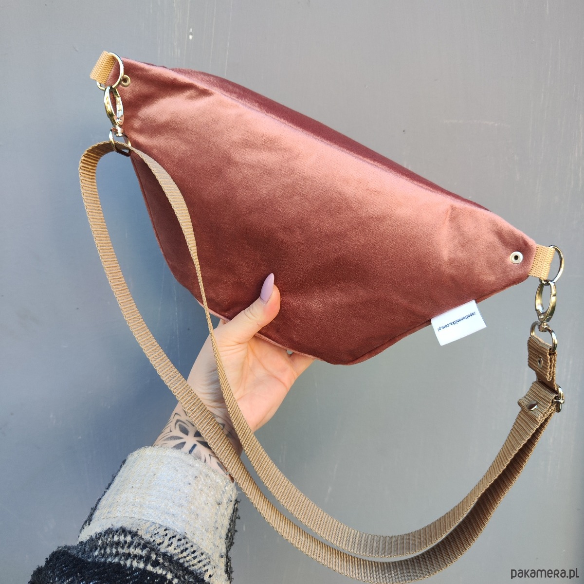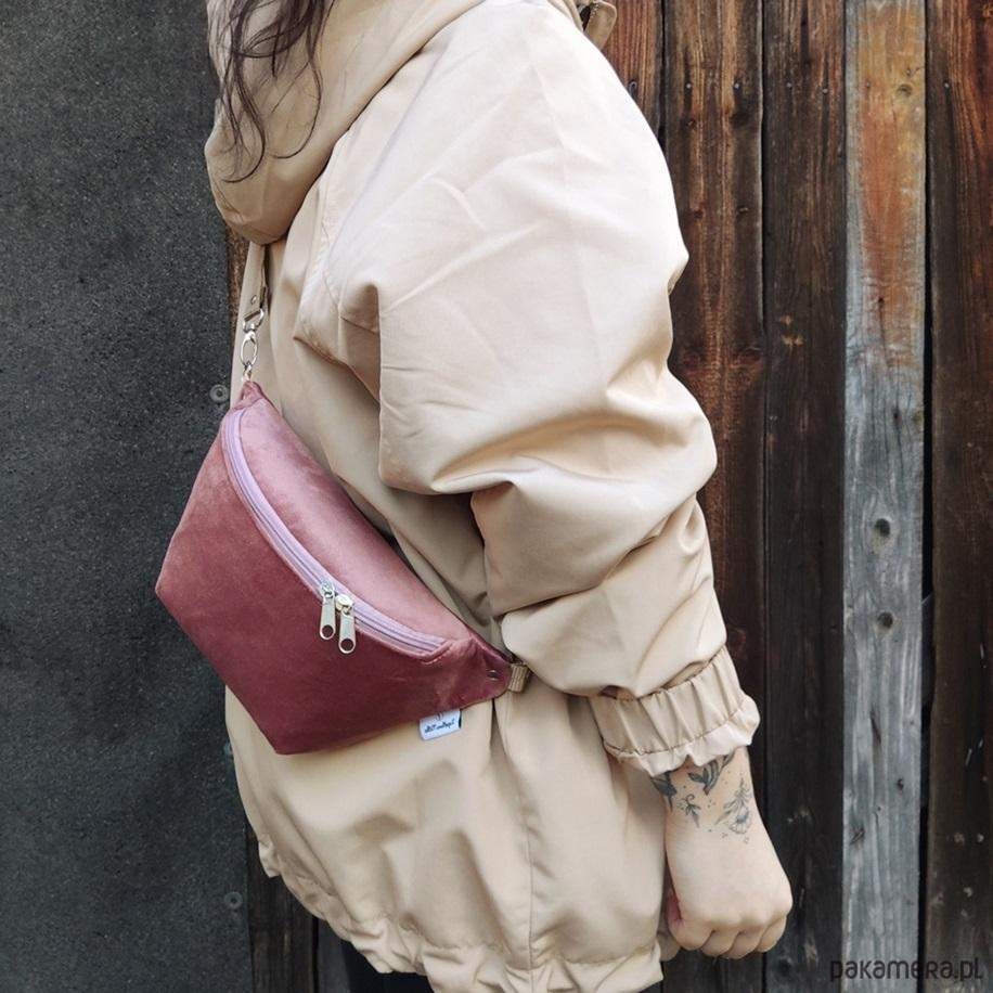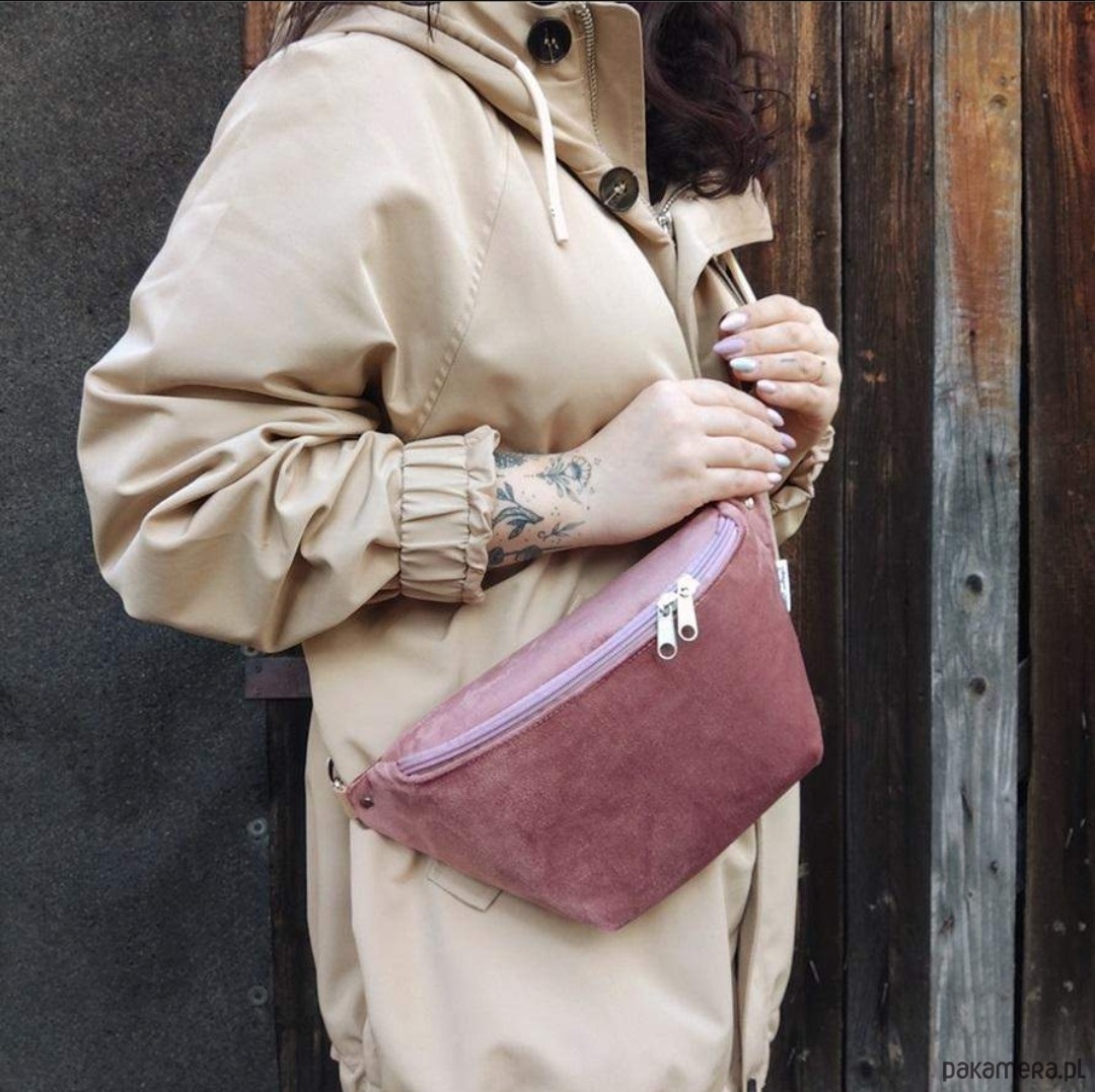 Nerka uszyta w całości z aksamitu kolor pudrowy zgaszony róż oraz bawełny (podszewka w środku nerki). Regulowany pasek nośny z możliwością wymiany (nerka posiada po bokach 2 metalowe półkola, które umożliwiają szybkie zapinanie/ wymianę paska np. na inny kolor). Wymiary: 32cmx18cmx7cm (klapa), +/-1cm .W środku kieszonka zapinana na zamek. Obwód paska wraz z nerką ma wymiary: minimum 95cm obwód, max 140cm obwód (jeśli interesuje Cię inny obwód lub inny kolor paska napisz do mnie wiadomość). W komplecie do nerki pasek widoczny na zdjęciach.