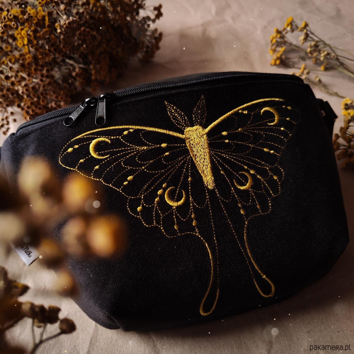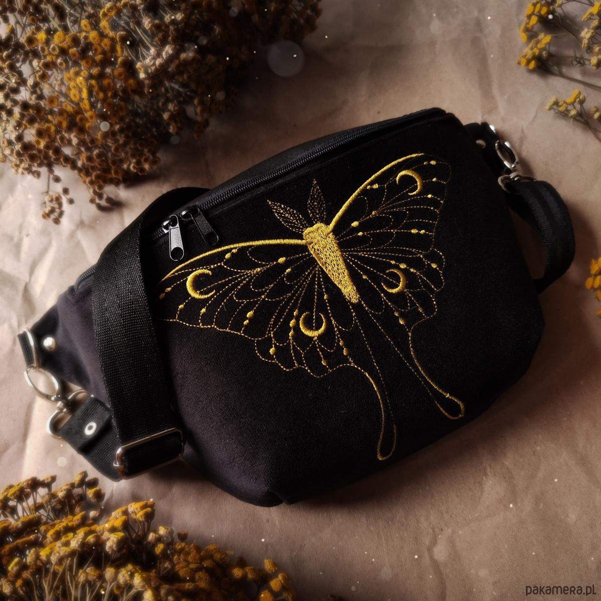 nerka uszyta z czarnego eko zamszyku (przód nerki), eko skóry czarnej (tył i klapa nerki) oraz bawełny (podszewka) - tył nerki z eko skóry kolor czarny, tkanina jest śliska dzięki czemu nerka nie czepi się naszego ubrania - na przodzie haft komputerowy - regulowany pasek nośny z możliwością wymiany (nerka posiada po bokach 2 metalowe półkola, które umożliwiają szybkie zapinanie/ wymianę paska np. na inny kolor) - wymiary: 32cmx18cmx7cm(klapa) - w środku kieszonka w formie przegródki na tylnej ściance - obwód paska wraz z nerką ma wymiary: minimum 95cm obwód, max 140cm obwód (jeśli interesuje Cię inny obwód paska napisz do mnie wiadomość)
