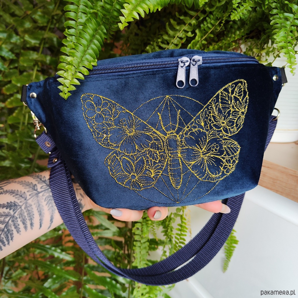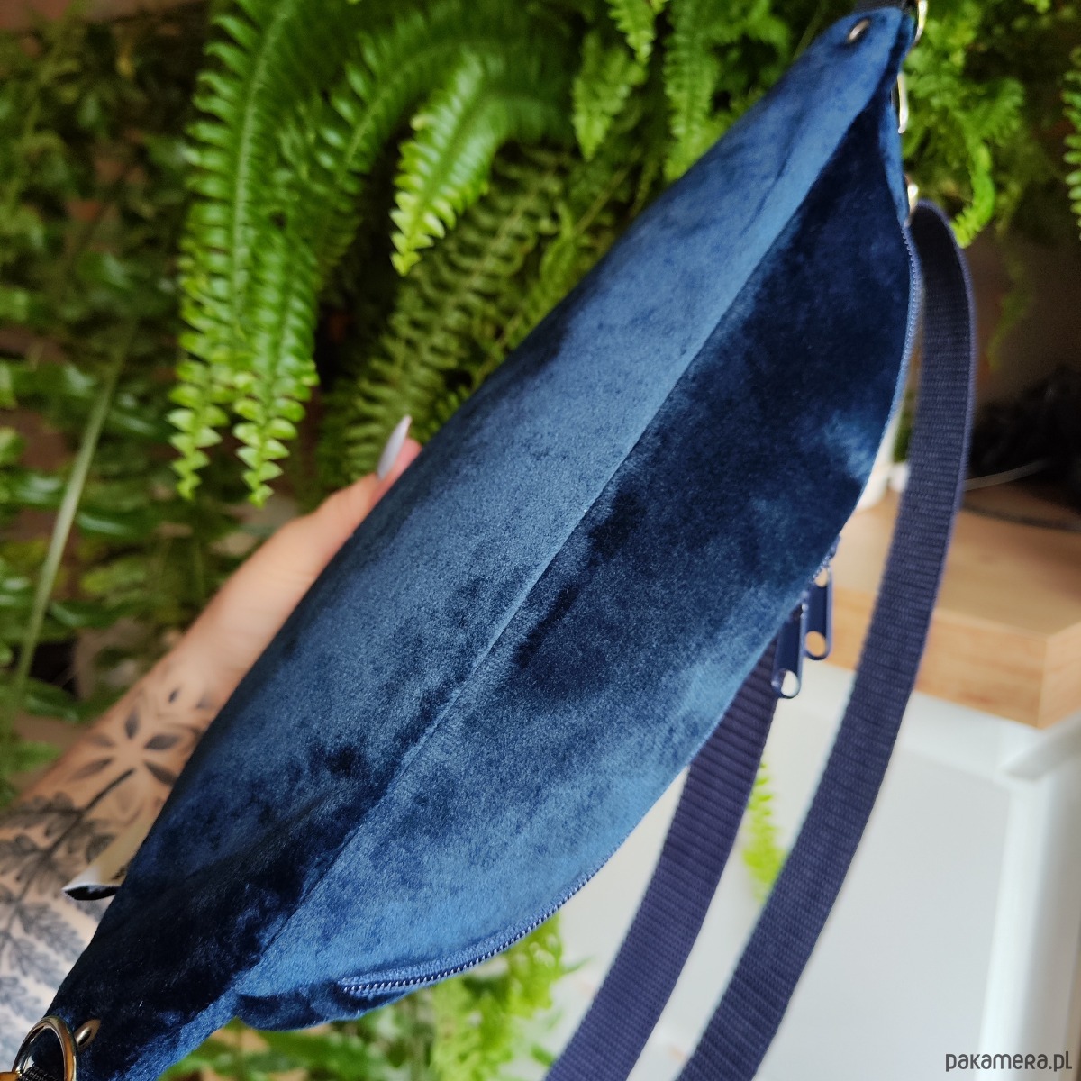 Nerka uszyta z aksamitu granatowego oraz bawełny. Na przodzie haft komputerowy. Regulowany pasek nośny z możliwością wymiany (nerka posiada po bokach 2 metalowe półkola, które umożliwiają szybkie zapinanie/ wymianę paska np. na inny kolor). Wymiary: 32cmx17cmx7cm (klapa). Kieszonka w formie przegródki na tylnej ściance (środek nerki). Obwód paska wraz z nerką ma wymiary: minimum 95cm obwód, max 140cm obwód (jeśli interesuje Cię inny obwód paska napisz do mnie wiadomość). W komplecie pasek czarny szeroki na 2,5cm.