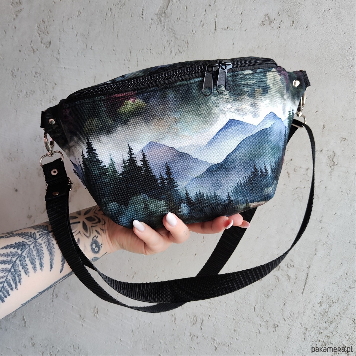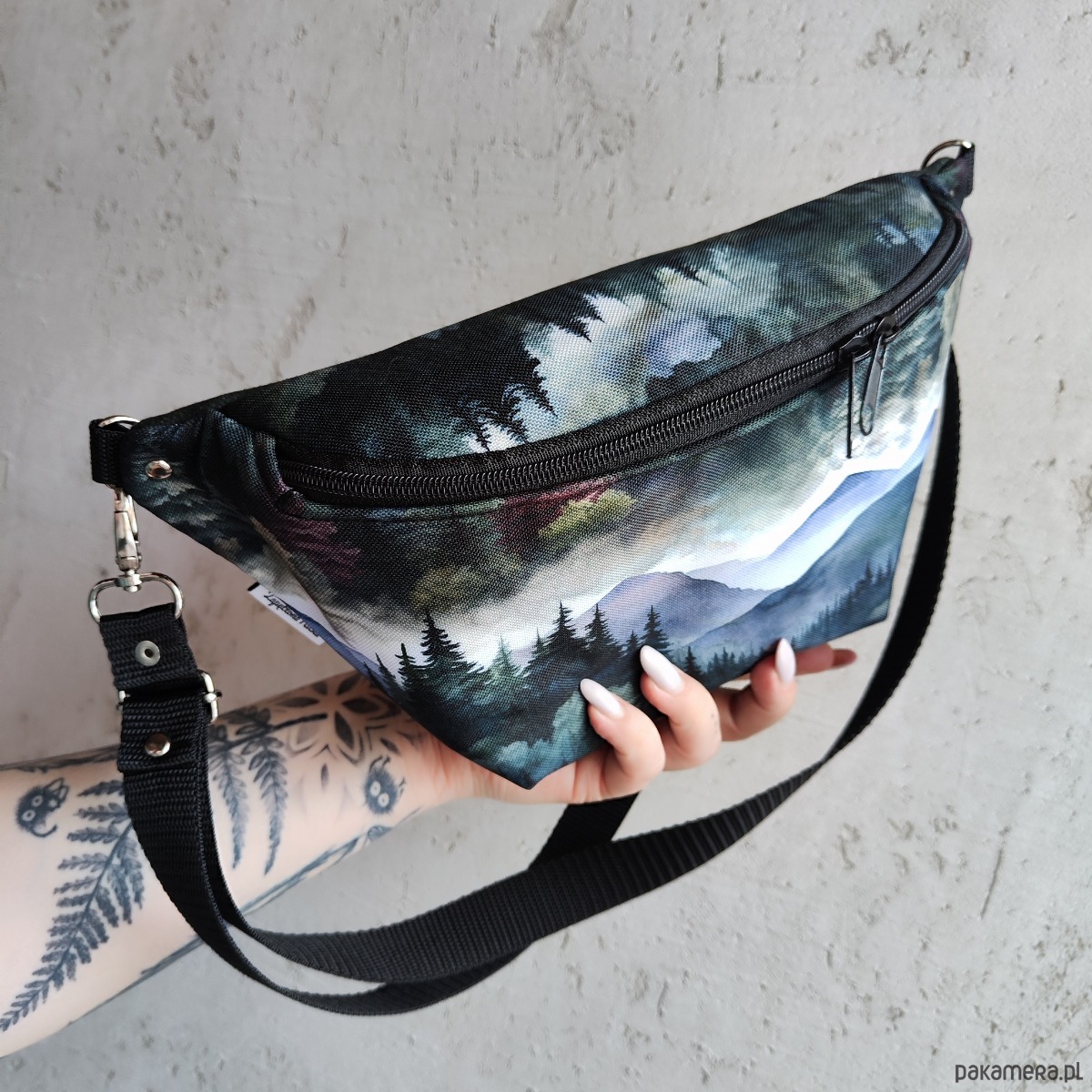 Nerka uszyta z poliestru wodoodpornego z wyjątkowym unikatowym nadrukiem ''las i góry'' (przód i klapa nerki), tkaniny tapicerskiej w kolorze ciemnej zieleni (tył nerki). Regulowany pasek nośny z możliwością wymiany (nerka posiada po bokach 2 metalowe półkola, które umożliwiają szybkie zapinanie/ wymianę paska np. na inny kolor). Wymiary: 32cmx17cmx7cm (klapa). W środku nerki kieszonka przegródka oraz kieszonka zapinana na zamek. Obwód paska wraz z nerką ma wymiary: minimum 95cm obwód, max 140cm obwód (jeśli interesuje Cię inny obwód paska napisz do mnie wiadomość. W komplecie pasek widoczny na zdjęciach szeroki na 2,5cm.