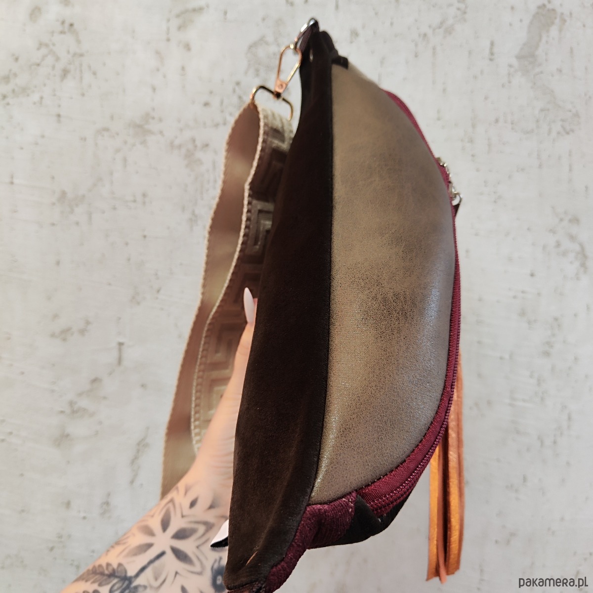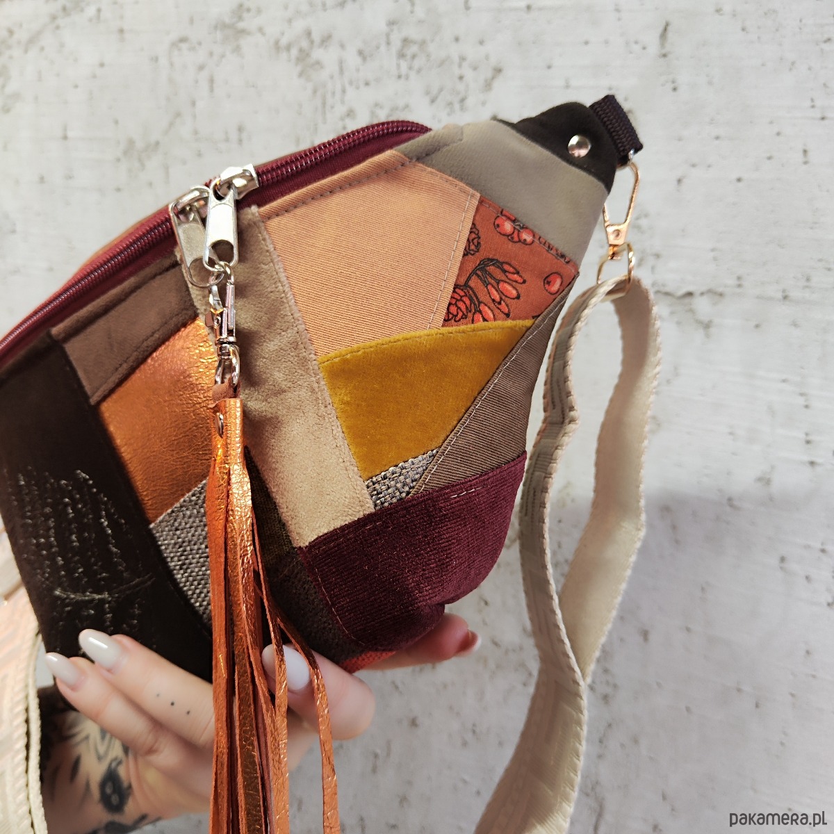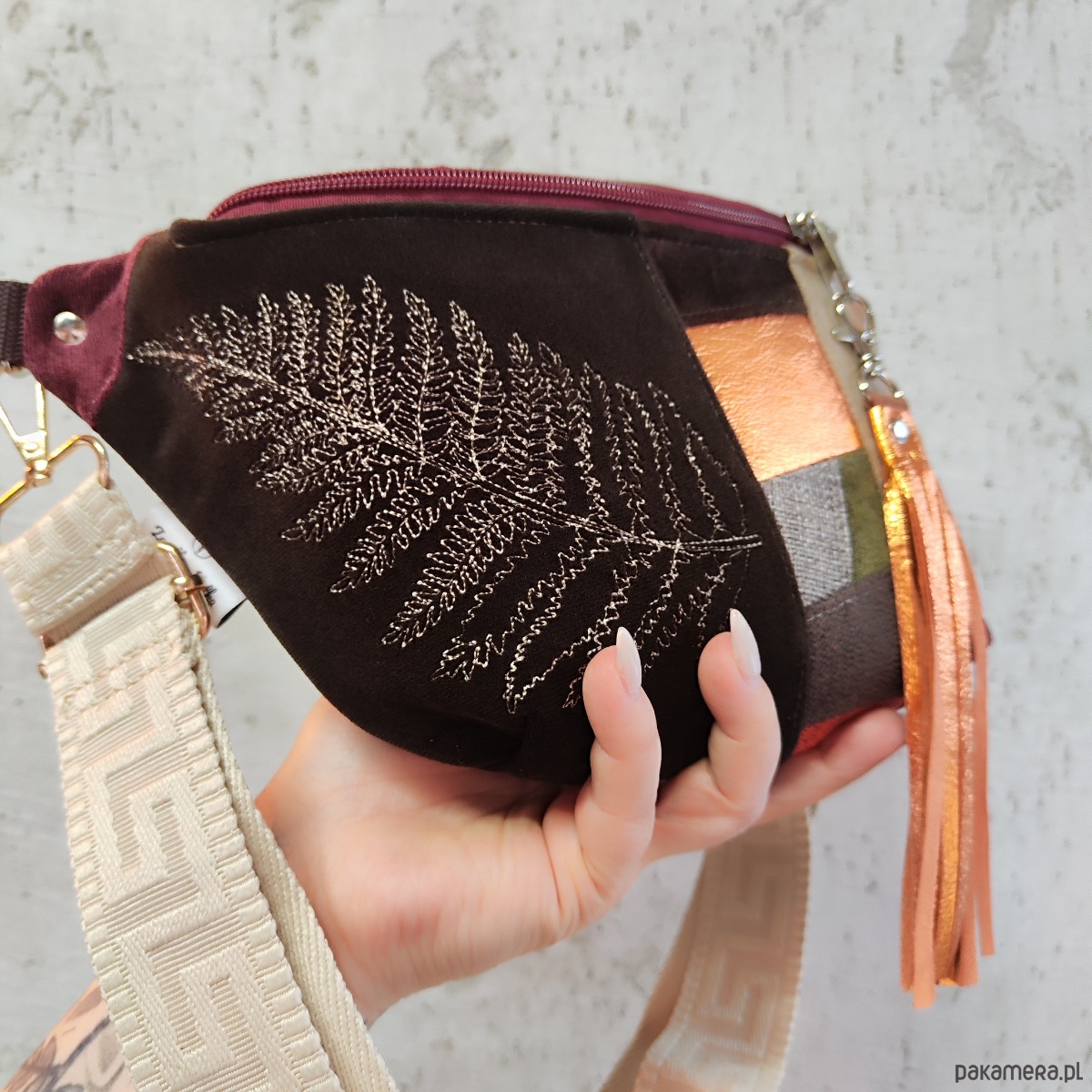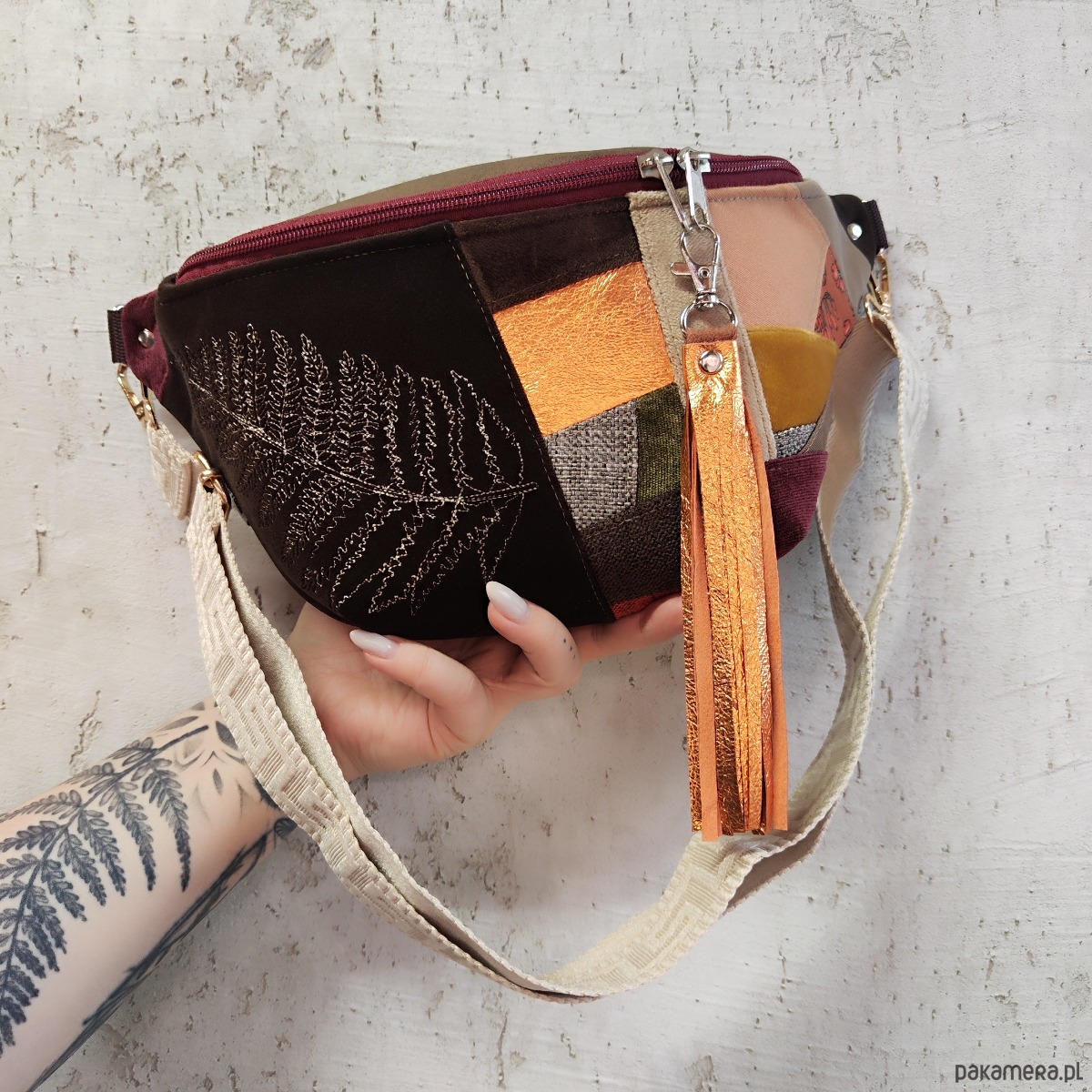 Nerka XXL UNIKAT- tylko 1 sztuka! Uszyta ze skrawków tkanin pochodzących z innych projektów, żeby nie marnować. Wewnątrz nerki gruba lniana wodoodporna podszewka w kolorze beżowym. Na przodzie nerki haft dekoracyjny liść paproci. Regulowany pasek nośny z możliwością wymiany (nerka posiada po bokach 2 metalowe półkola, które umożliwiają szybkie zapinanie/ wymianę paska np. na inny kolor). Wymiary: 32cmx18cmx7cm (klapa) .W środku kieszonka przegródka. Obwód paska wraz z nerką ma wymiary: minimum 95cm obwód, max 140cm obwód (jeśli interesuje Cię inny obwód lub inny kolor paska napisz do mnie wiadomość).