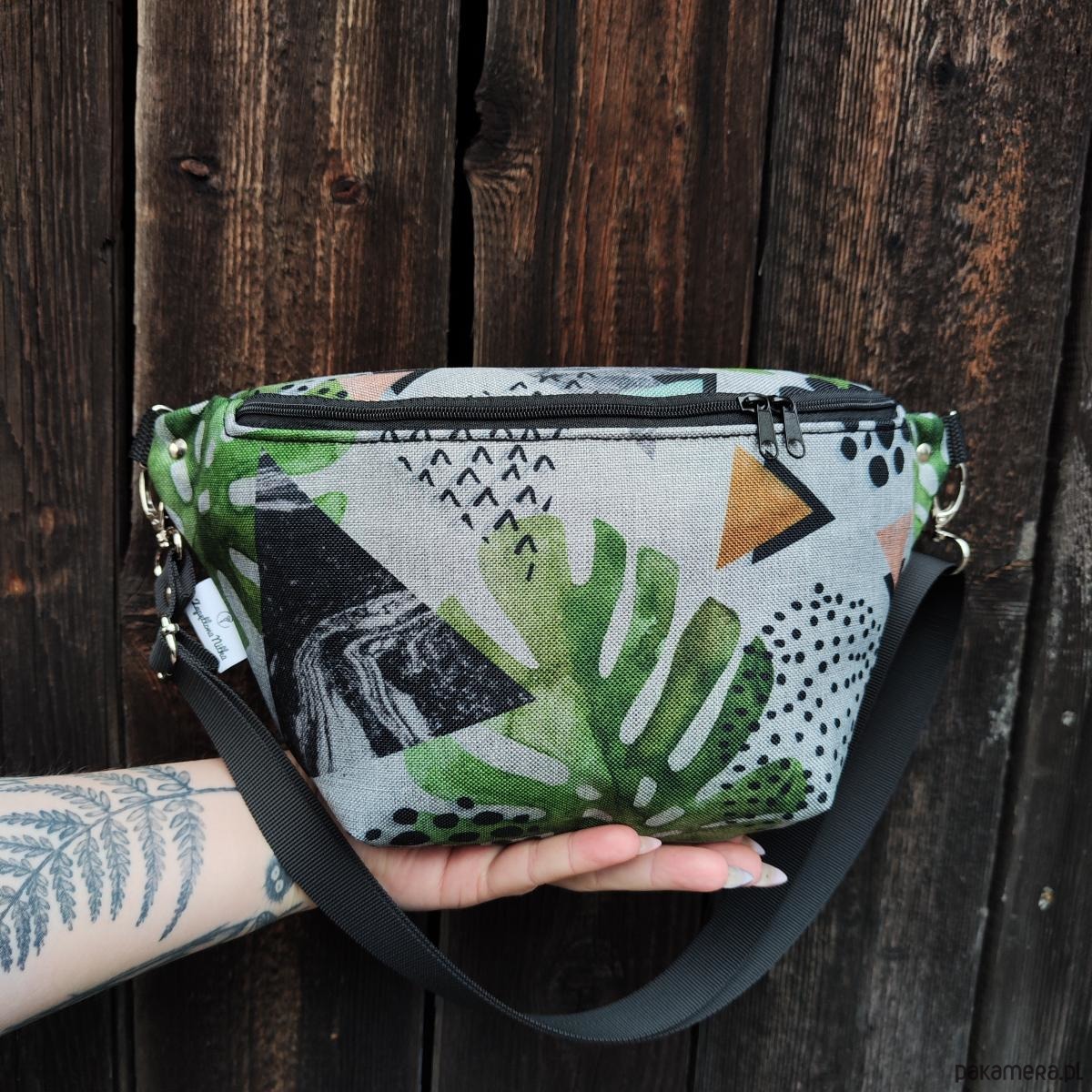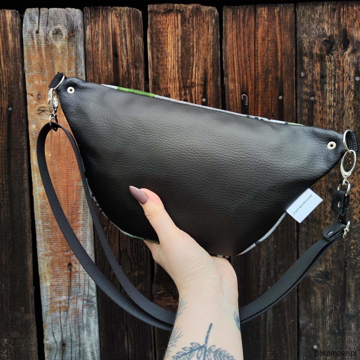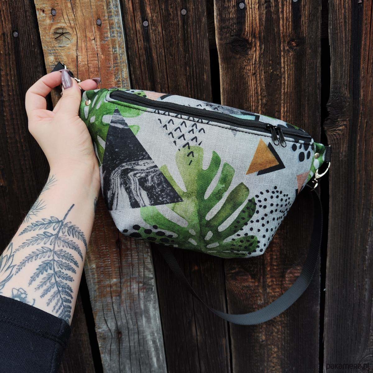 Nerka uszyta z poliestru wodoodpornego (przód i klapa nerki), eko skóry czarnej (tył nerki) oraz bawełny (podszewka). Tył nerki wykonany z eko skórki, tkanina jest śliska, dzięki czemu nerka nie czepi się naszego ubrania. Regulowany pasek nośny z możliwością wymiany (nerka posiada po bokach 2 metalowe półkola, które umożliwiają szybkie zapinanie/ wymianę paska np. na inny kolor). Wymiary: 32cmx18cmx7cm (klapa) .W środku kieszonka zapinana na zamek. Obwód paska wraz z nerką ma wymiary: minimum 95cm obwód, max 140cm obwód (jeśli interesuje Cię inny obwód lub inny kolor paska napisz do mnie wiadomość).