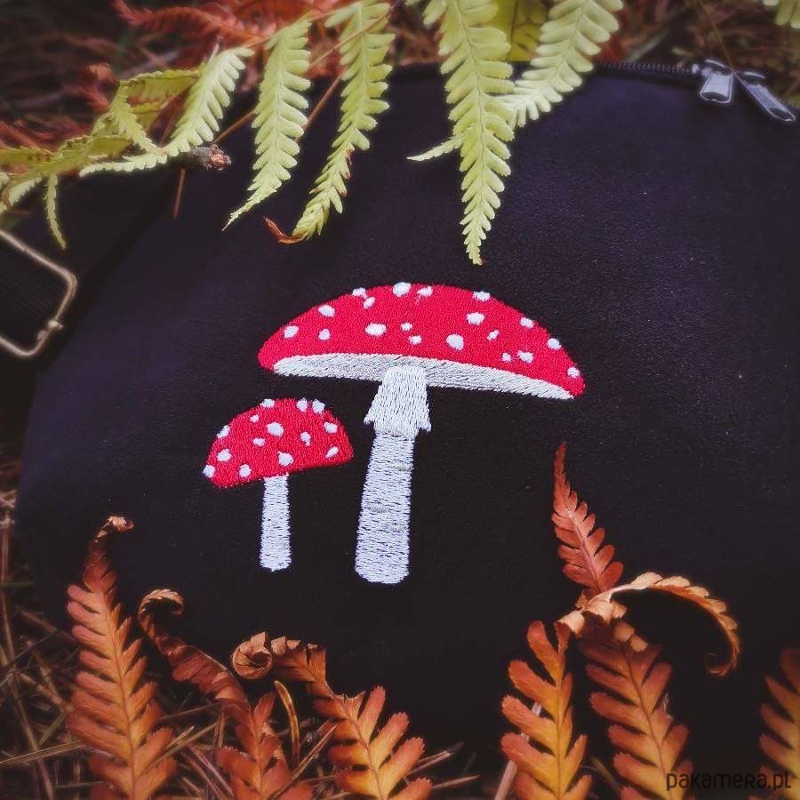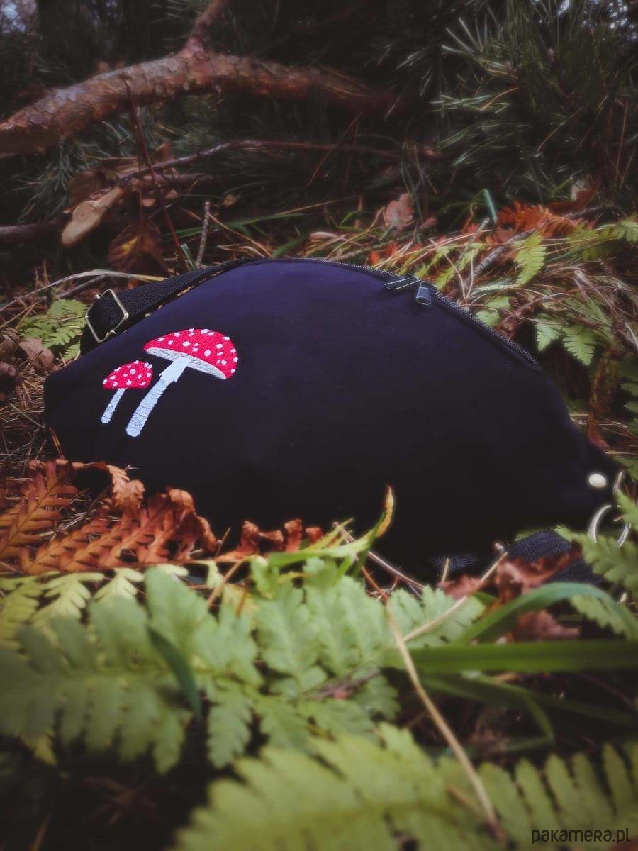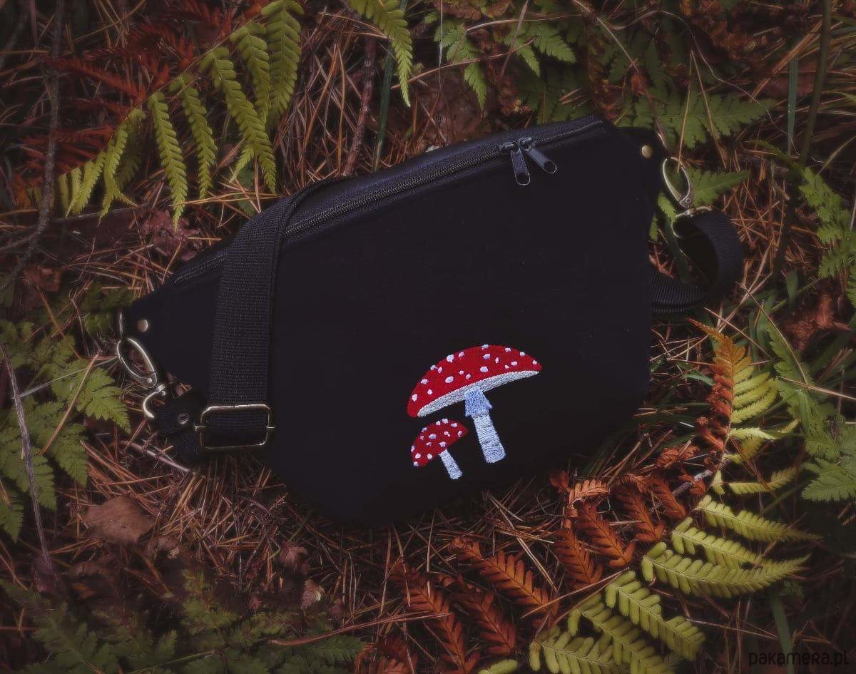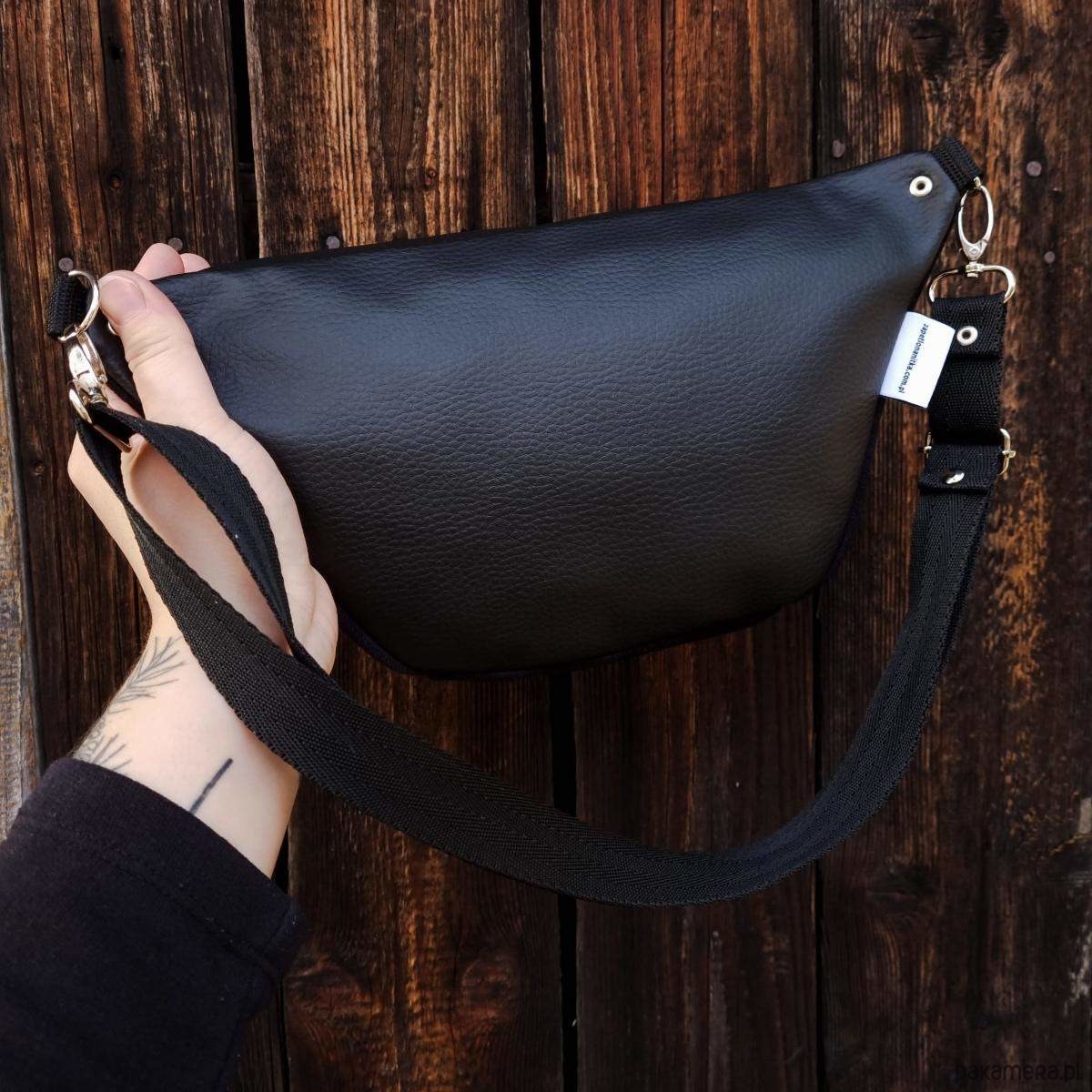 Nerka uszyta z czarnego eko zamszyku (przód nerki), eko skóry czarnej (tył i klapa nerki) oraz poliestru wodoodpornego (podszewka). Tył nerki wykonany z eko skórki, tkanina jest śliska, dzięki czemu nerka nie czepi się naszego ubrania. Regulowany pasek nośny z możliwością wymiany (nerka posiada po bokach 2 metalowe półkola, które umożliwiają szybkie zapinanie/ wymianę paska np. na inny kolor). Wymiary: 32cmx18cmx7cm(klapa) .W środku kieszonka w formie przegródki na tylnej ściance. Obwód paska wraz z nerką ma wymiary: minimum 95cm obwód, max 140cm obwód (jeśli interesuje Cię inny obwód lub inny kolor paska napisz do mnie wiadomość). Na przodzie haft komputerowy. W komplecie do nerki pasek widoczny na zdjęciach.