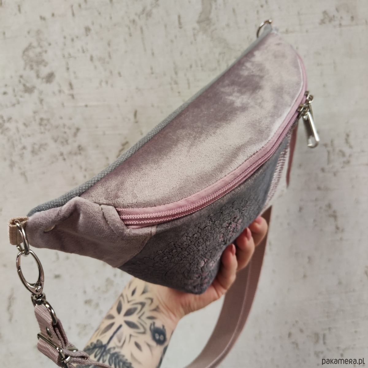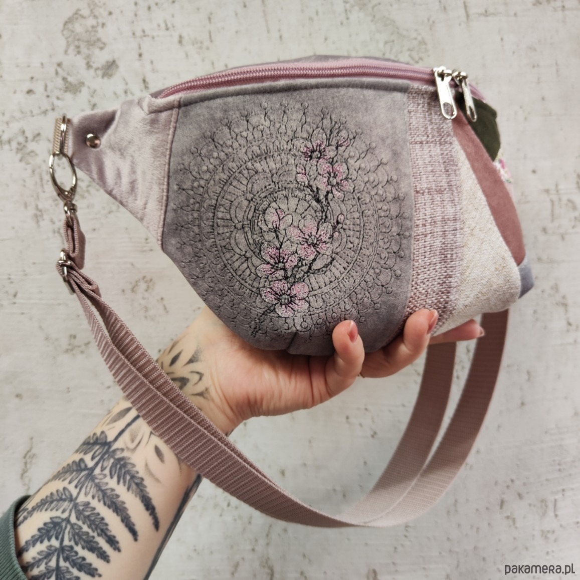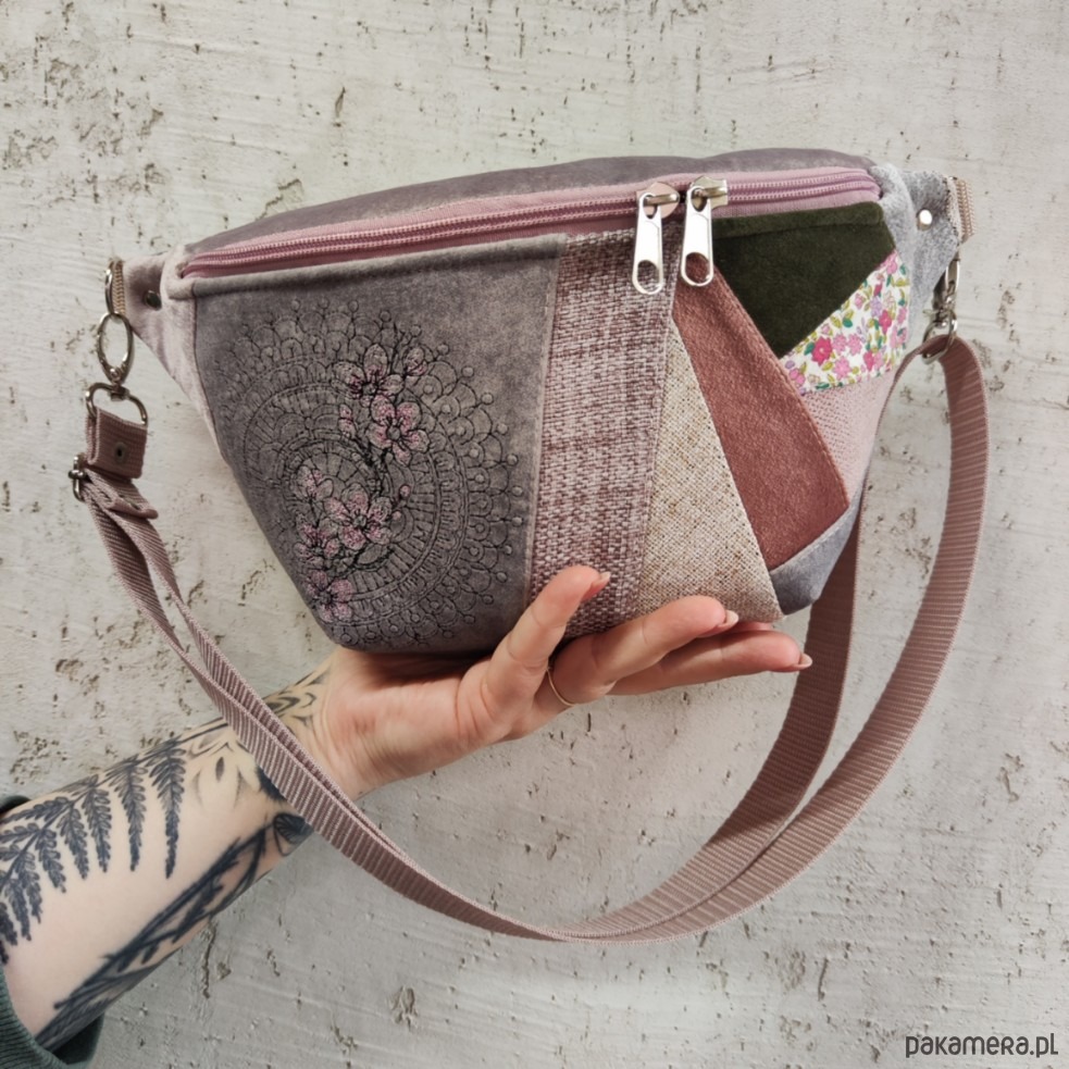 Nerka uszyta z końcówek tkanin, żeby nie marnować, w duchu zero waste. Na przodzie ozdobiona unikatowym haftem sakura- kwiaty wiśni. W komplecie regulowany pasek nośny z możliwością wymiany (nerka posiada po bokach 2 metalowe półkola, które umożliwiają szybkie zapinanie/ wymianę paska np. na inny kolor). Wymiary: 32cmx18cmx7cm(klapa) .W środku kieszonka w formie przegródki na tylnej ściance. Obwód paska wraz z nerką ma wymiary: minimum 95cm obwód, max 140cm obwód (jeśli interesuje Cię inny obwód lub inny kolor paska napisz do mnie wiadomość).
