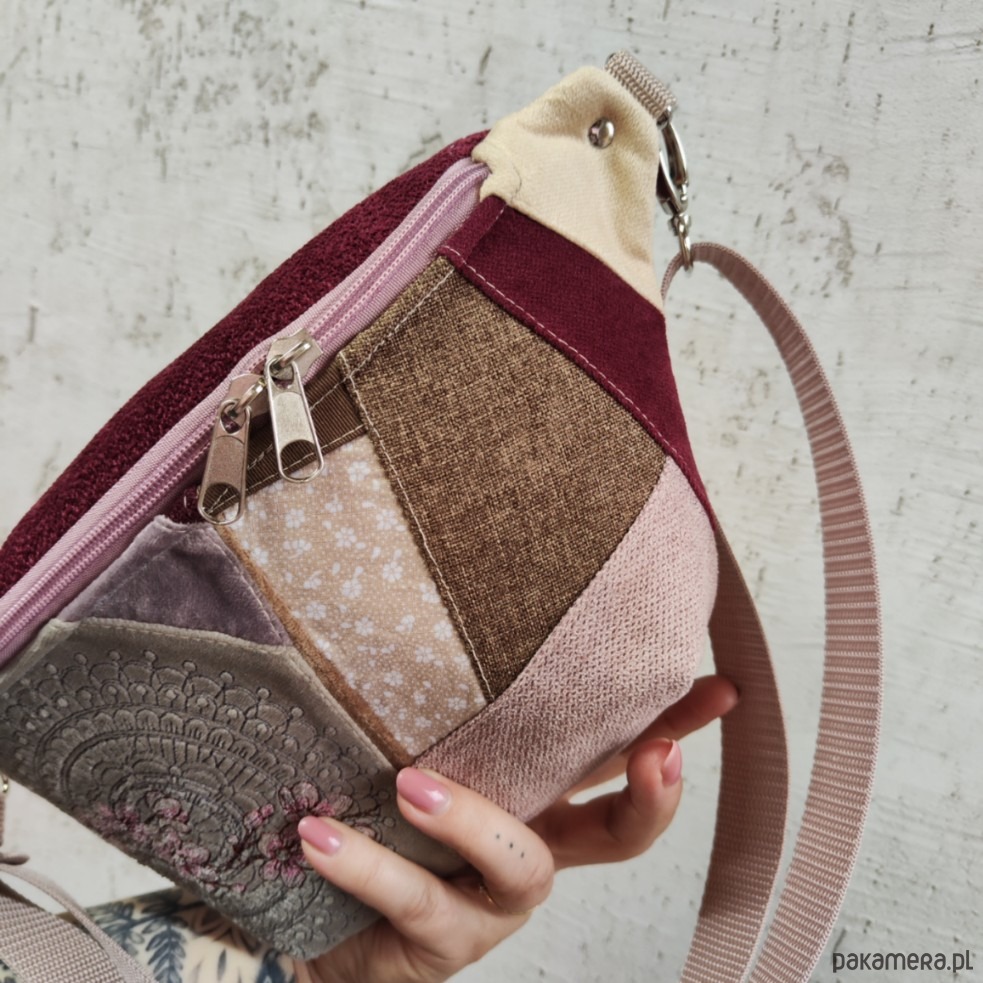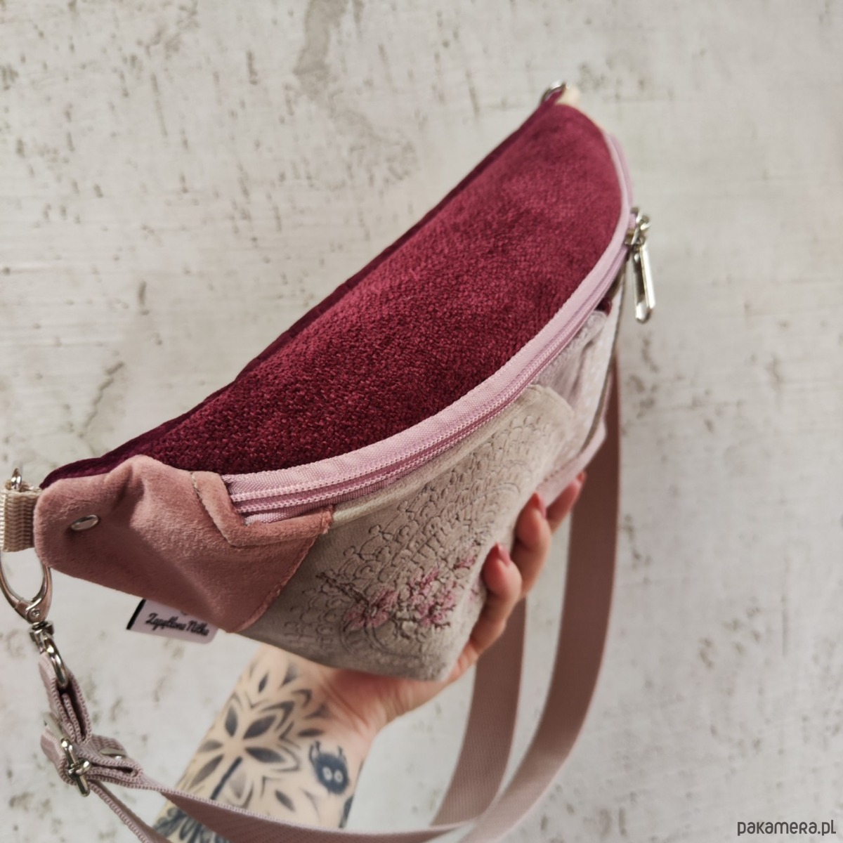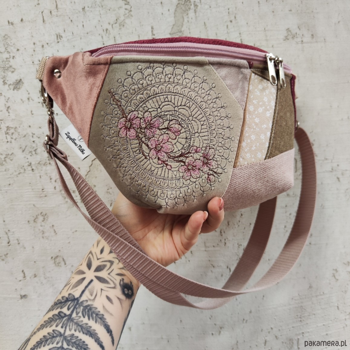 Nerka uszyta z końcówek tkanin, żeby nie marnować, w duchu zero waste. Na przodzie ozdobiona unikatowym haftem sakura- kwiaty wiśni. W komplecie regulowany pasek nośny z możliwością wymiany (nerka posiada po bokach 2 metalowe półkola, które umożliwiają szybkie zapinanie/ wymianę paska np. na inny kolor). Wymiary: 32cmx18cmx7cm(klapa) .W środku kieszonka w formie przegródki na tylnej ściance. Obwód paska wraz z nerką ma wymiary: minimum 95cm obwód, max 140cm obwód (jeśli interesuje Cię inny obwód lub inny kolor paska napisz do mnie wiadomość).